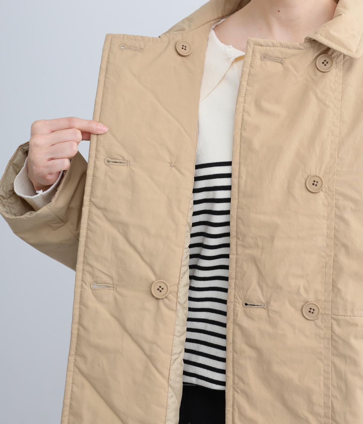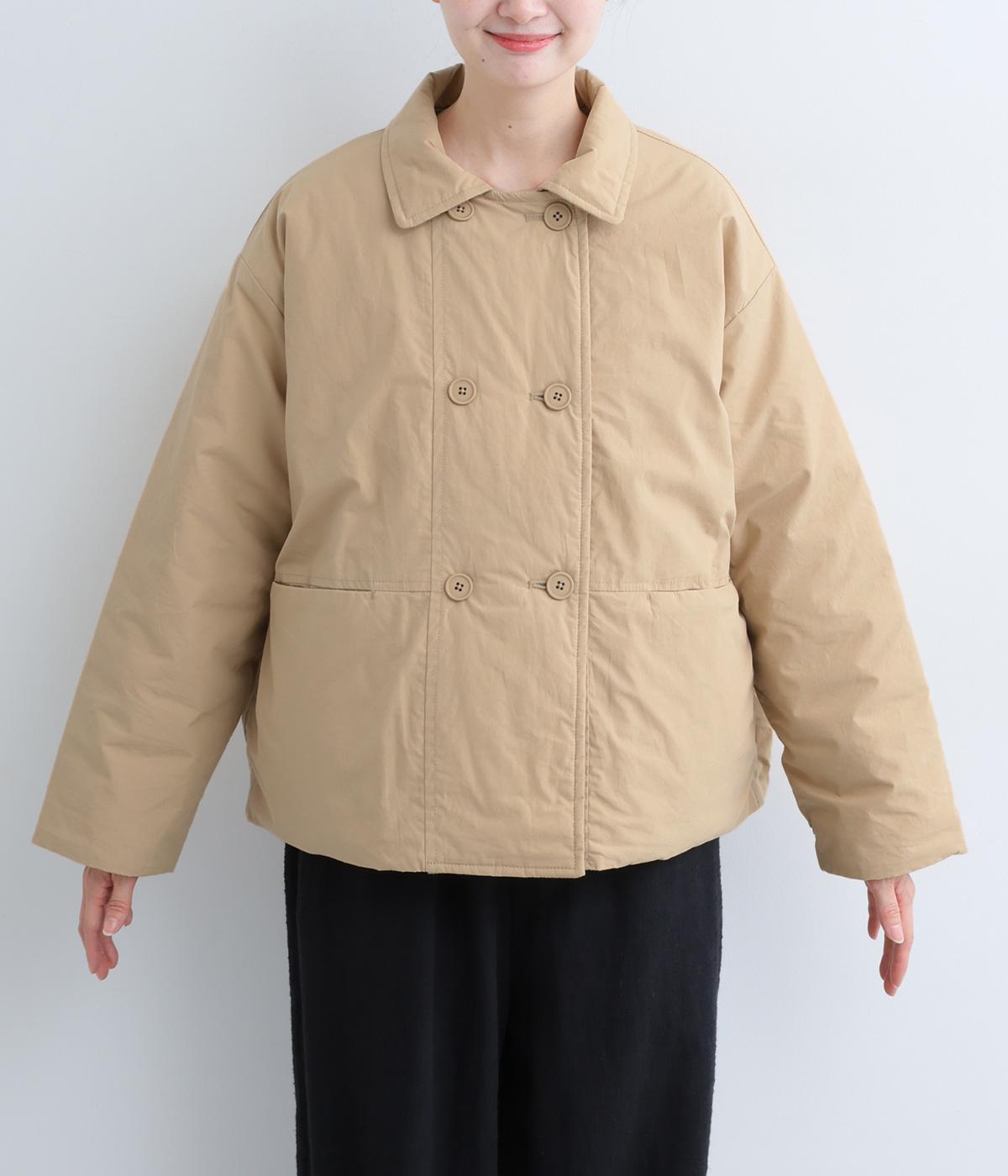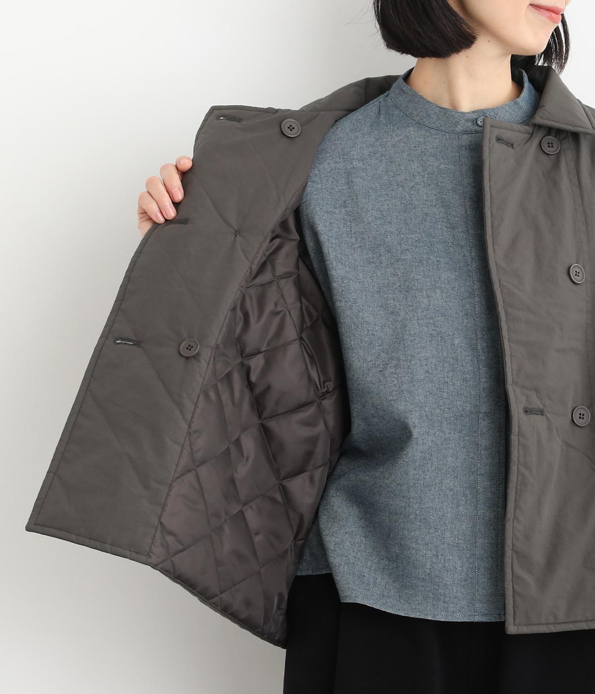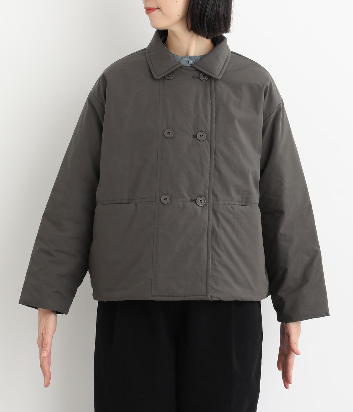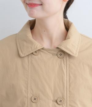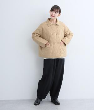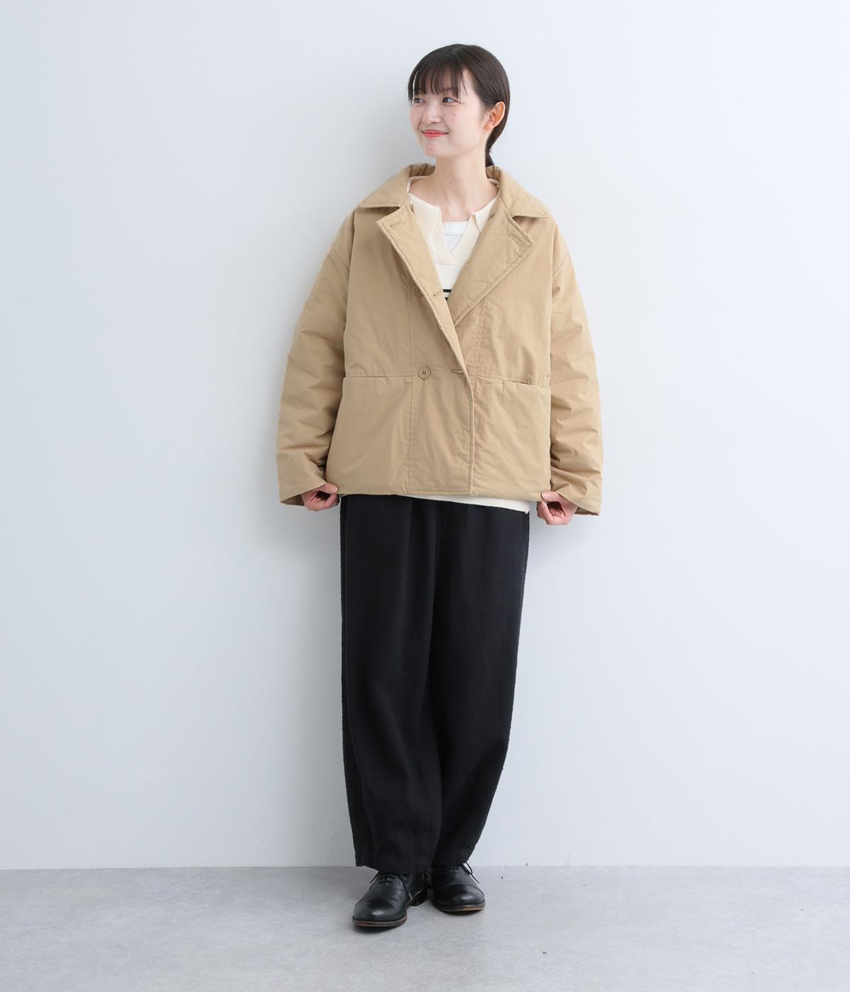 きちんと感のあるダブルボタン仕様とシンプルなデザインで、カジュアルさをおさえた中綿入りジャケットです。さまざまなボトムスにバランスよく合わせやすいコンパクトな着丈が魅力。第一ボタンを外してオープンカラーのように着こなすのもおすすめです。