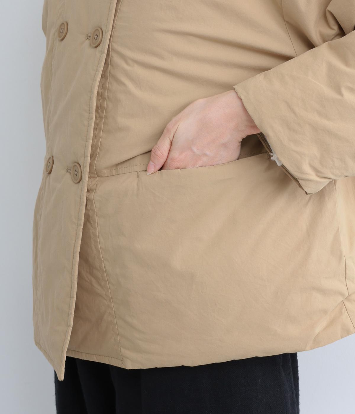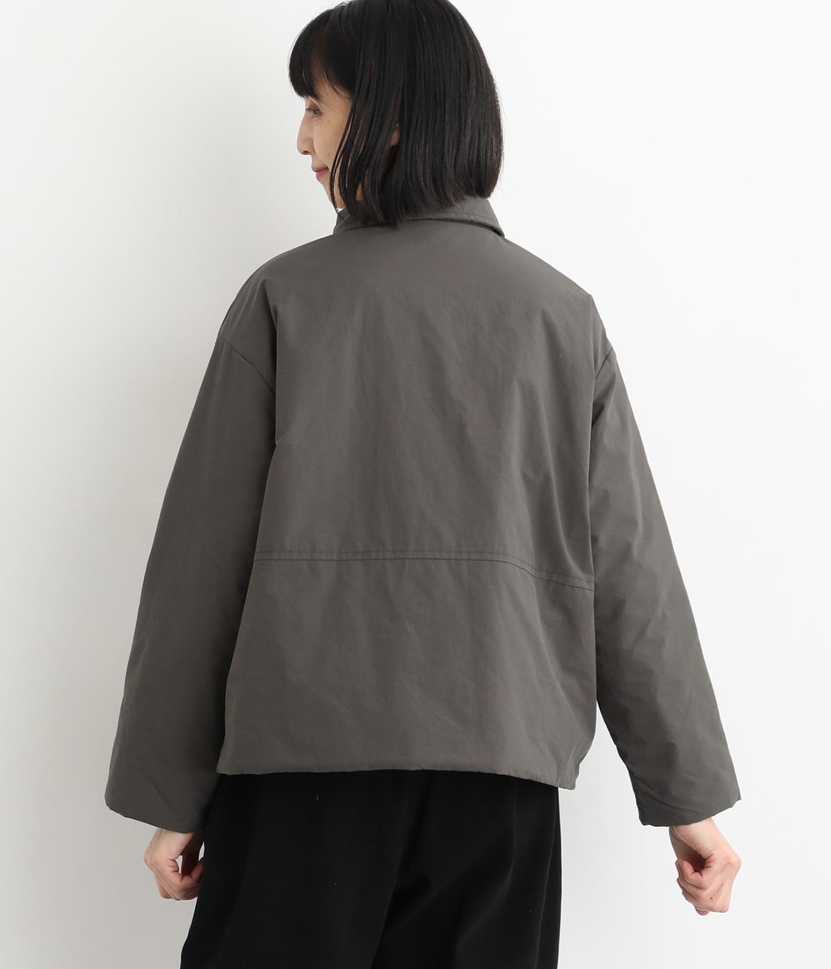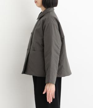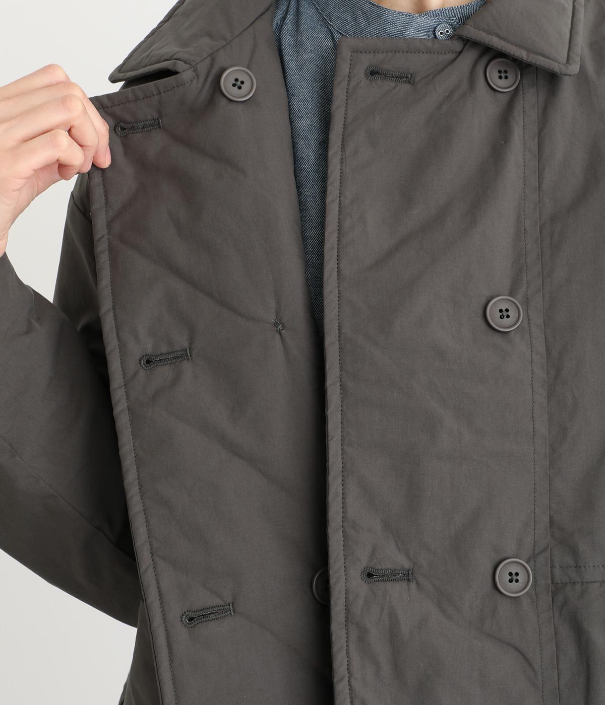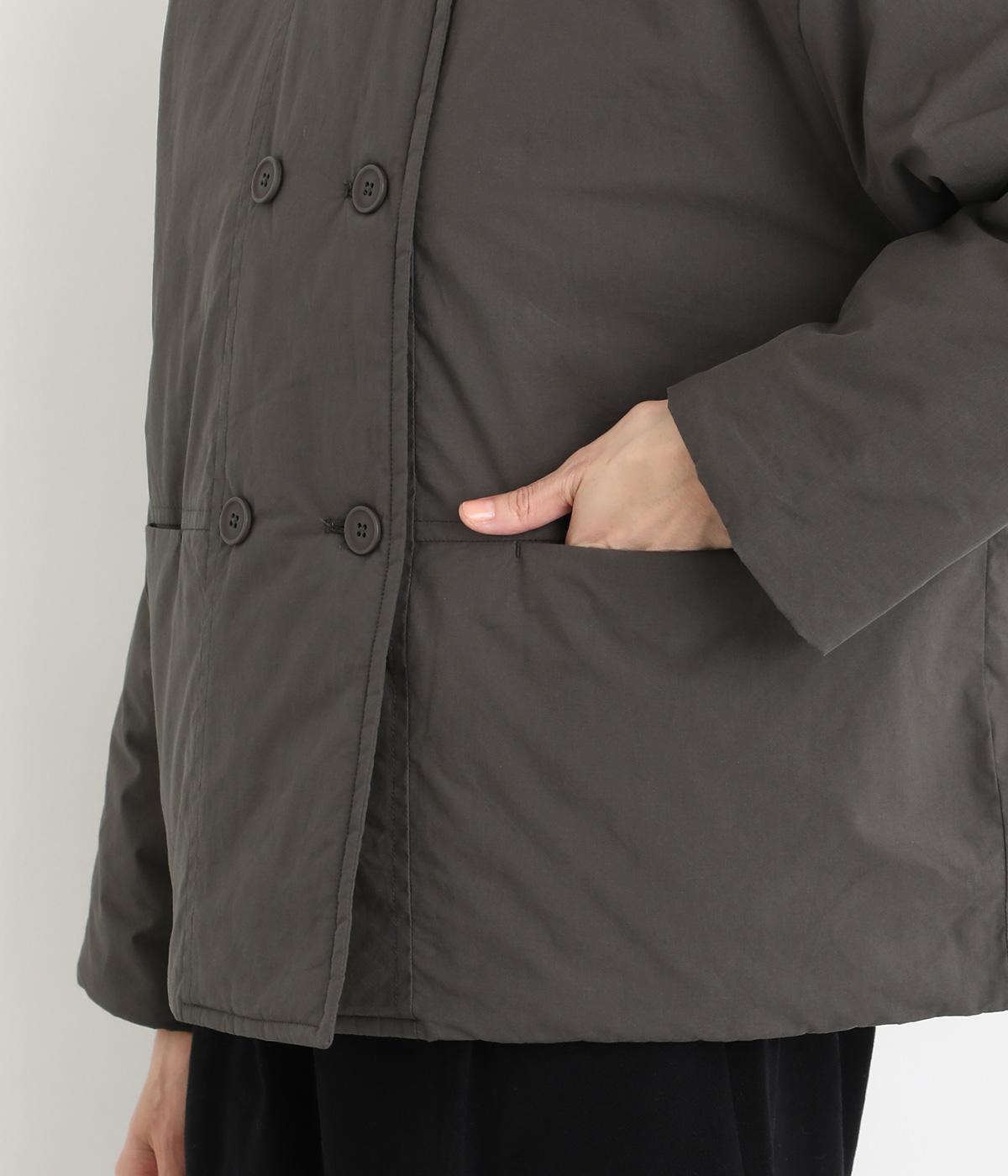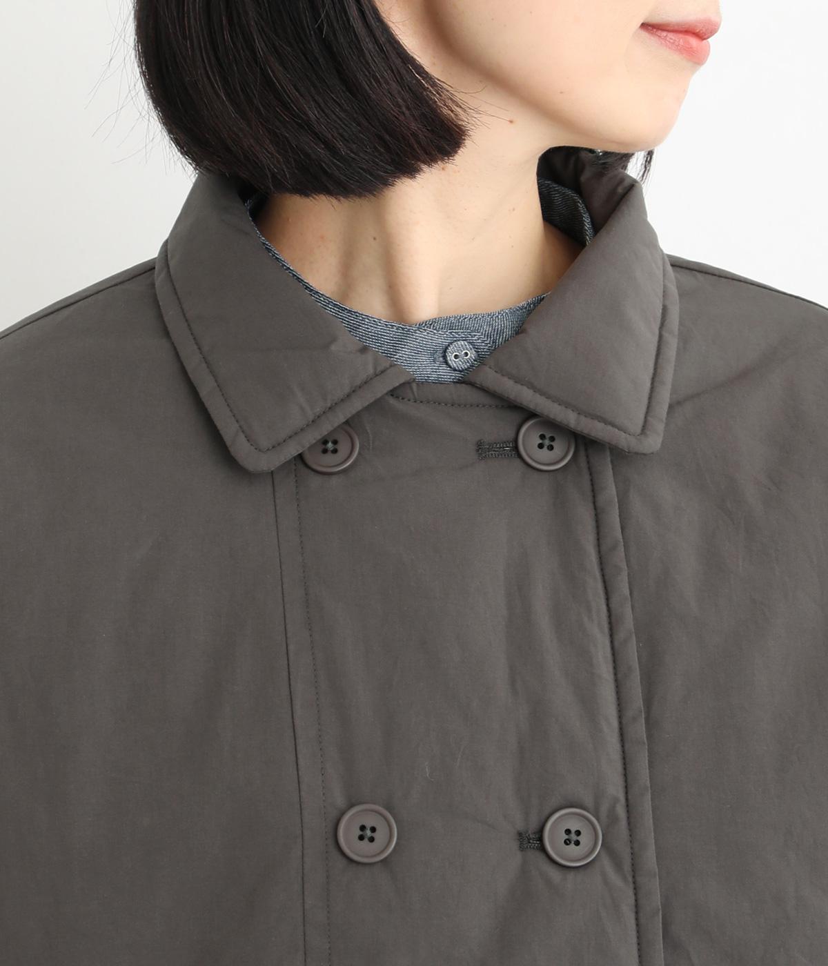 きちんと感のあるダブルボタン仕様とシンプルなデザインで、カジュアルさをおさえた中綿入りジャケットです。さまざまなボトムスにバランスよく合わせやすいコンパクトな着丈が魅力。第一ボタンを外してオープンカラーのように着こなすのもおすすめです。