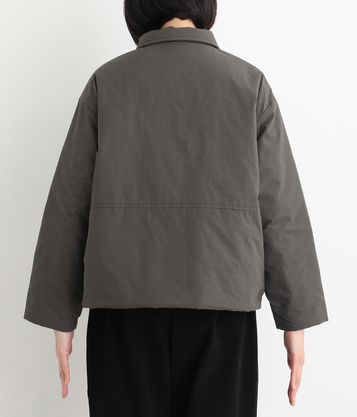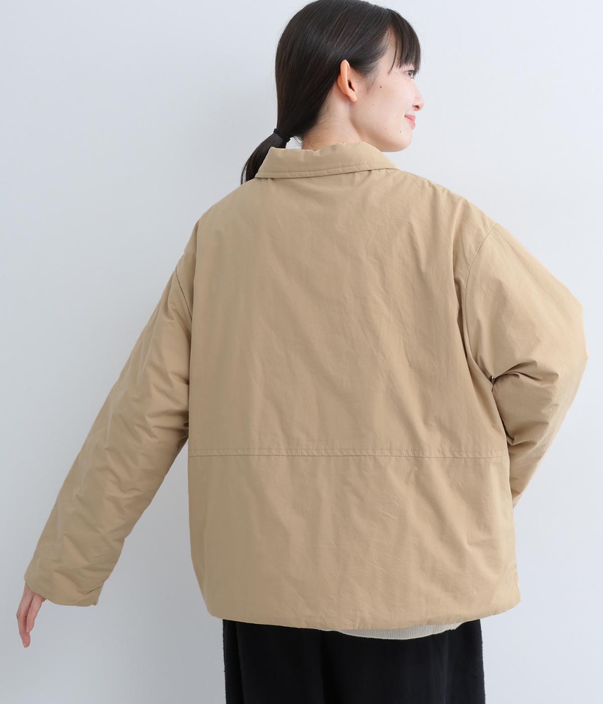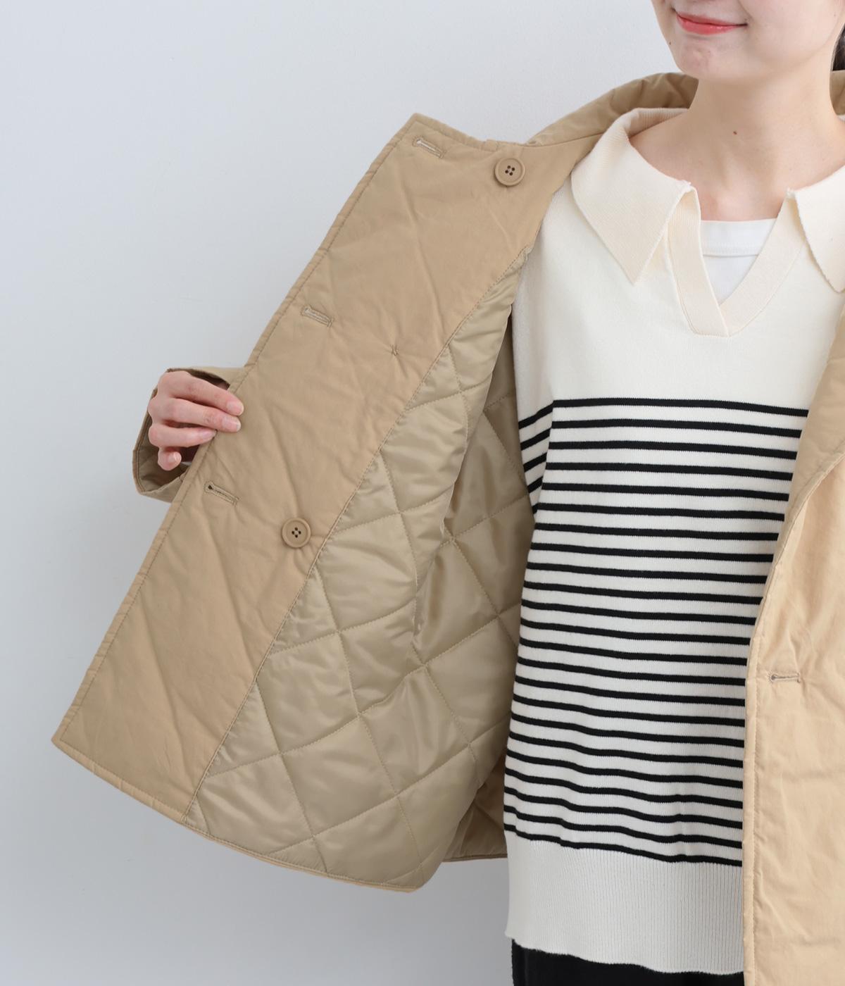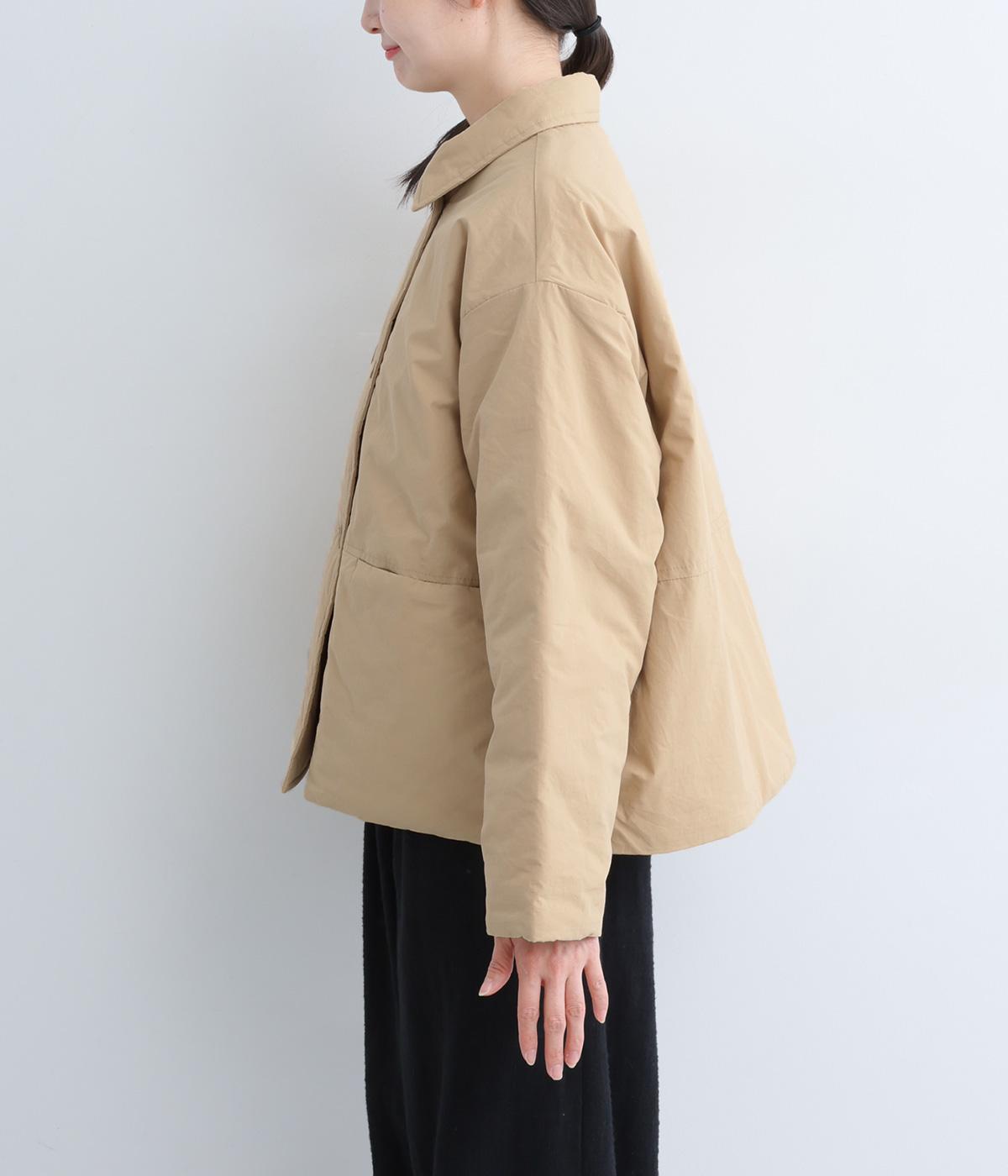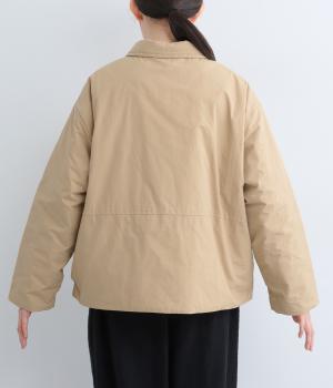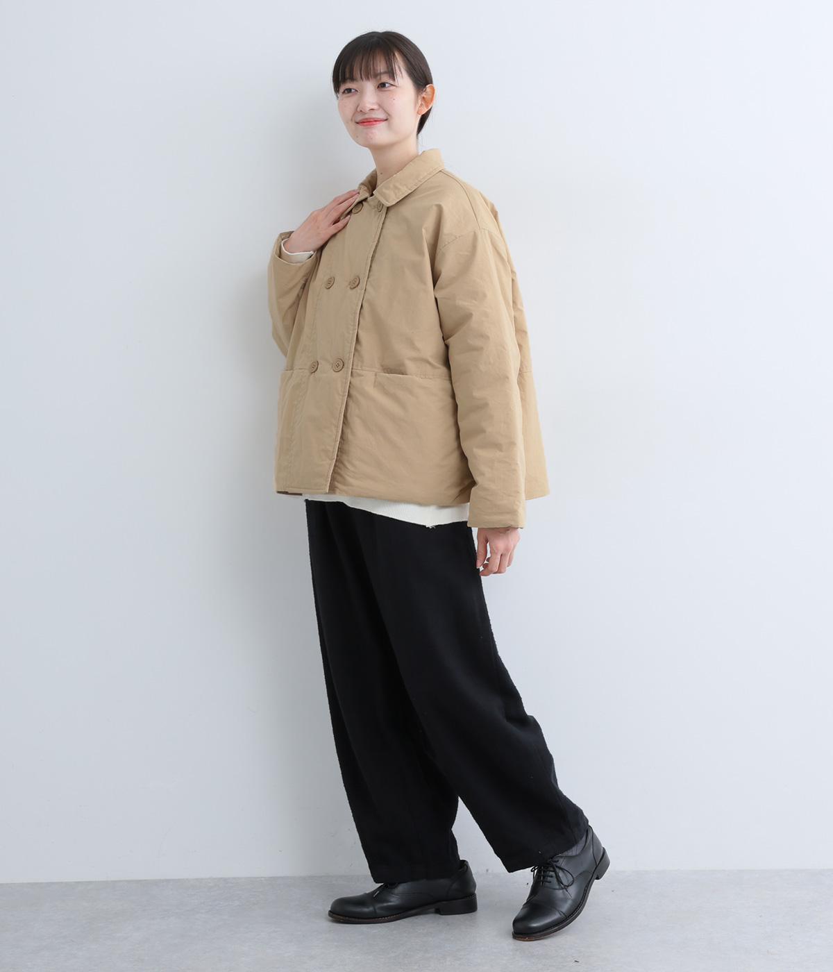 きちんと感のあるダブルボタン仕様とシンプルなデザインで、カジュアルさをおさえた中綿入りジャケットです。さまざまなボトムスにバランスよく合わせやすいコンパクトな着丈が魅力。第一ボタンを外してオープンカラーのように着こなすのもおすすめです。