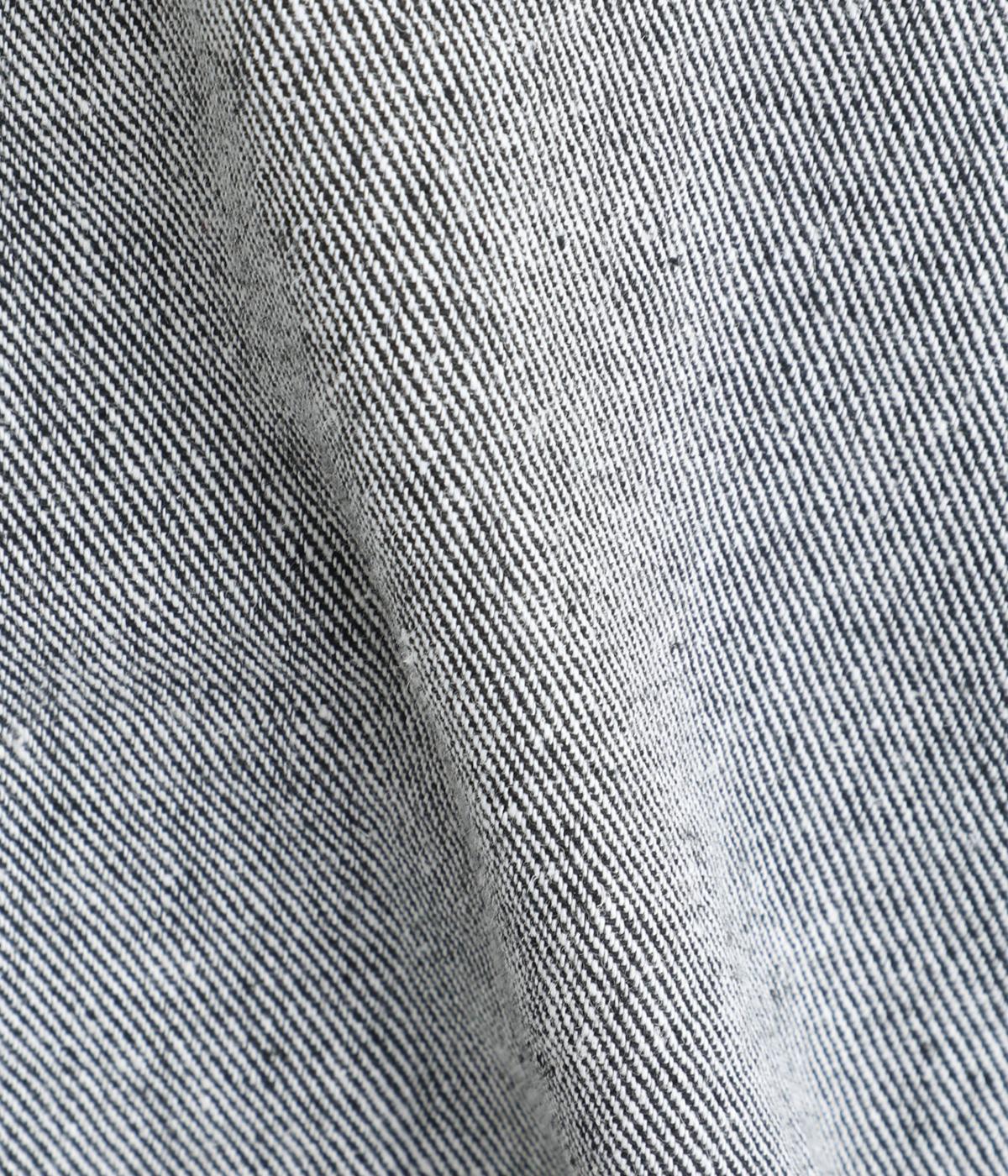 コットンのやわらかな肌ざわりに、リネンのほどよいハリを合わせた生地です。綾織り特有のななめに走る畝が、さりげない表情を添えています。しなやかでシワになりにくく、デイリー使いにうれしい軽やかな質感です。