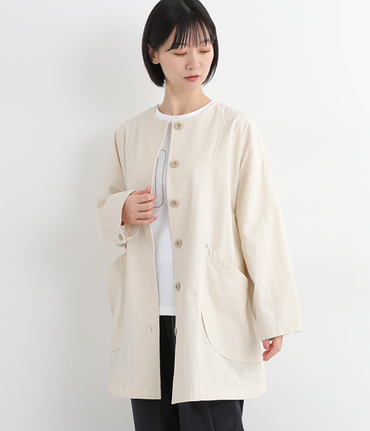 しっかりとした風合いのコットン綾織素材で仕立てています。カジュアルにサッと合わせられるのが◎。裏地がない分、アウターながら軽やかに着用できるのが高ポイント。