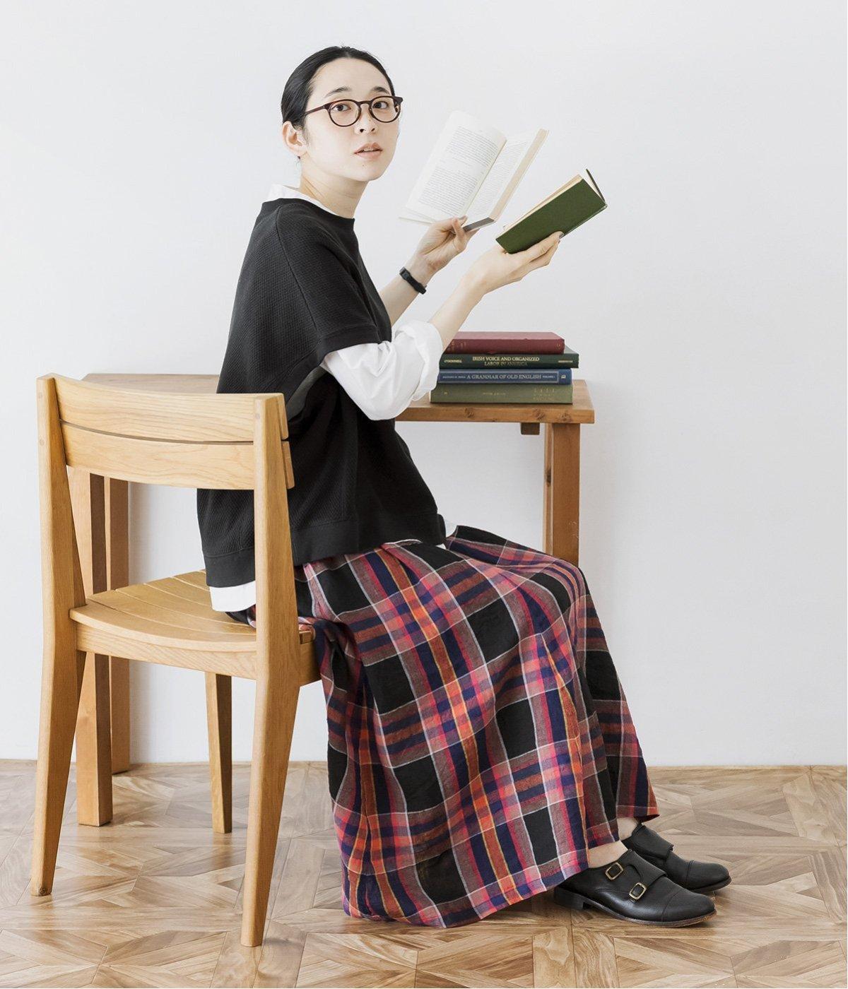 季節が進んだら長袖を重ねて、秋らしいコーディネートも。<ブラック>にシャツやチェック柄スカートを合わせて、可愛らしさときちんと感のあるスクールガール風に仕上げました。