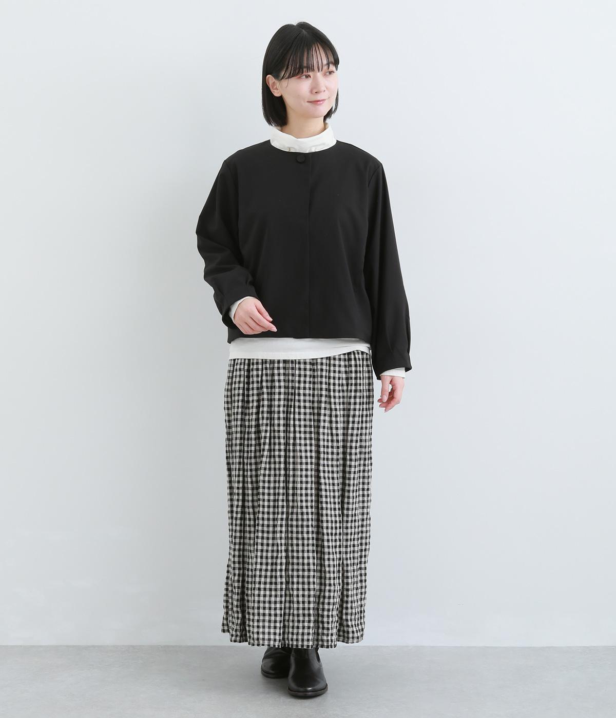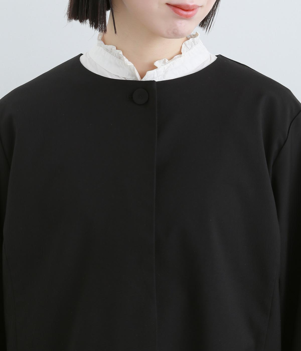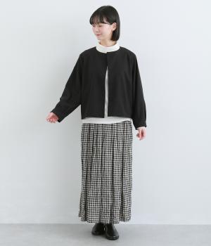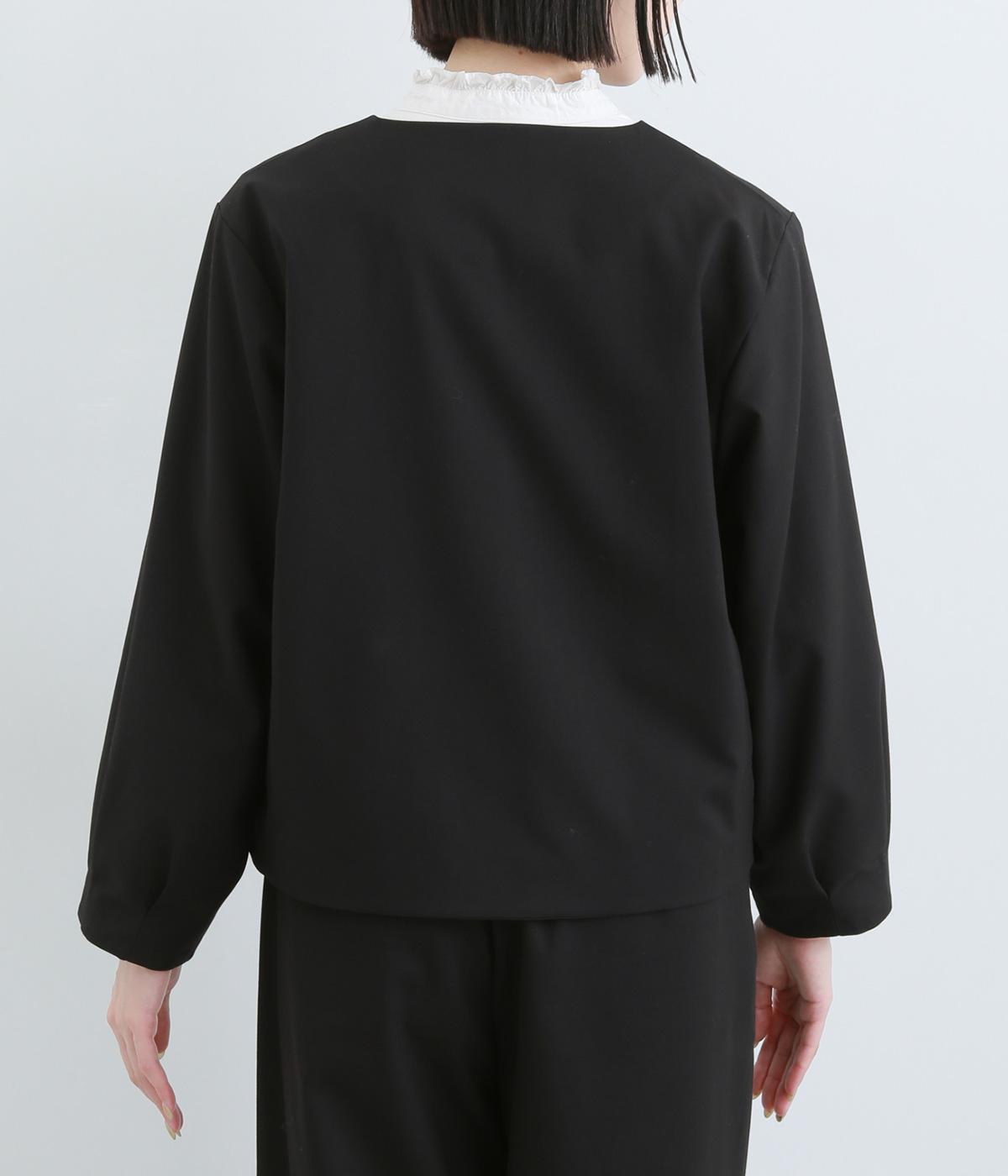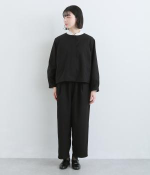 第二ボタンから比翼仕立てにした前開きがすっきりとした印象をもたらします。袖先にタックをほどこしたバルーンスリーブがふんわりと女性らしさをプラス。デイリーにもフォーマルにも活躍する一枚です。