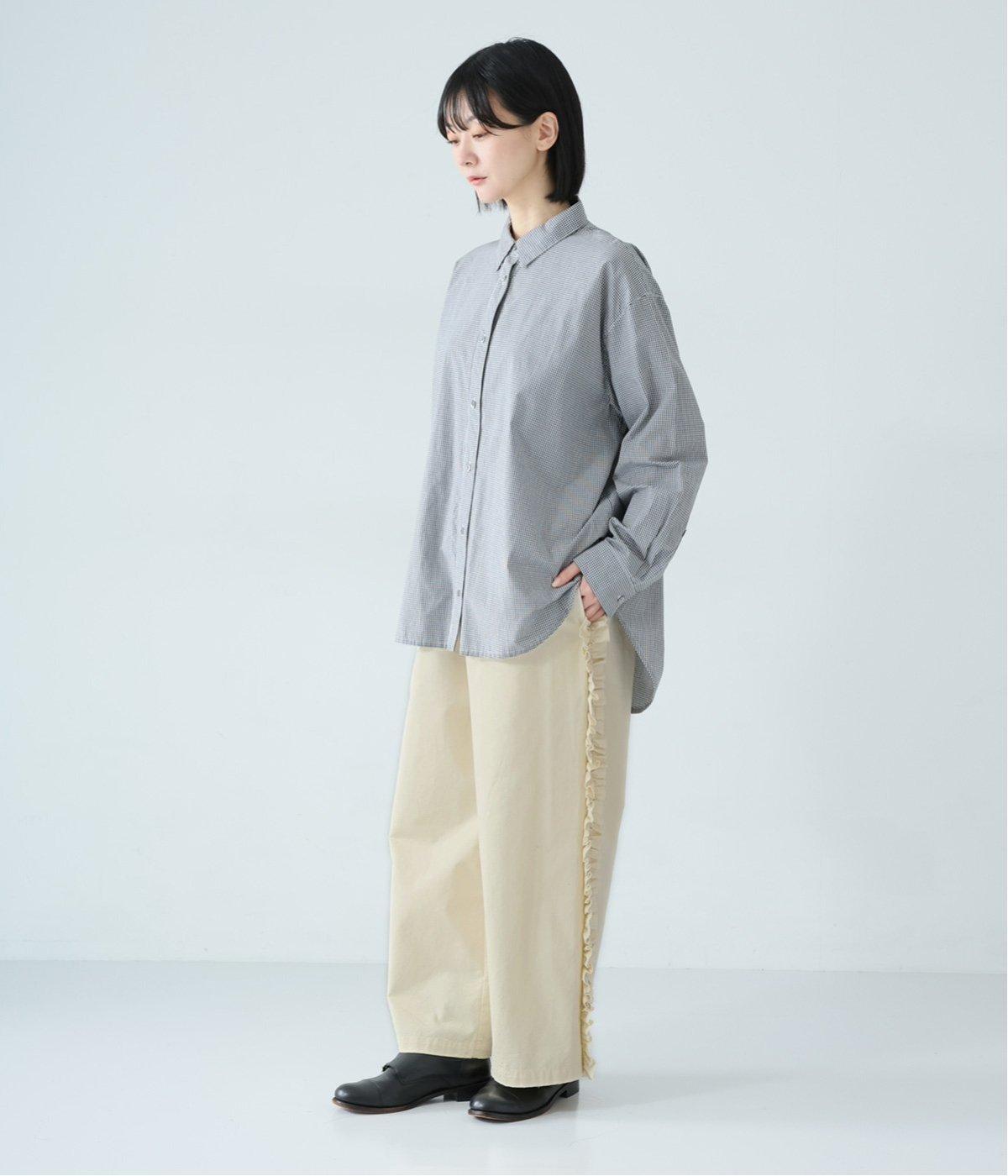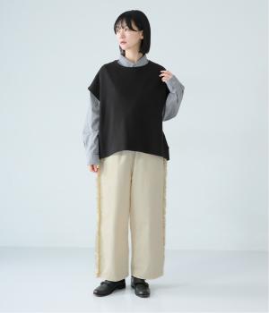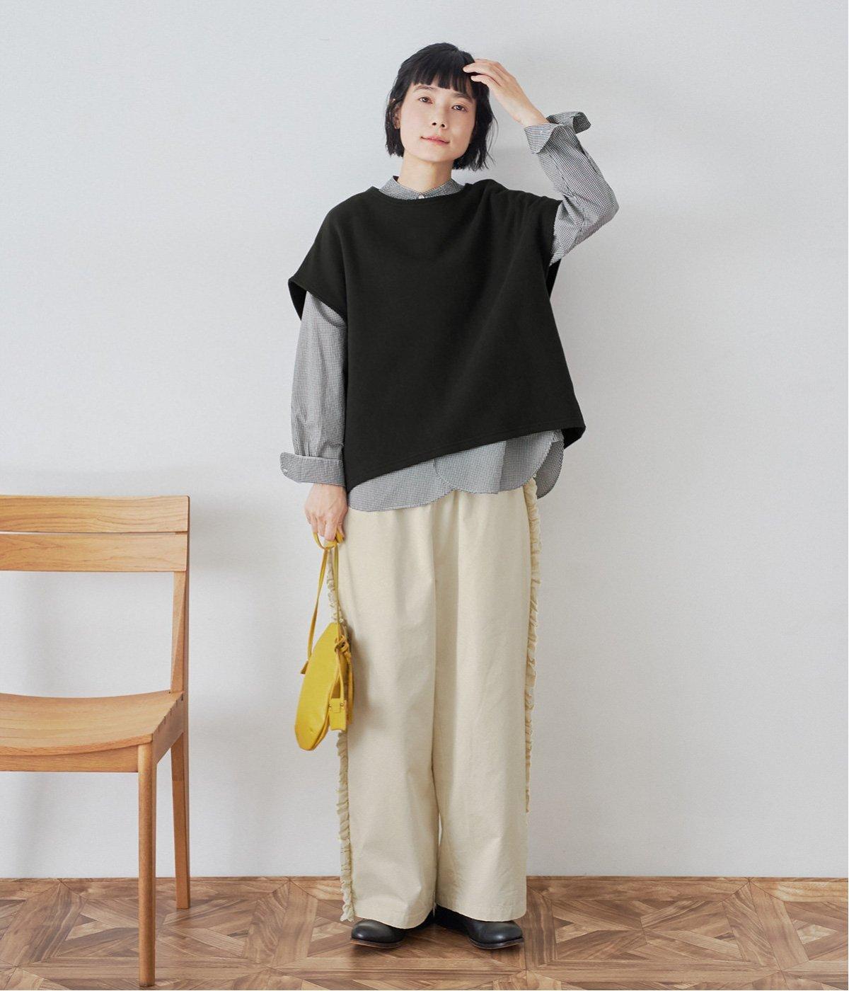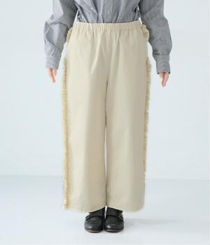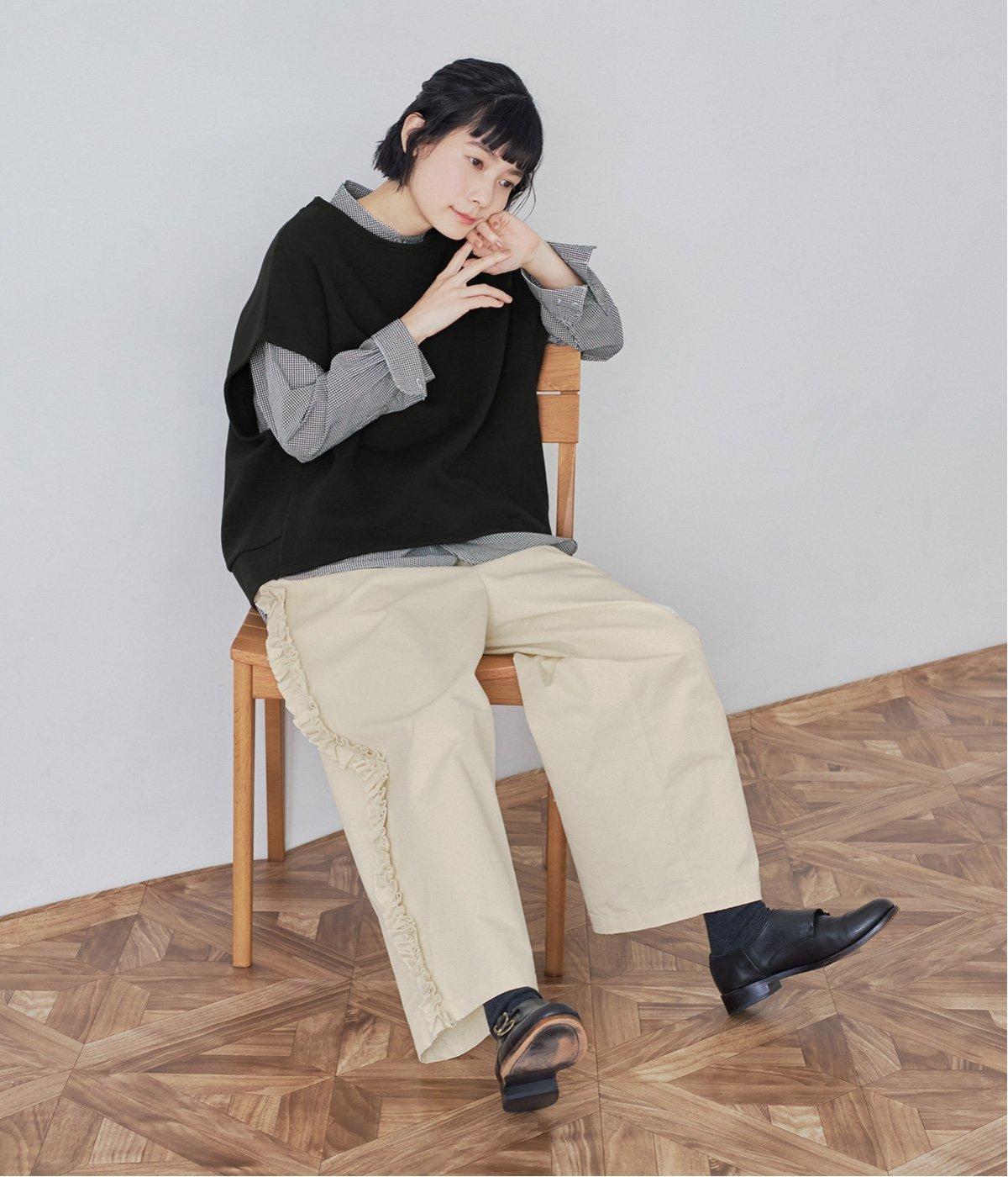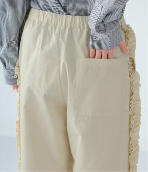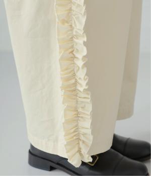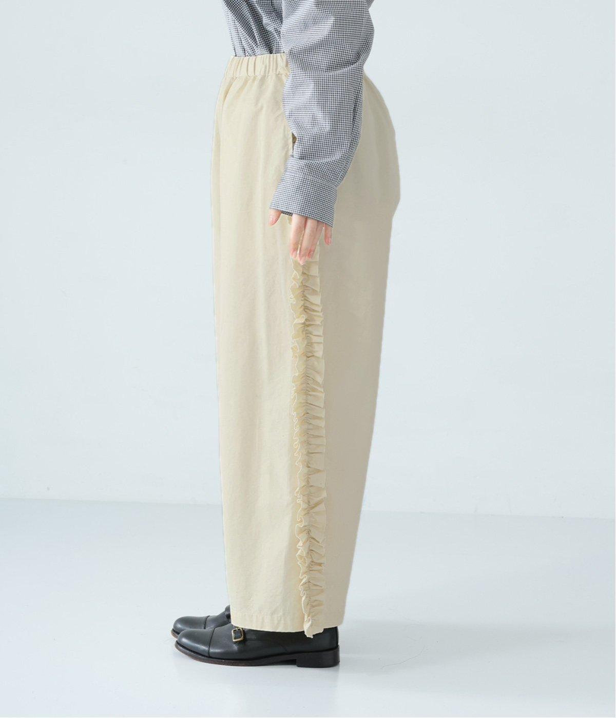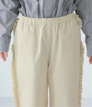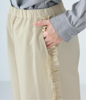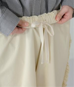 サイドラインに立体感のあるフリルを施しました。歩くたびに揺れて、さりげない華やかさを演出。甘すぎないデザインなので、大人の女性でも取り入れやすいのが魅力です。総ゴム仕様のウエストには内紐をプラスしています。