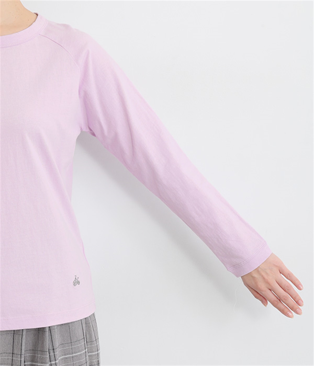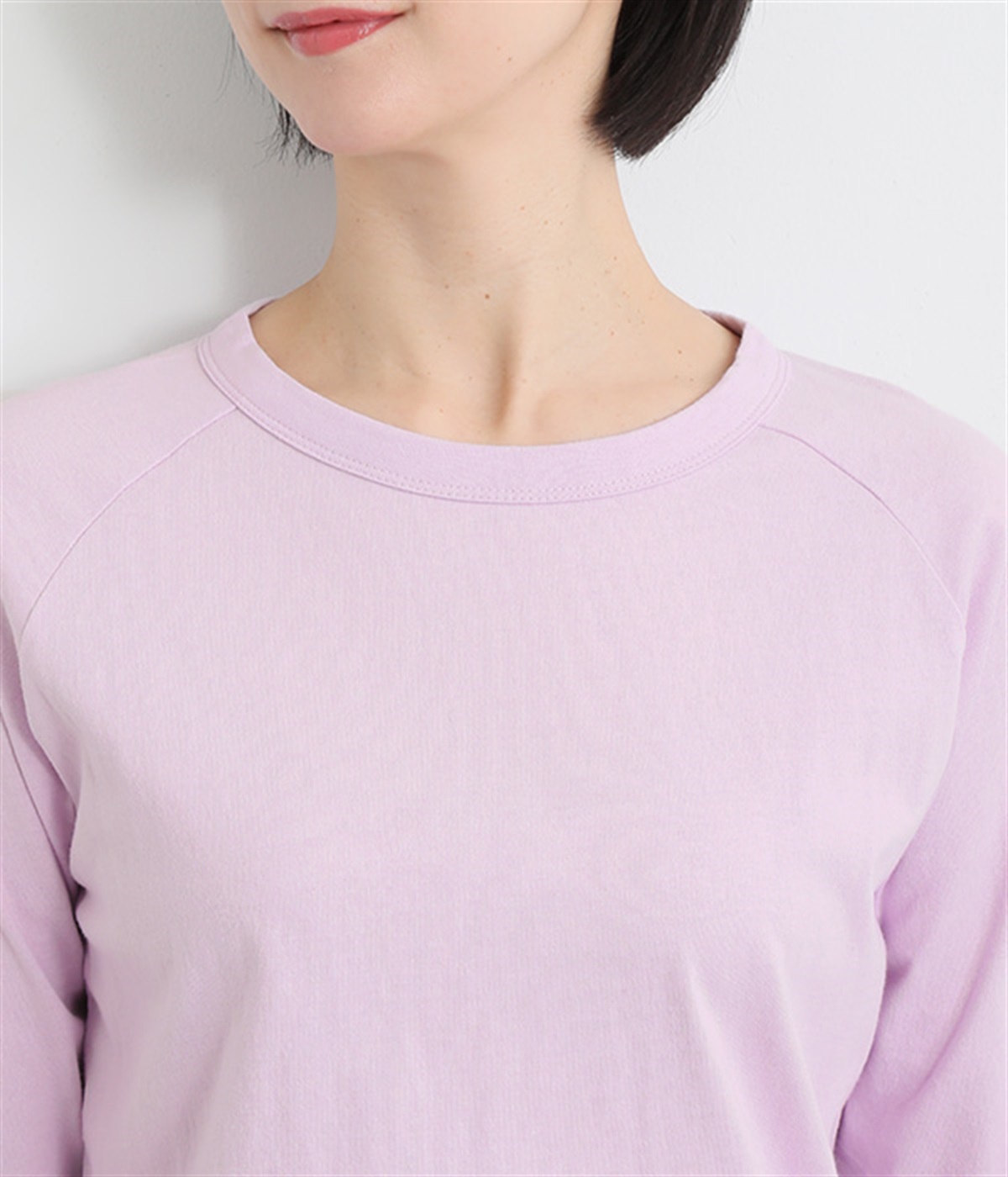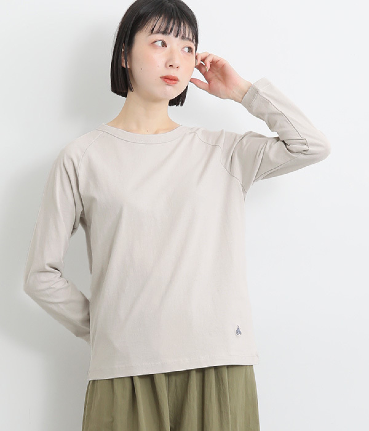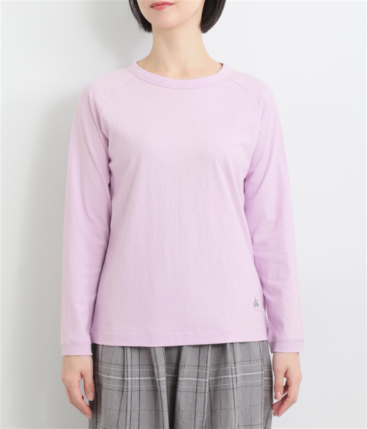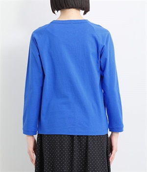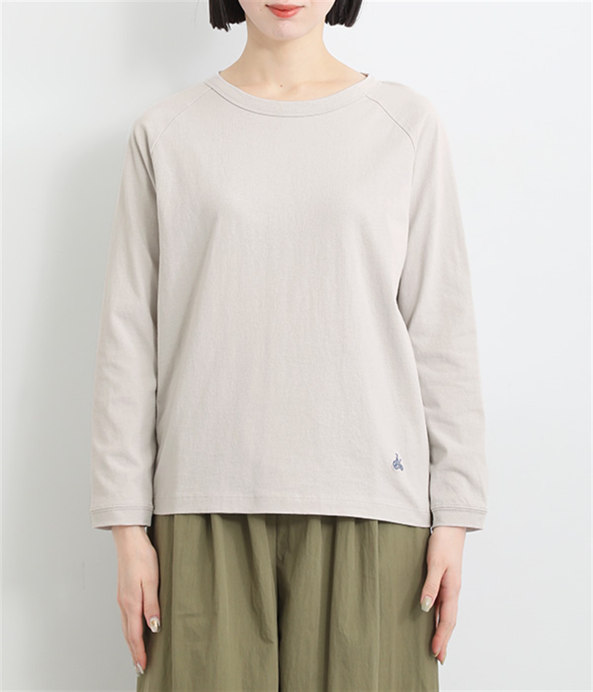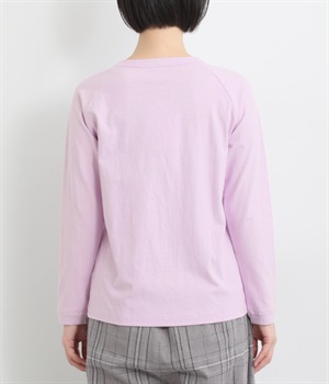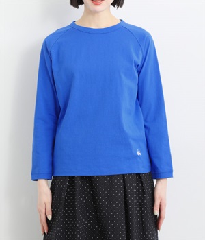 インナー使いでも着ぶくれしにくい、大きすぎないレギュラーシルエット。シンプルな単色無地の素材に、左裾のワンポイント刺しゅうが映えます。肩まわりが動かしやすいラグランスリーブも嬉しいポイントです。