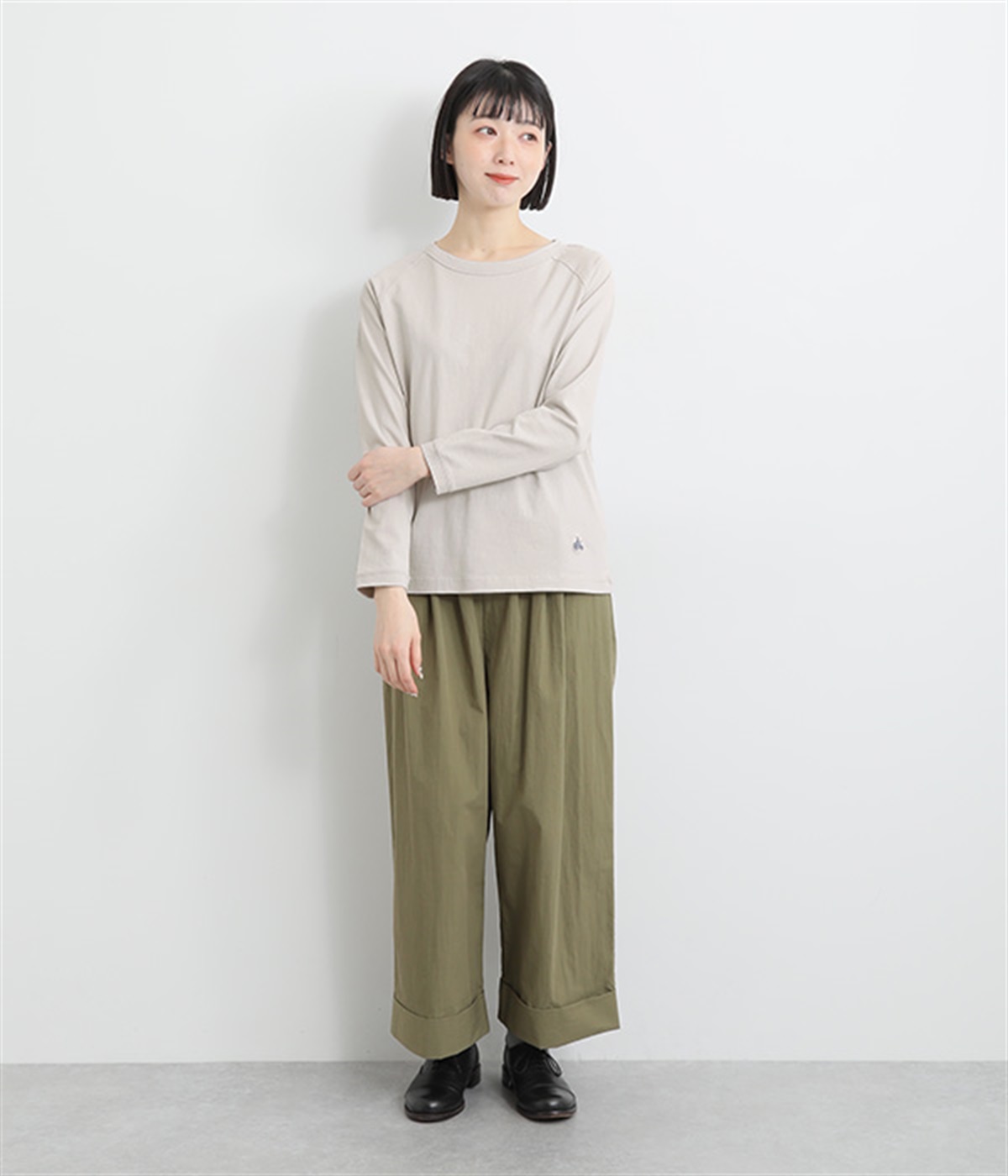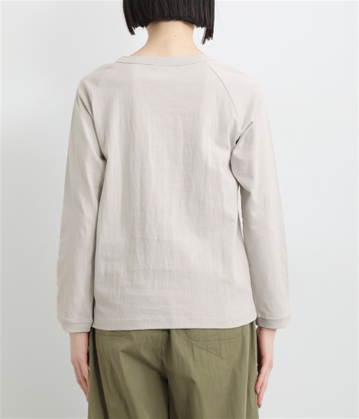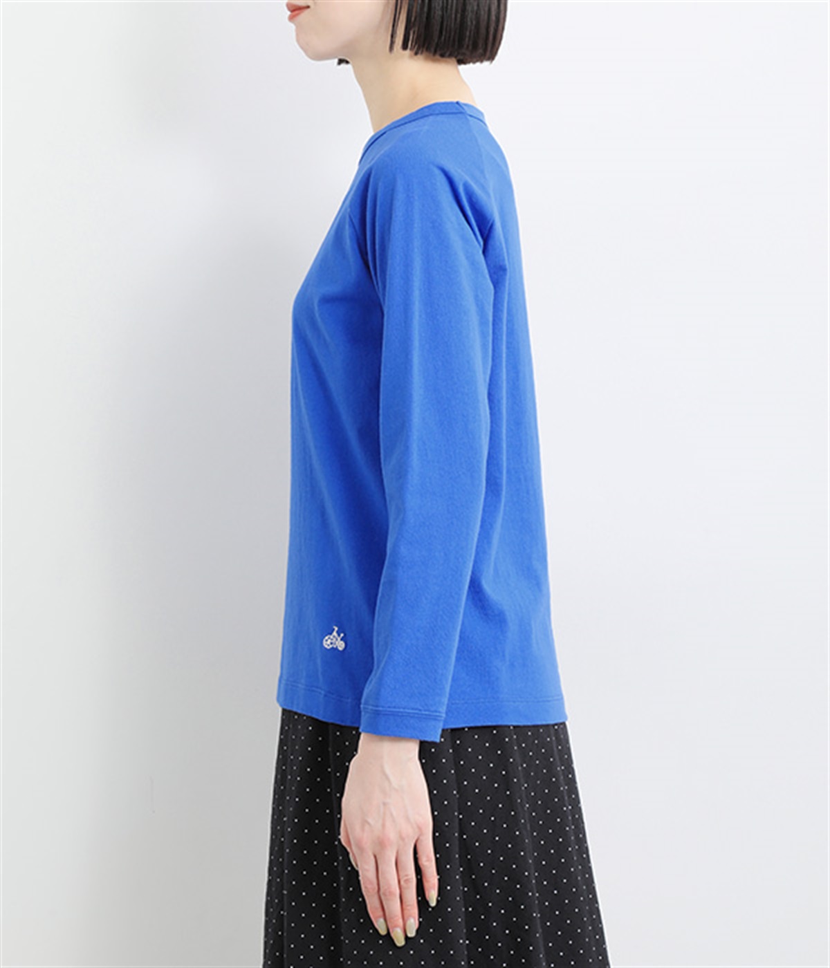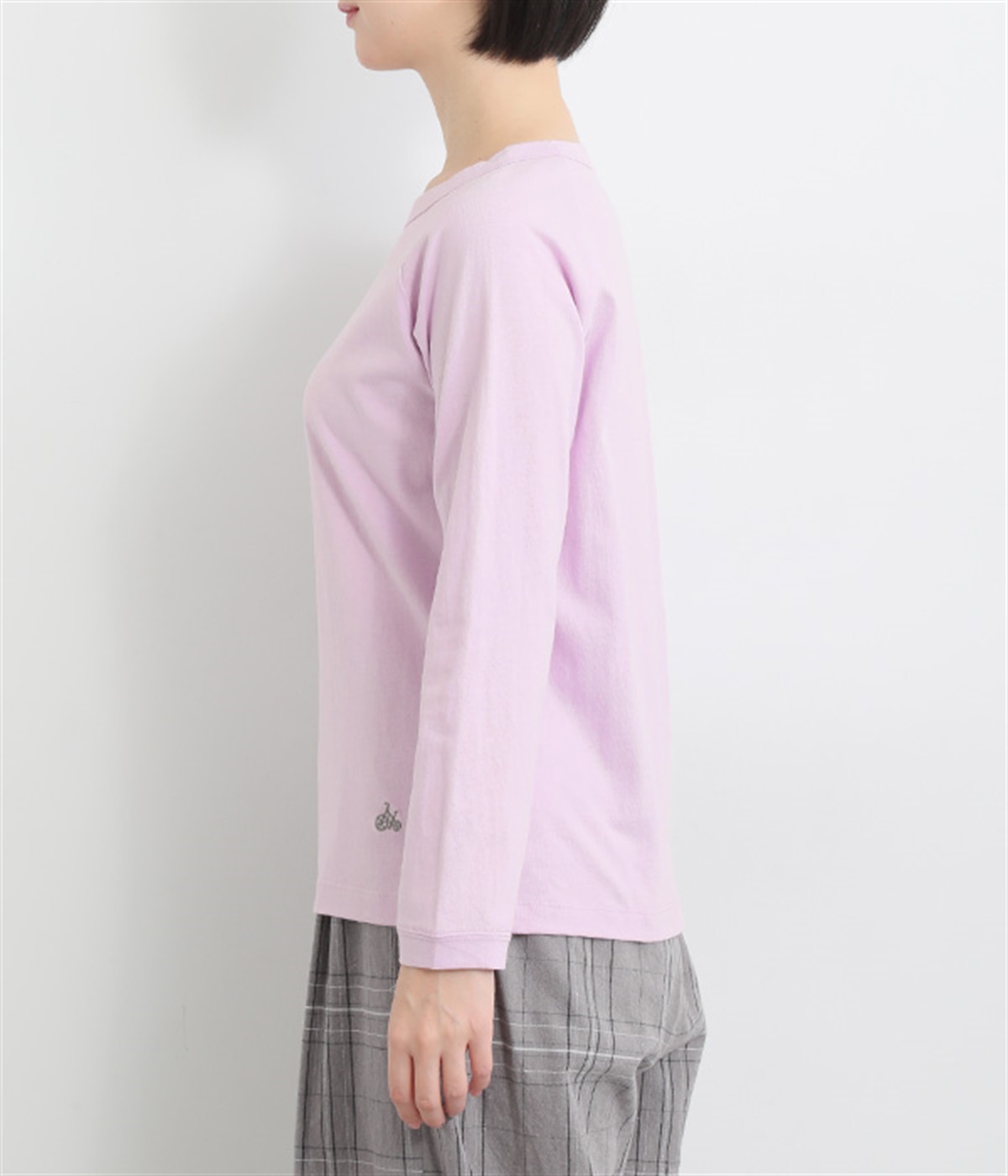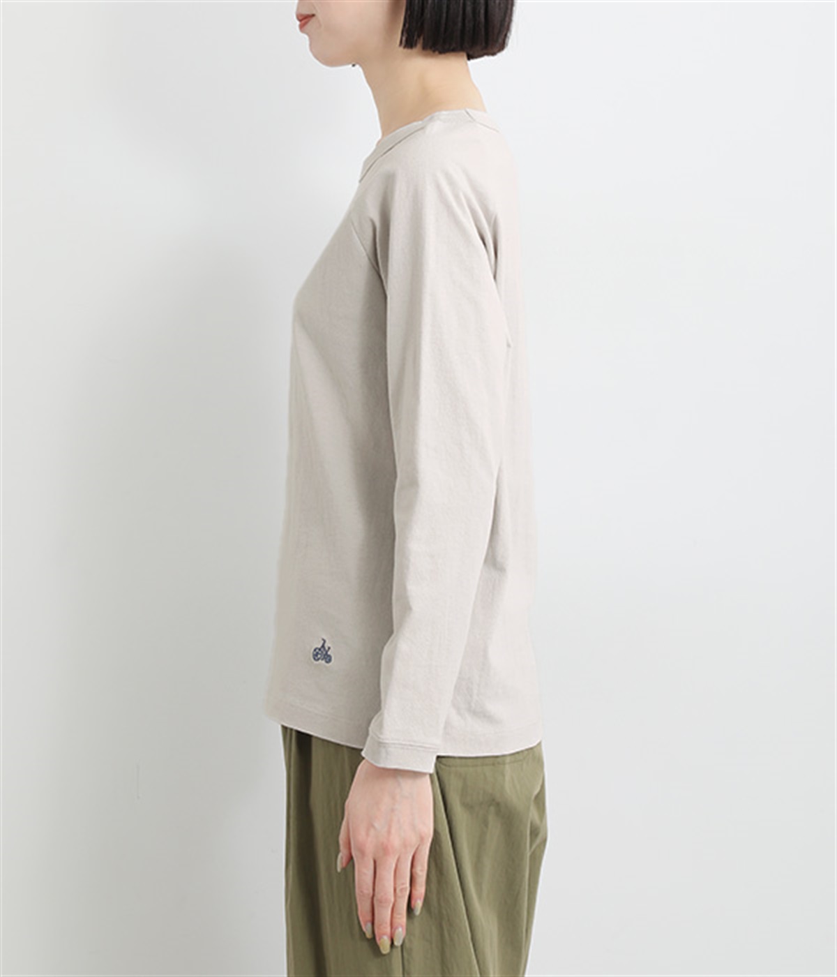 インナー使いでも着ぶくれしにくい、大きすぎないレギュラーシルエット。シンプルな単色無地の素材に、左裾のワンポイント刺しゅうが映えます。肩まわりが動かしやすいラグランスリーブも嬉しいポイントです。