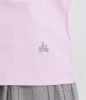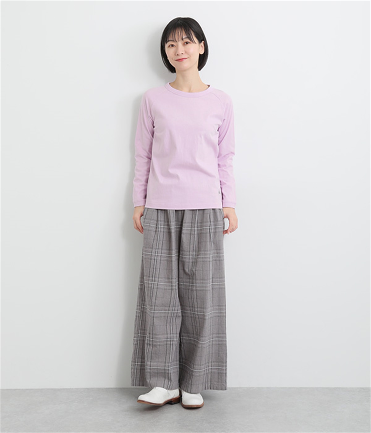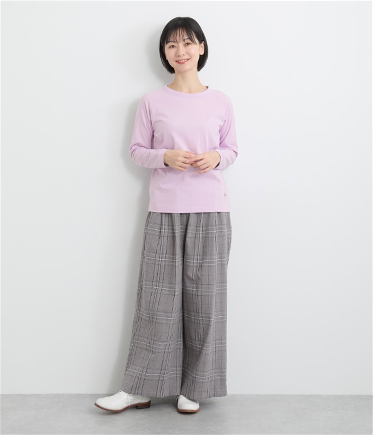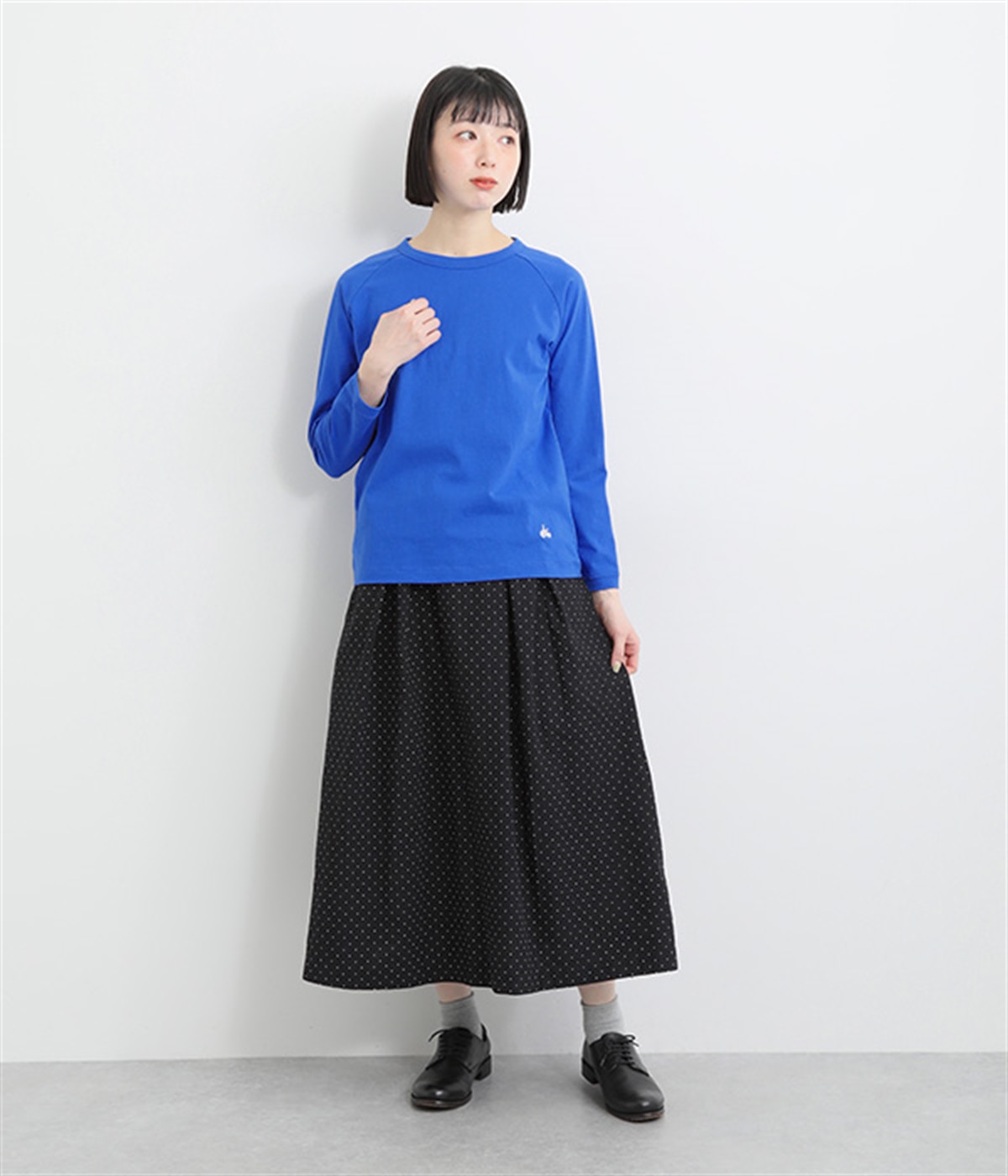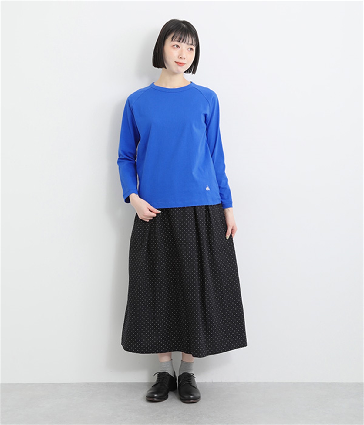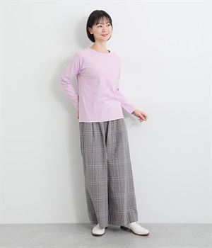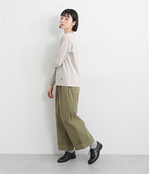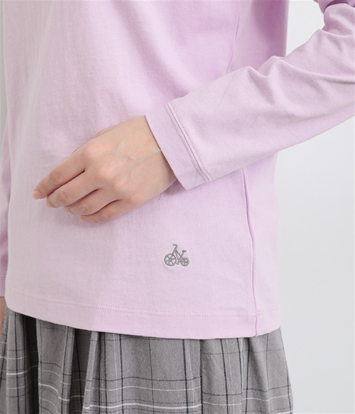 インナー使いでも着ぶくれしにくい、大きすぎないレギュラーシルエット。シンプルな単色無地の素材に、左裾のワンポイント刺しゅうが映えます。肩まわりが動かしやすいラグランスリーブも嬉しいポイントです。