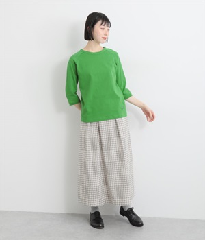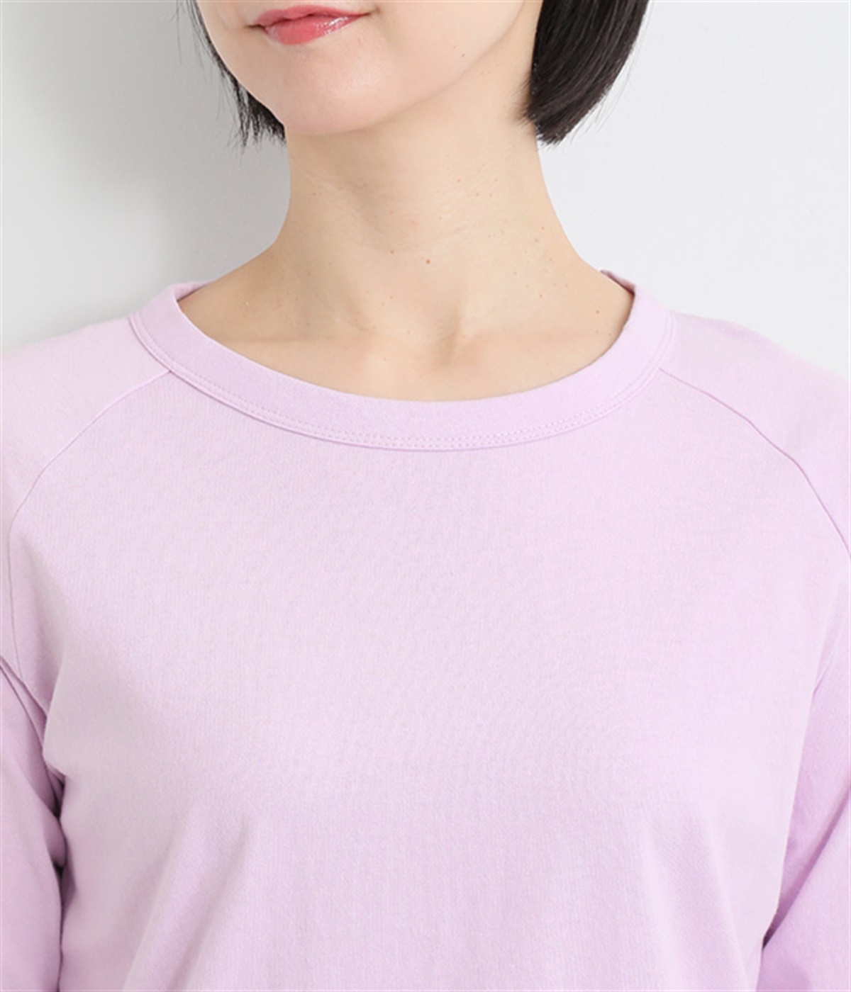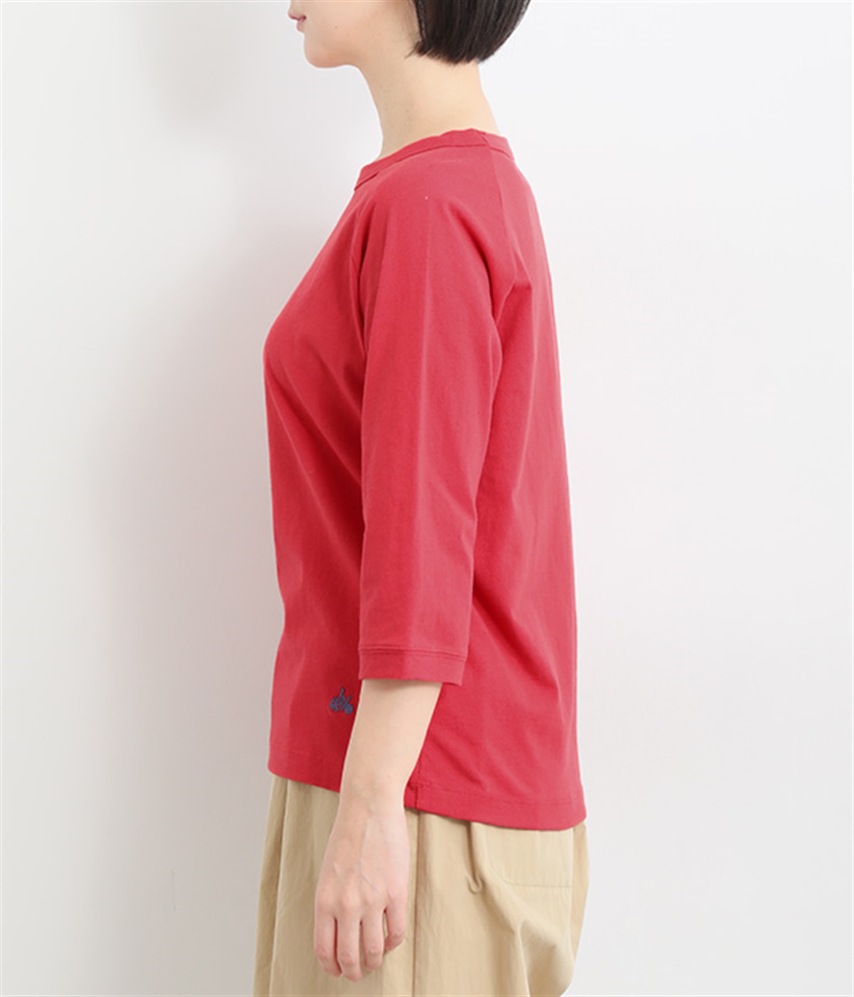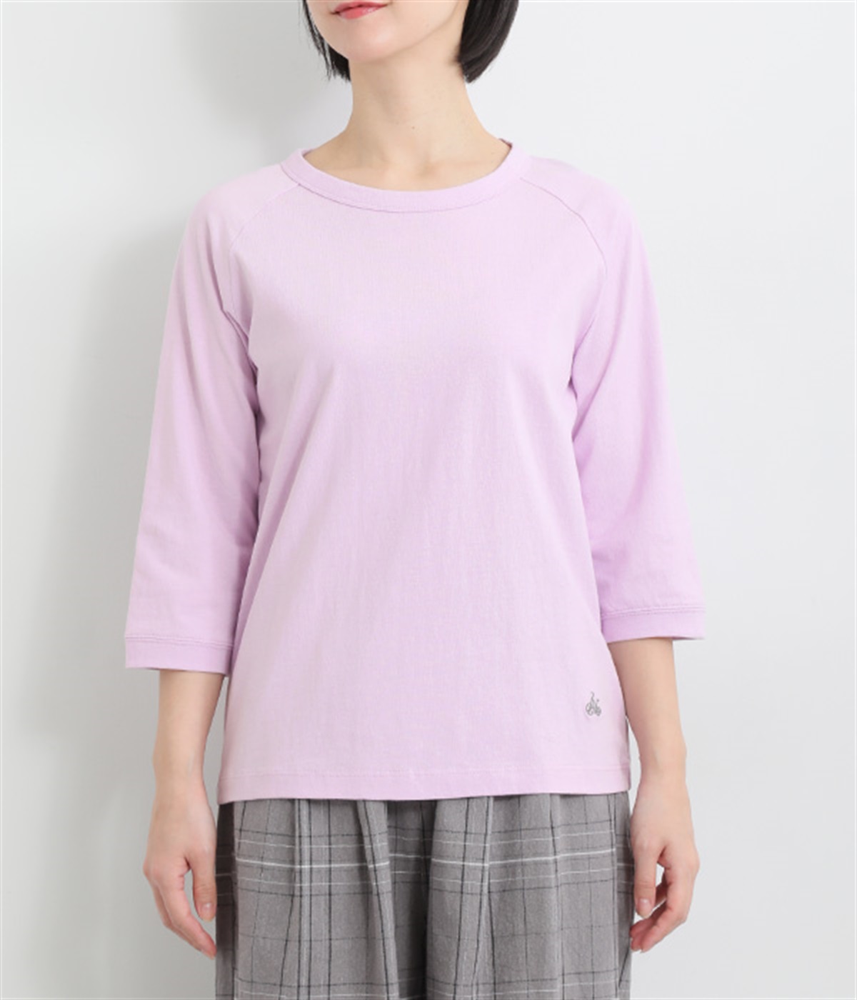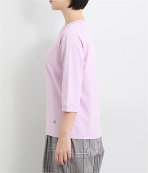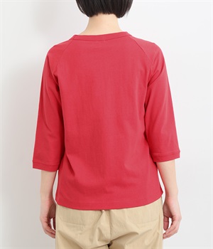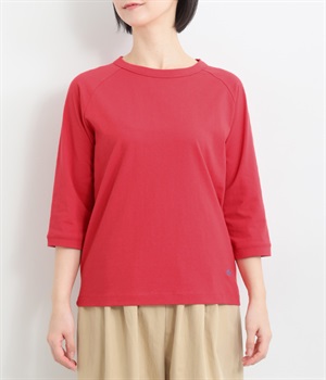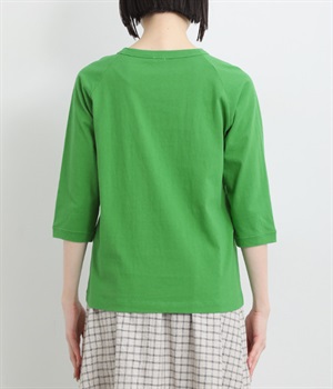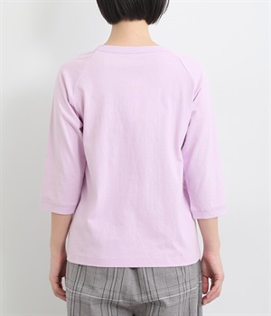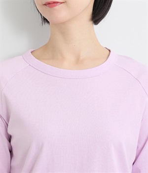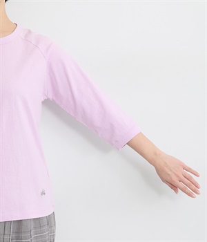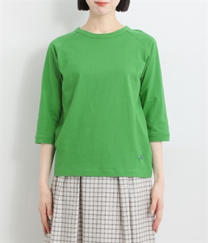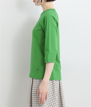 インナー使いでも着ぶくれしにくい、大きすぎないレギュラーシルエット。肩まわりが動かしやすいラグランスリーブ&ロングシーズン着まわせる七分袖です。左裾の刺しゅうでさりげないアクセントをプラス。