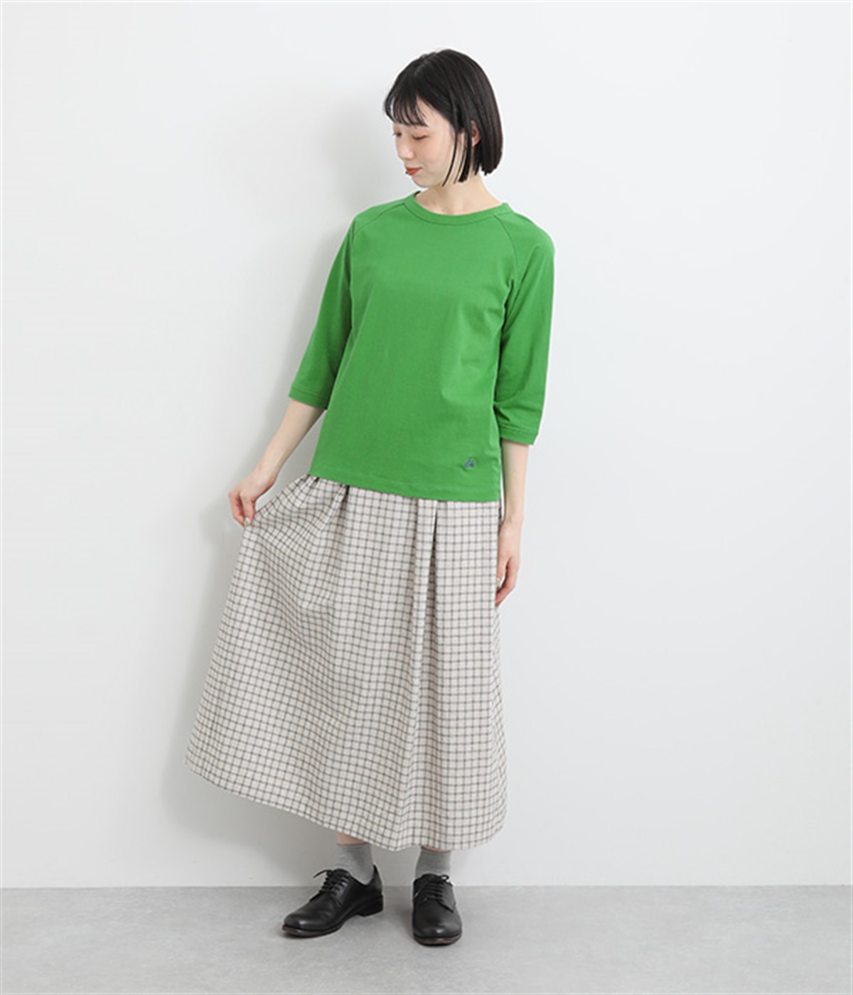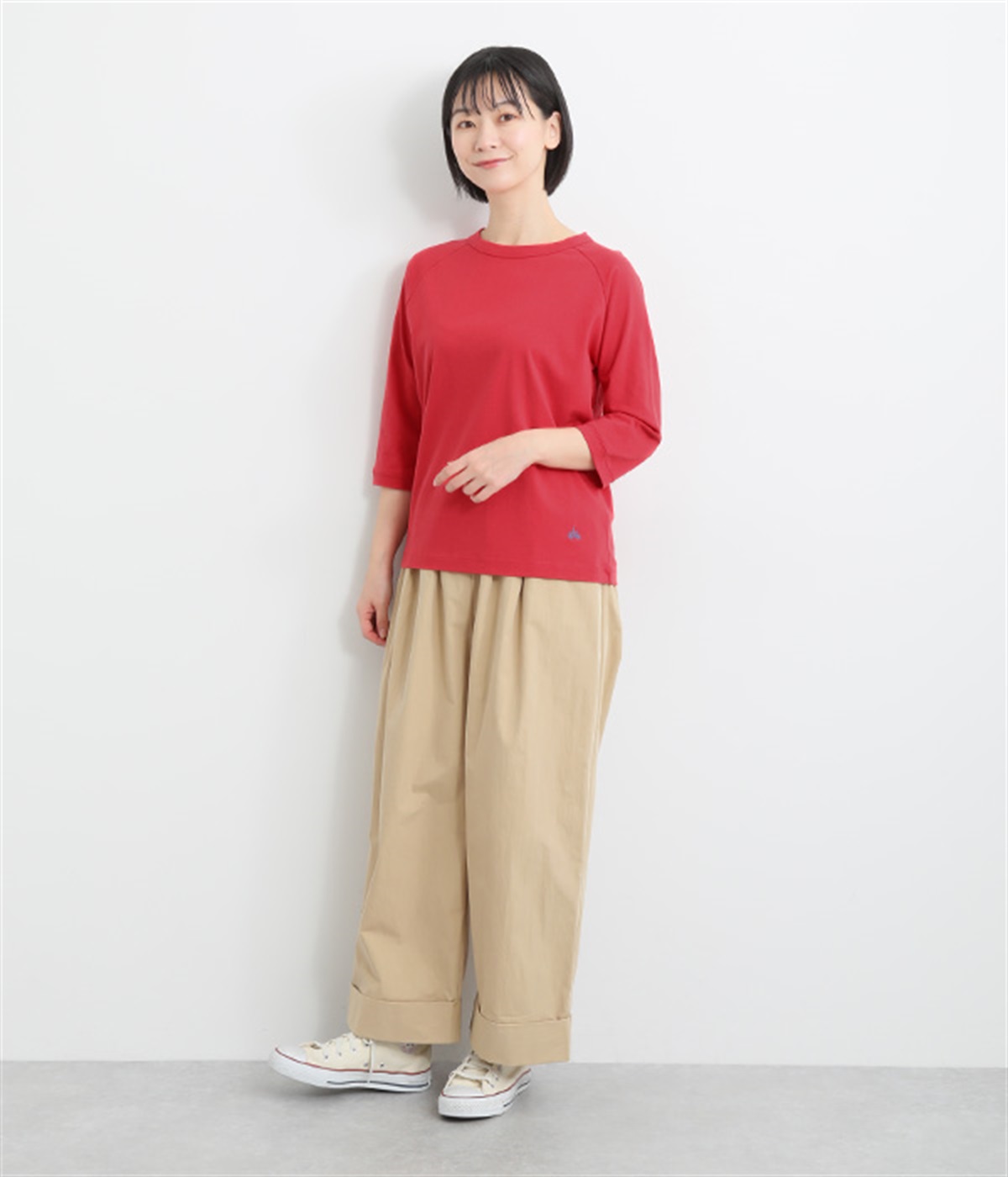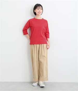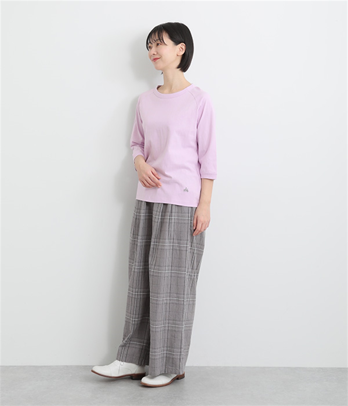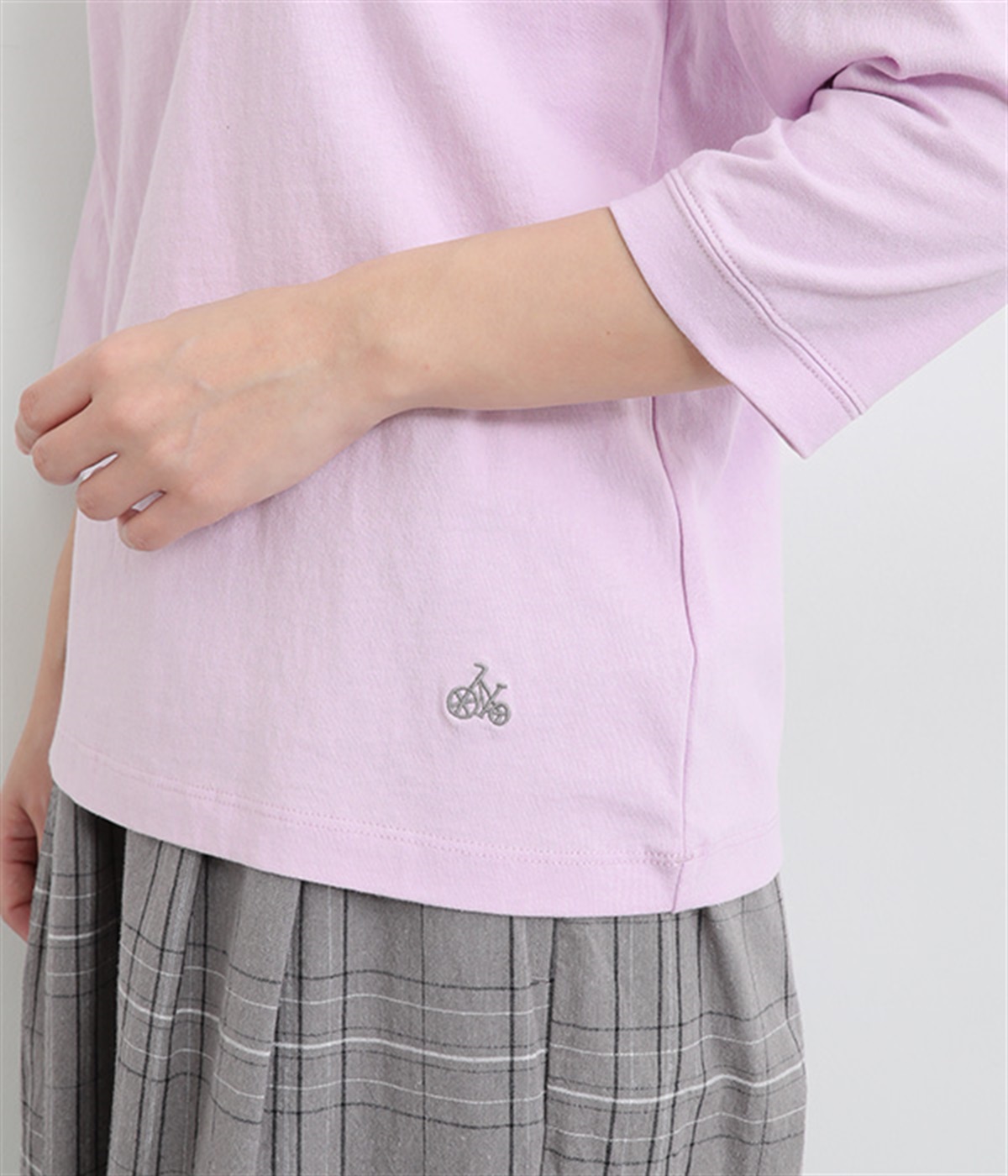 インナー使いでも着ぶくれしにくい、大きすぎないレギュラーシルエット。肩まわりが動かしやすいラグランスリーブ&ロングシーズン着まわせる七分袖です。左裾の刺しゅうでさりげないアクセントをプラス。
