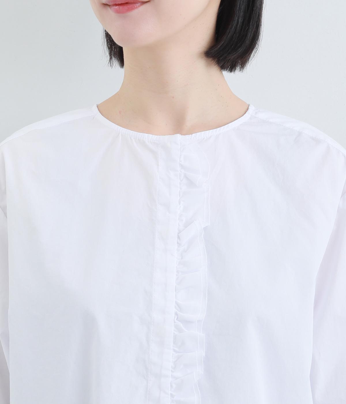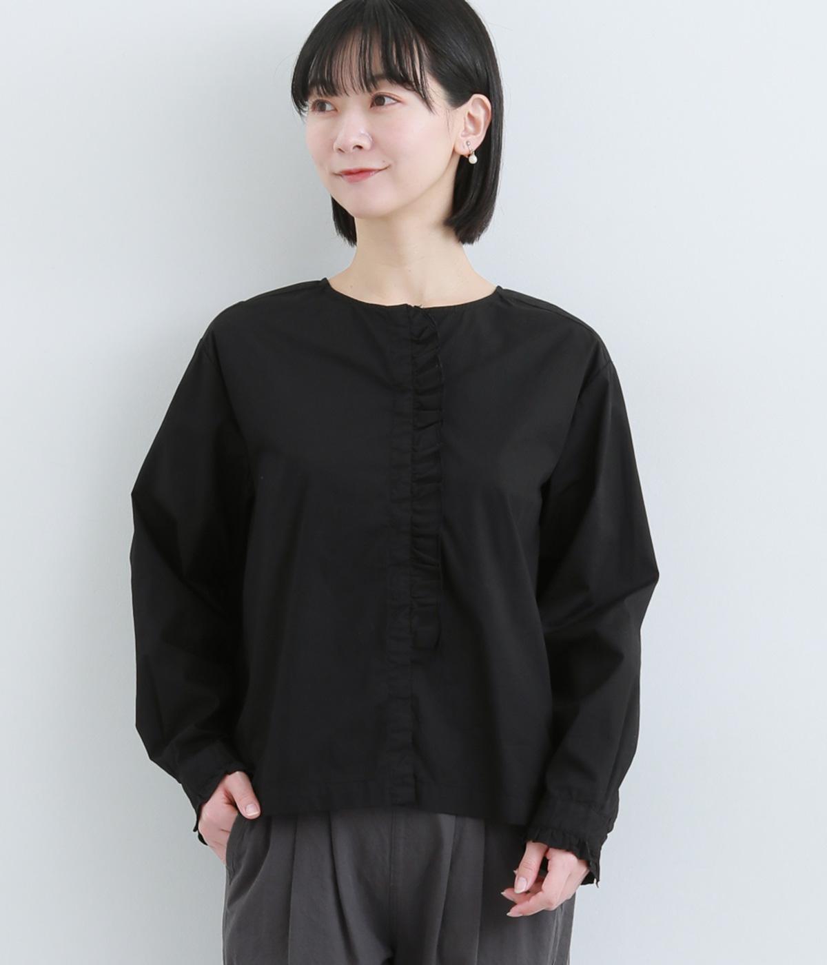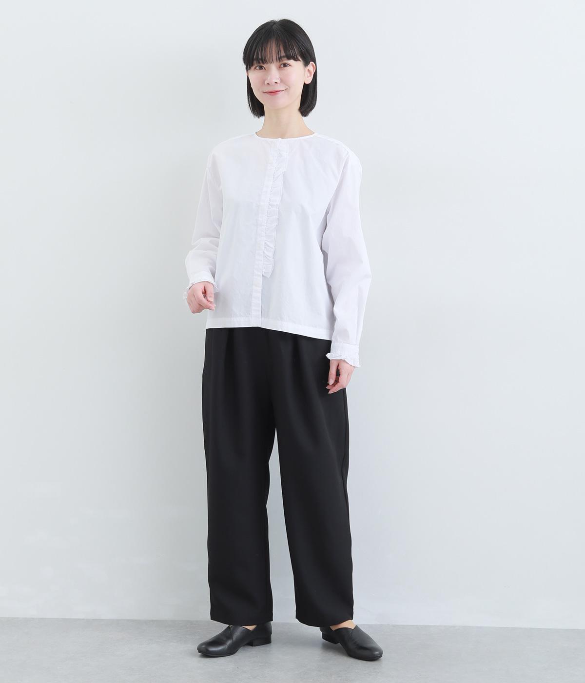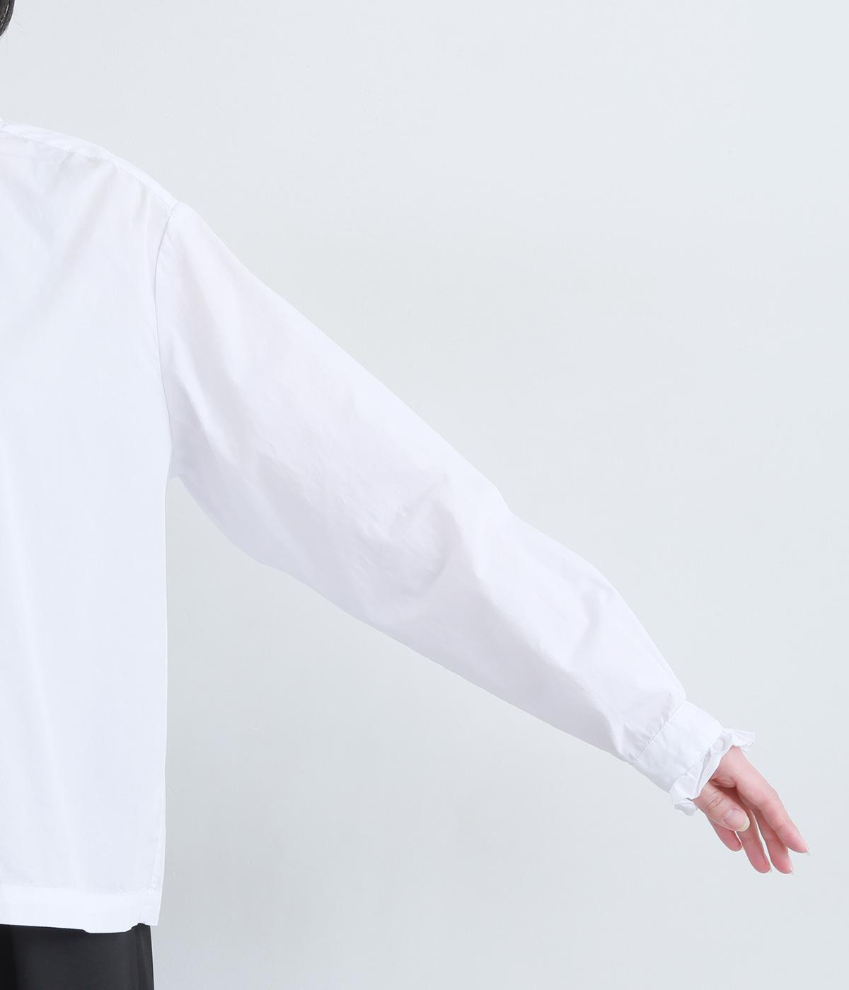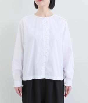 きちんと感のあるブラウスに前立てと袖口にあしらったフリルがほのかなかわいさをプラス。ノーカラーが顔まわりをすっきり見せ、洗練された印象をもたらします。デイリーにもフォーマルにも着まわせる万能アイテムです。