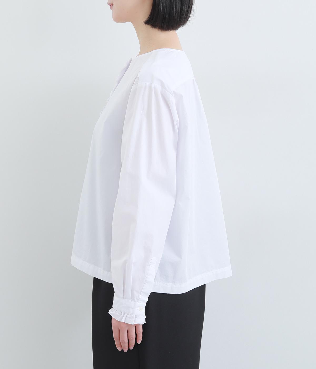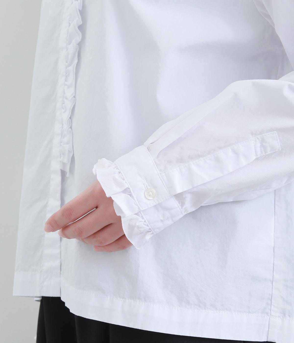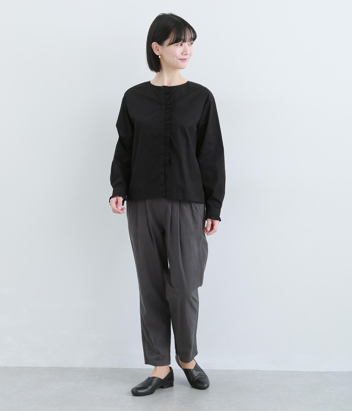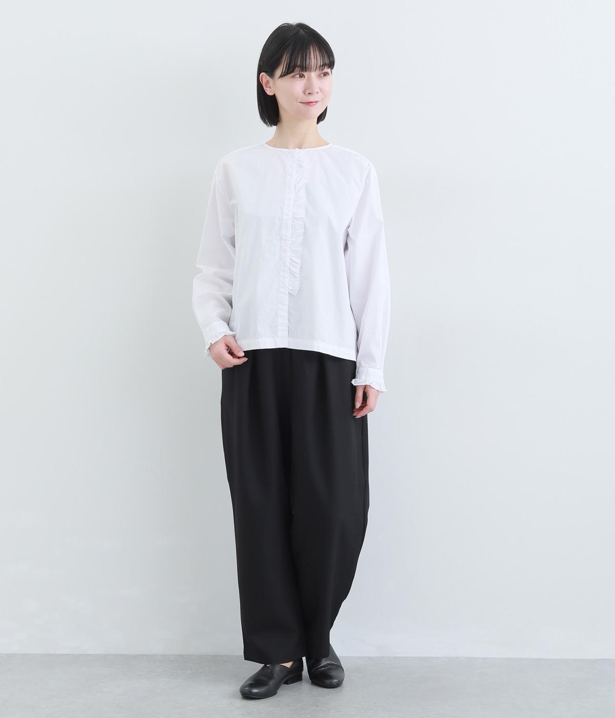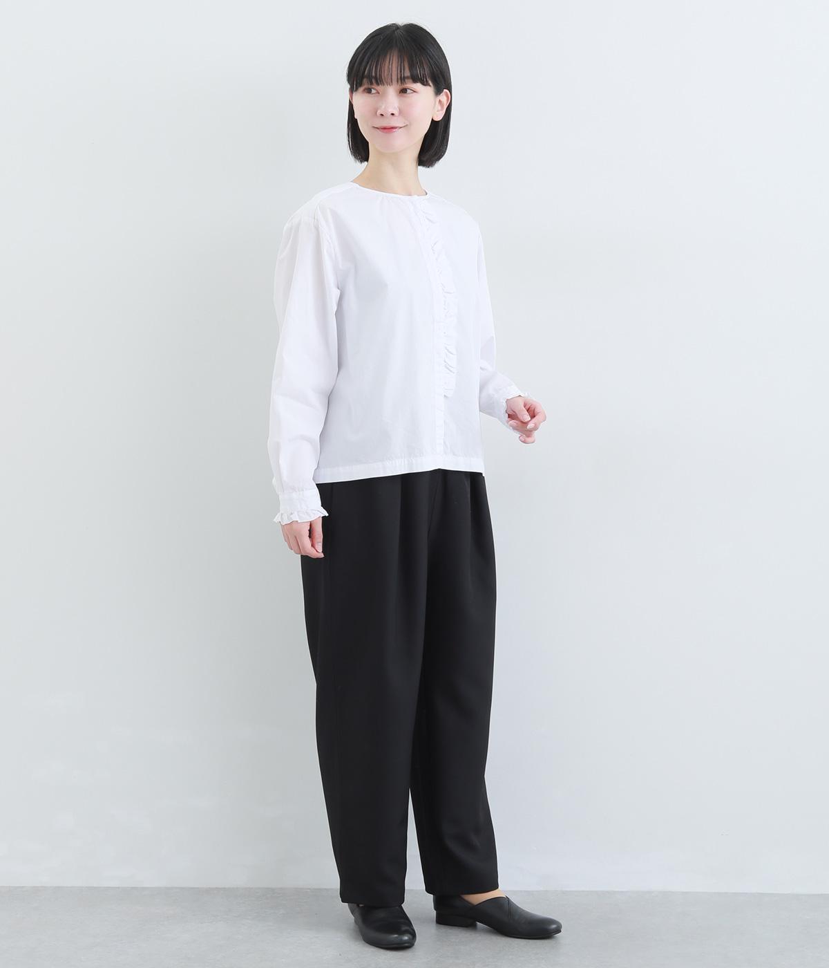 きちんと感のあるブラウスに前立てと袖口にあしらったフリルがほのかなかわいさをプラス。ノーカラーが顔まわりをすっきり見せ、洗練された印象をもたらします。デイリーにもフォーマルにも着まわせる万能アイテムです。