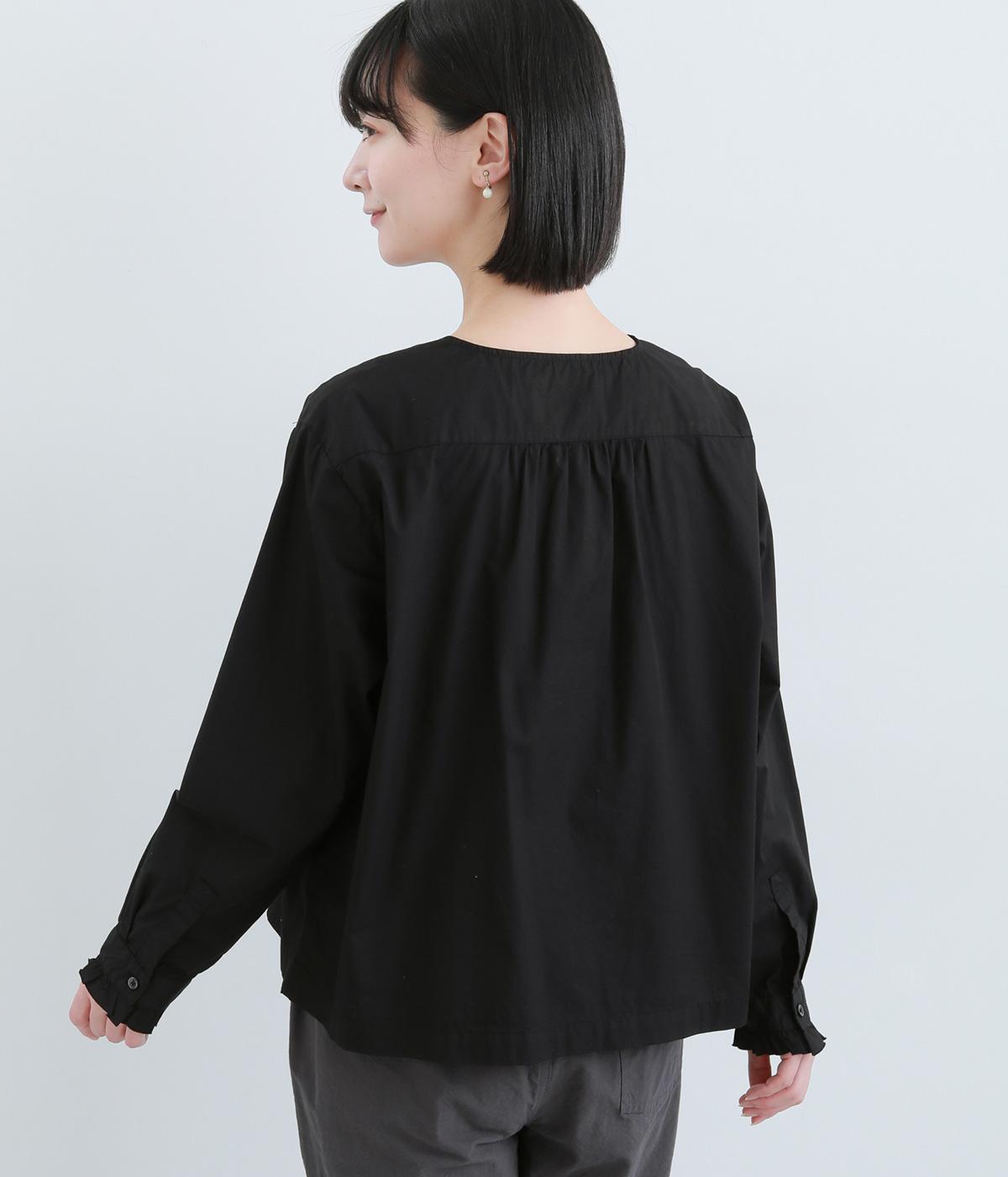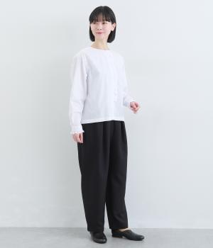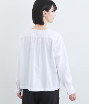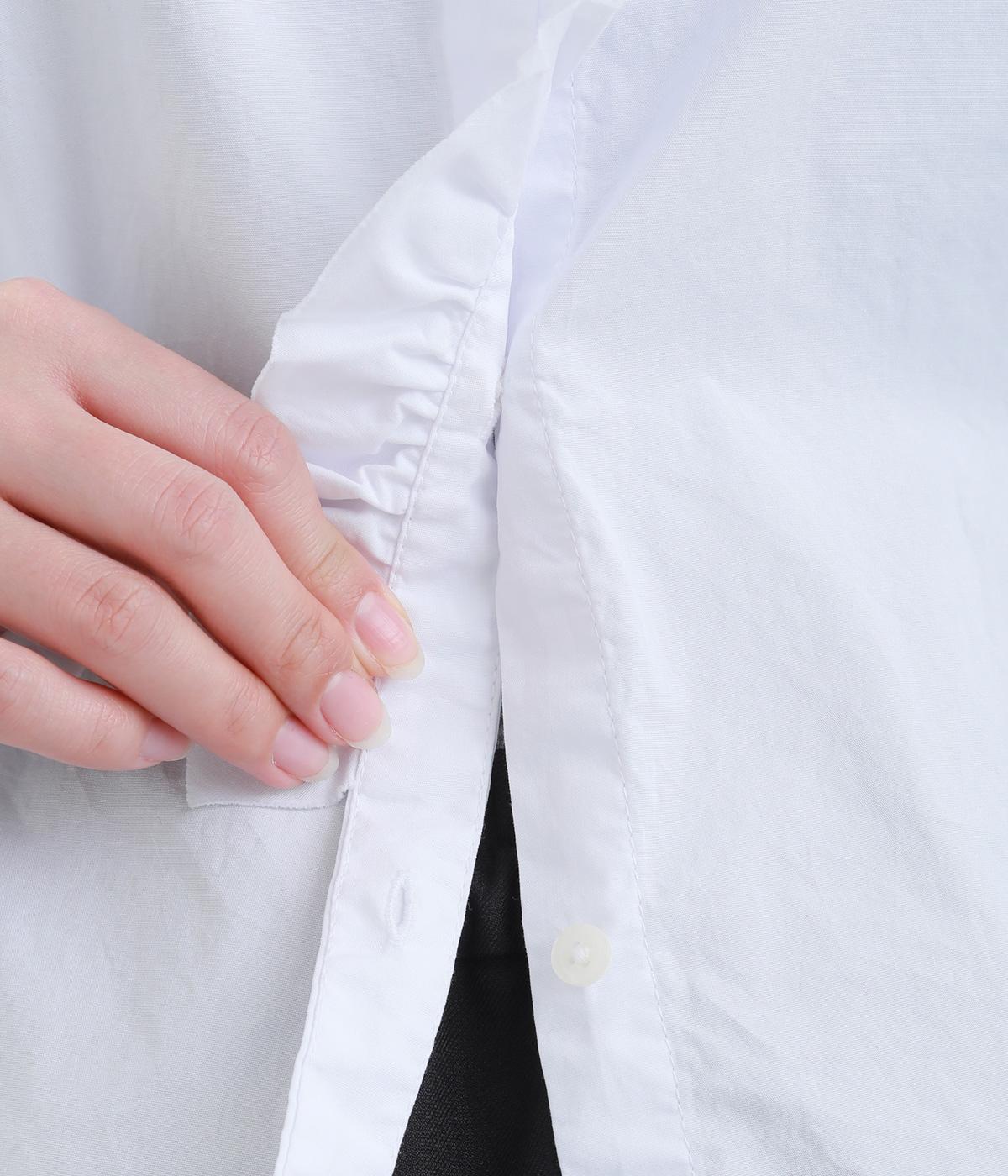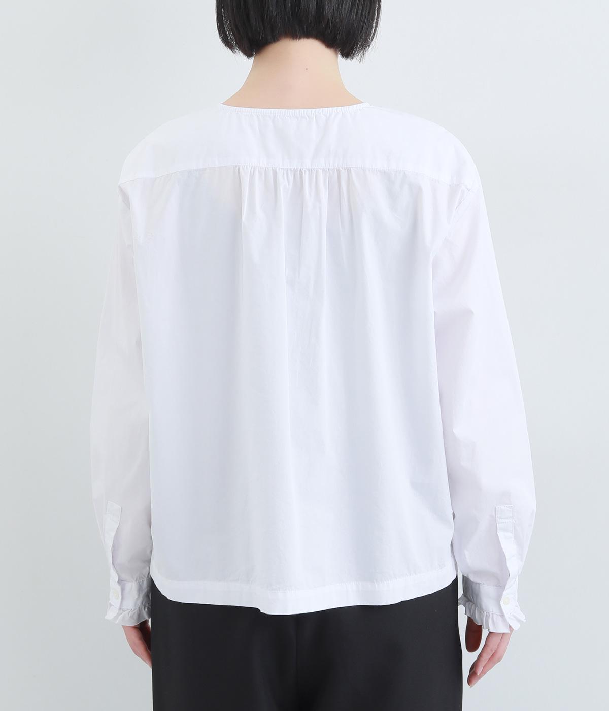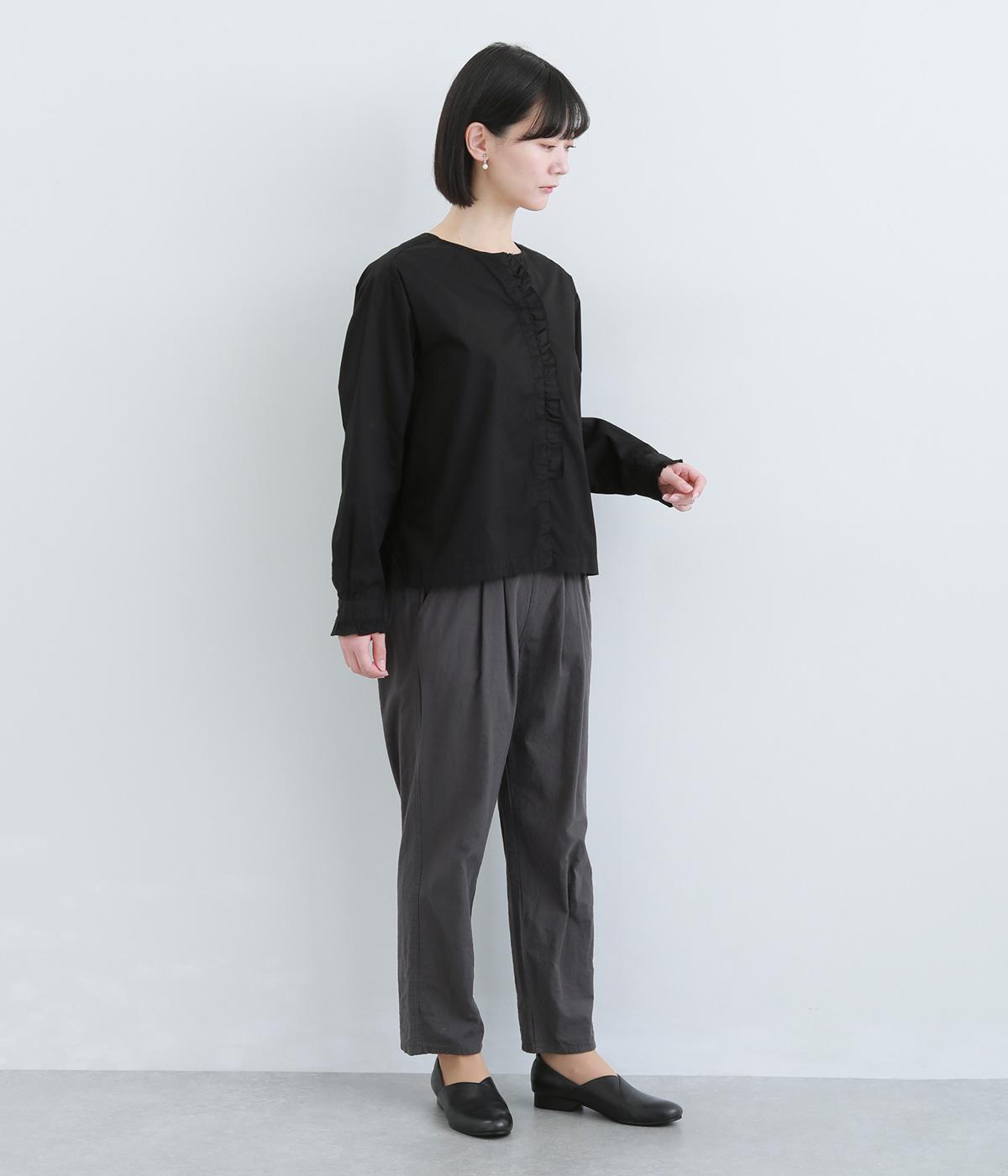 きちんと感のあるブラウスに前立てと袖口にあしらったフリルがほのかなかわいさをプラス。ノーカラーが顔まわりをすっきり見せ、洗練された印象をもたらします。デイリーにもフォーマルにも着まわせる万能アイテムです。