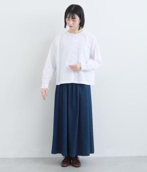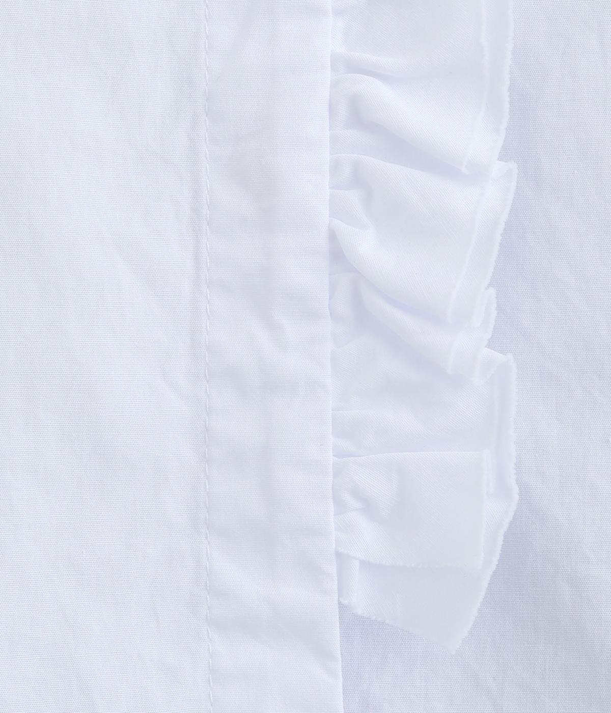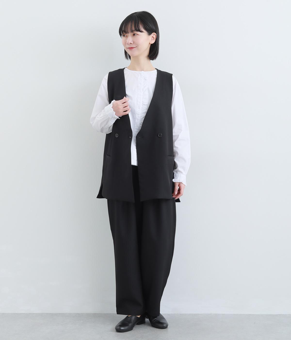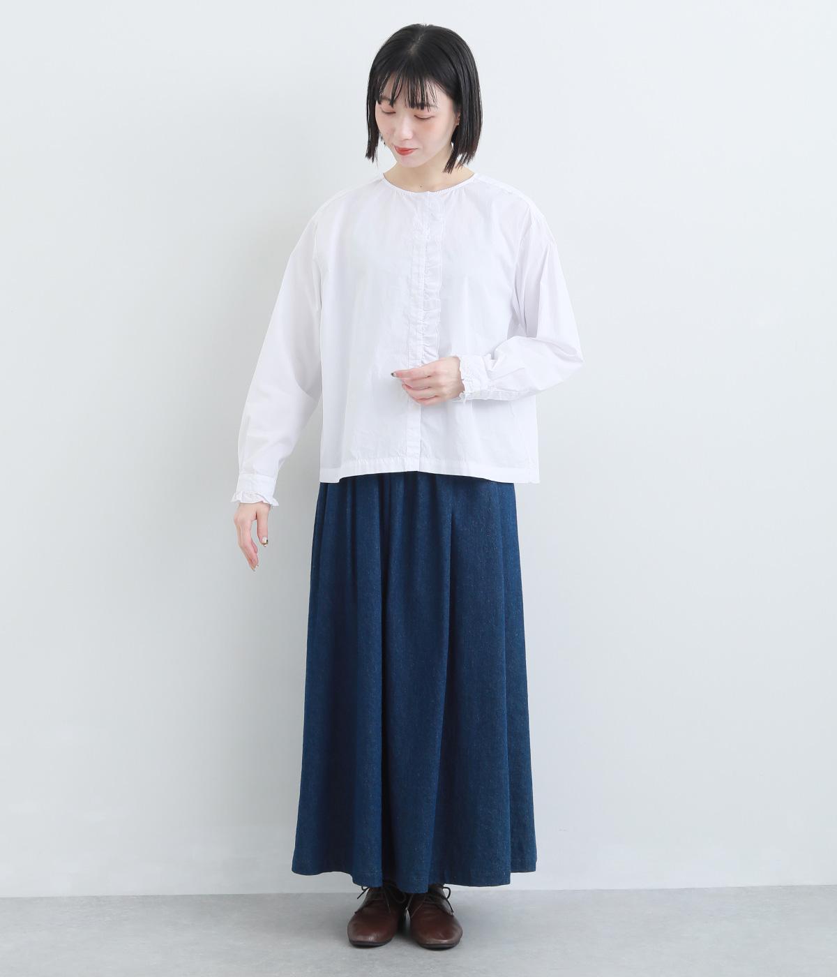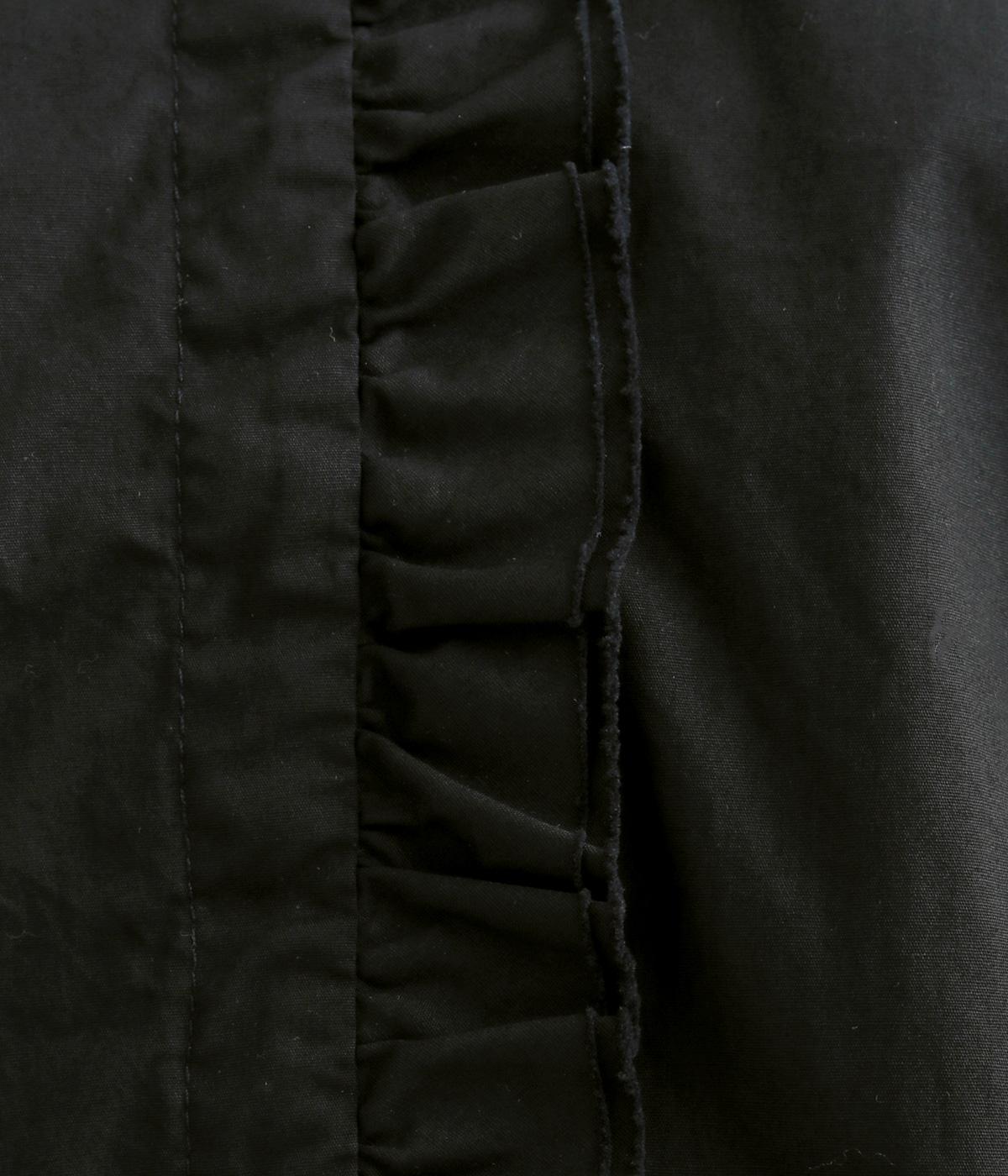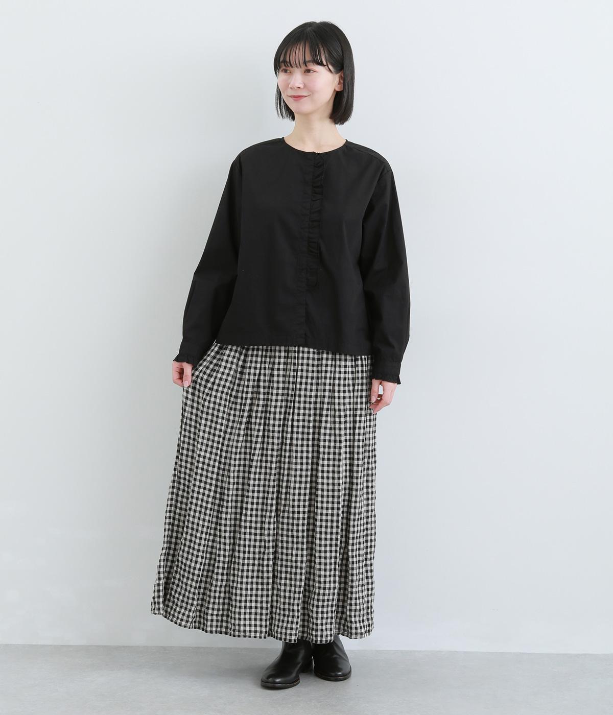 きちんと感のあるブラウスに前立てと袖口にあしらったフリルがほのかなかわいさをプラス。ノーカラーが顔まわりをすっきり見せ、洗練された印象をもたらします。デイリーにもフォーマルにも着まわせる万能アイテムです。