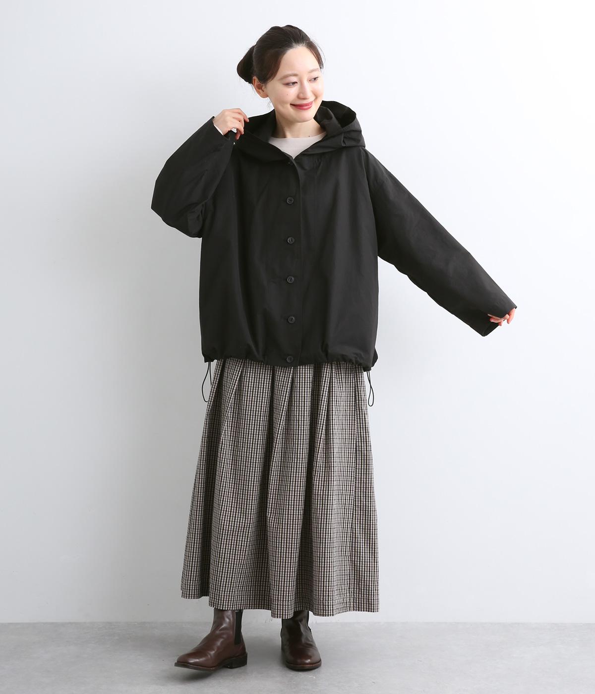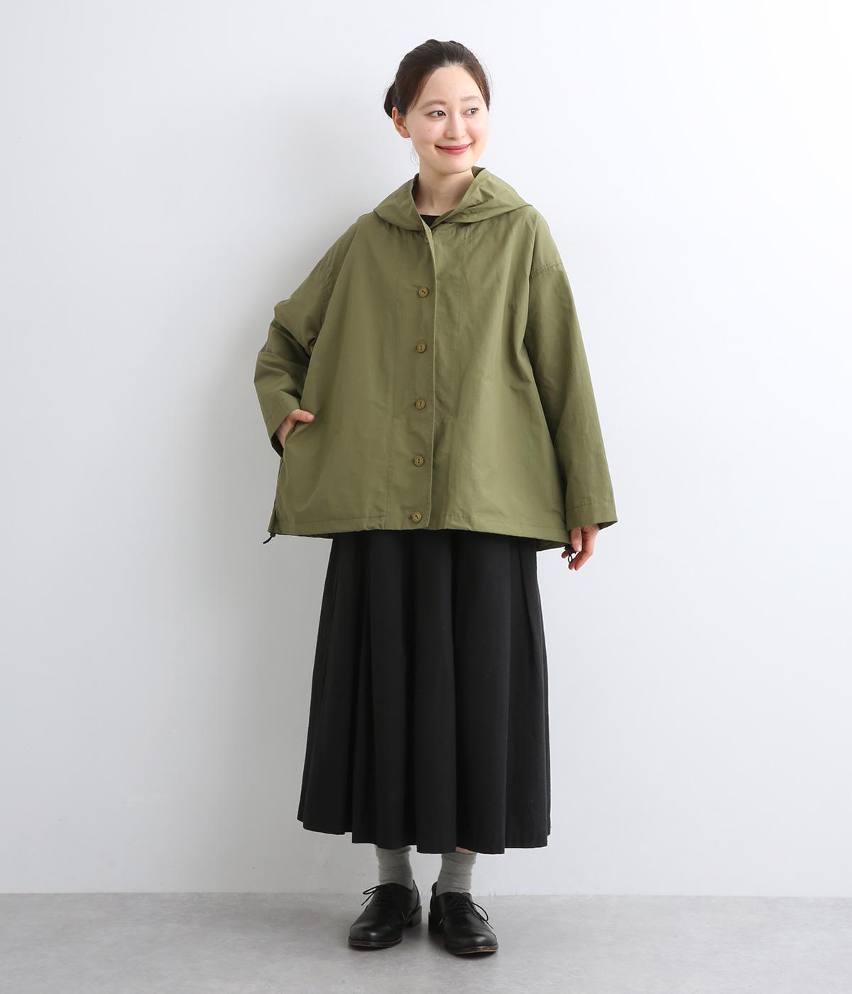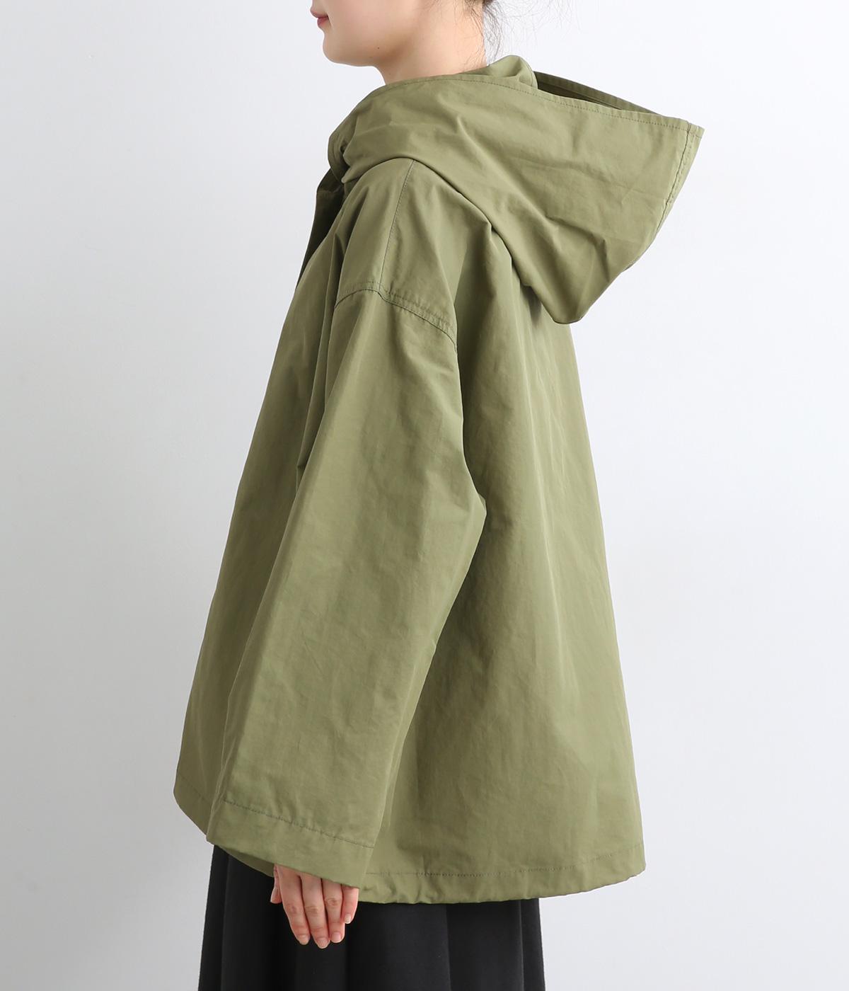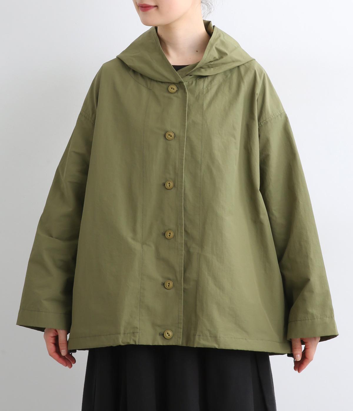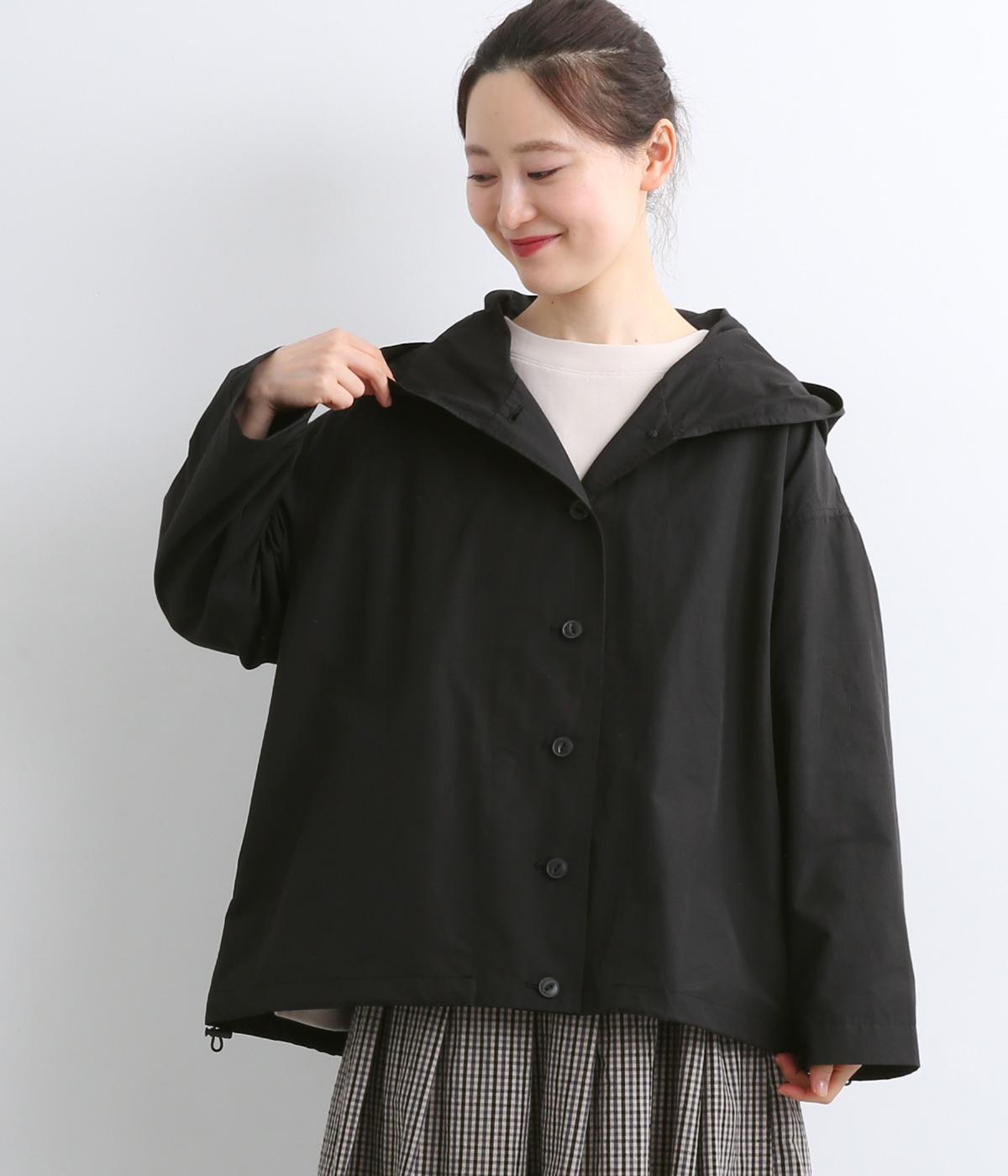 前ボタンのフードつきブルゾン。ゆとりのあるAラインとシンプルなデザインで、カジュアルすぎず品よく着られます。裾にはドローコードつきで、シルエットチェンジも楽しめます。