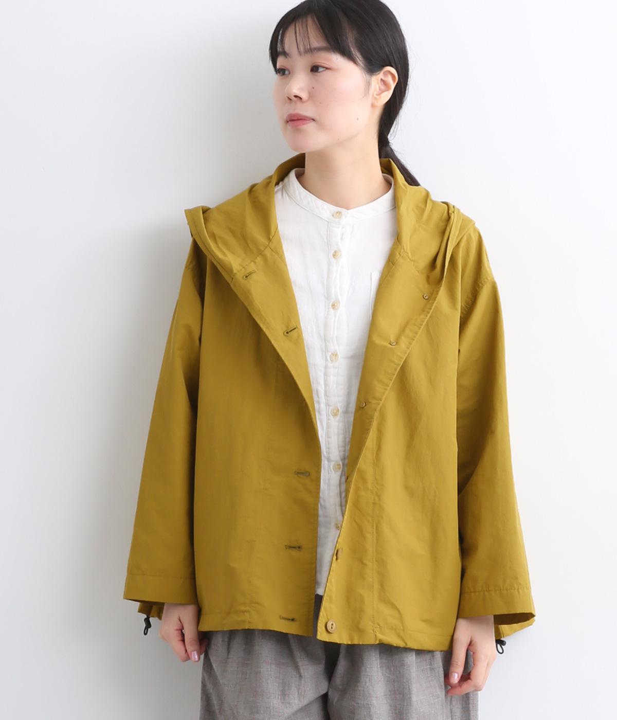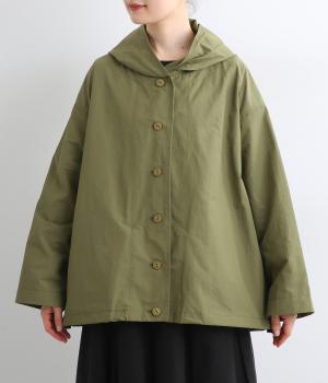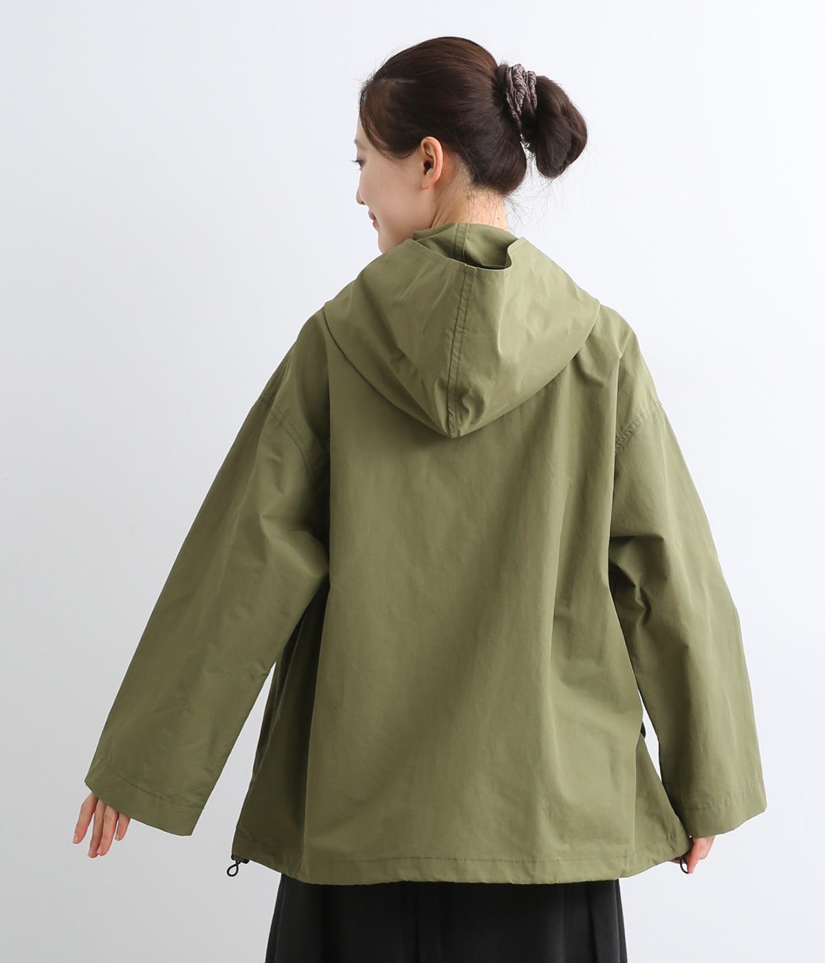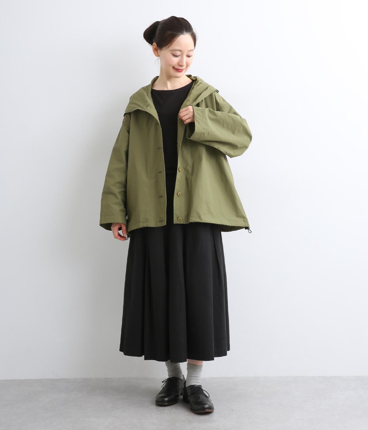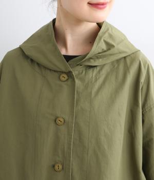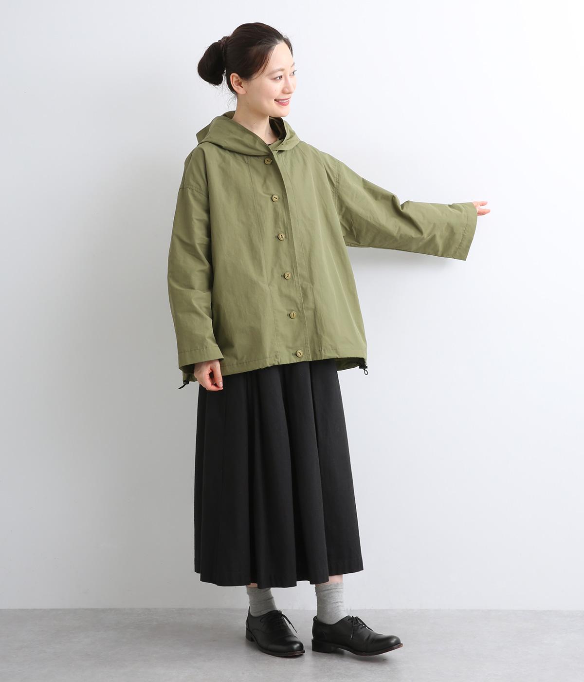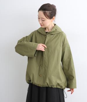 前ボタンのフードつきブルゾン。ゆとりのあるAラインとシンプルなデザインで、カジュアルすぎず品よく着られます。裾にはドローコードつきで、シルエットチェンジも楽しめます。