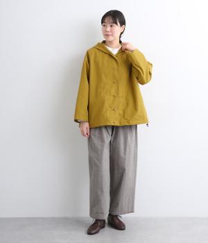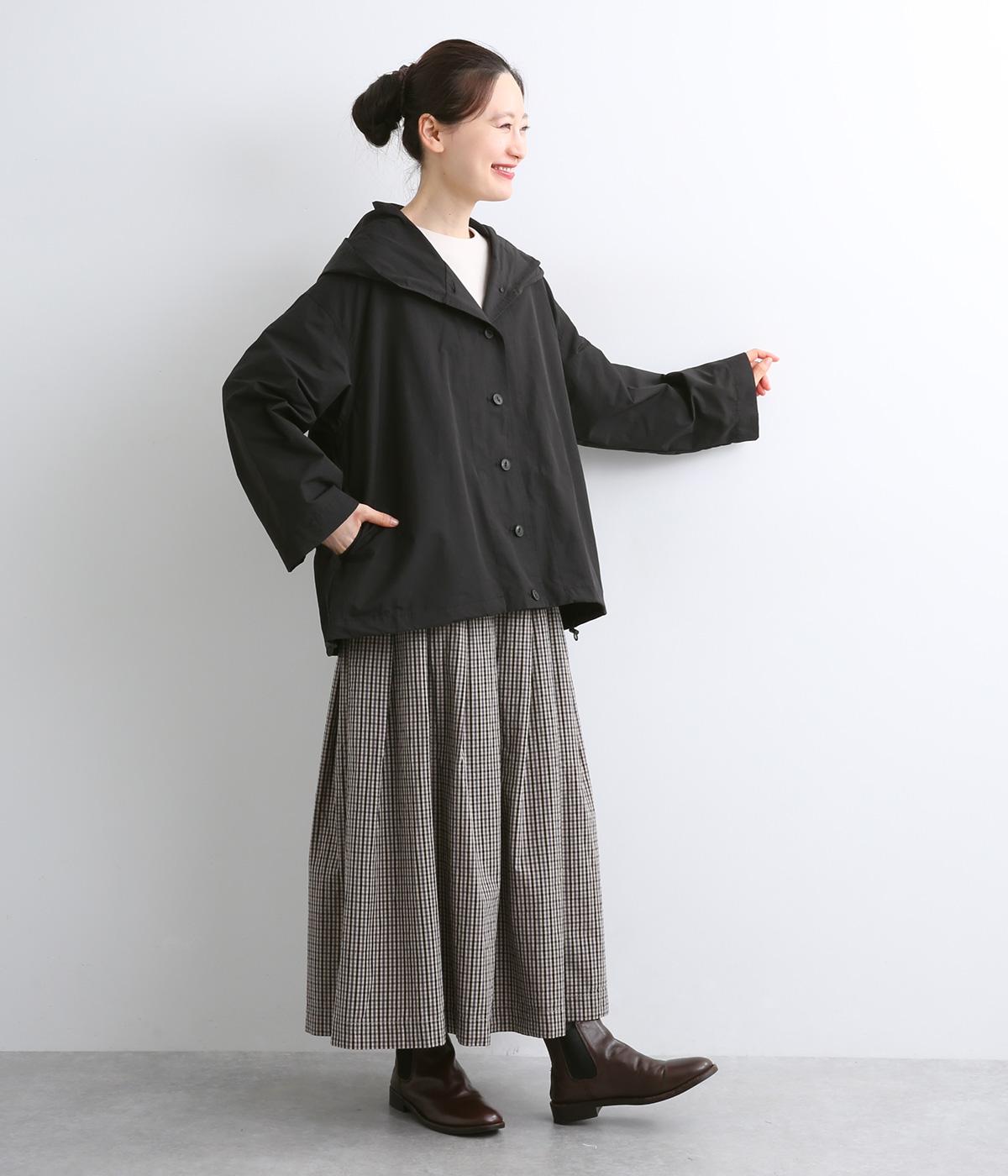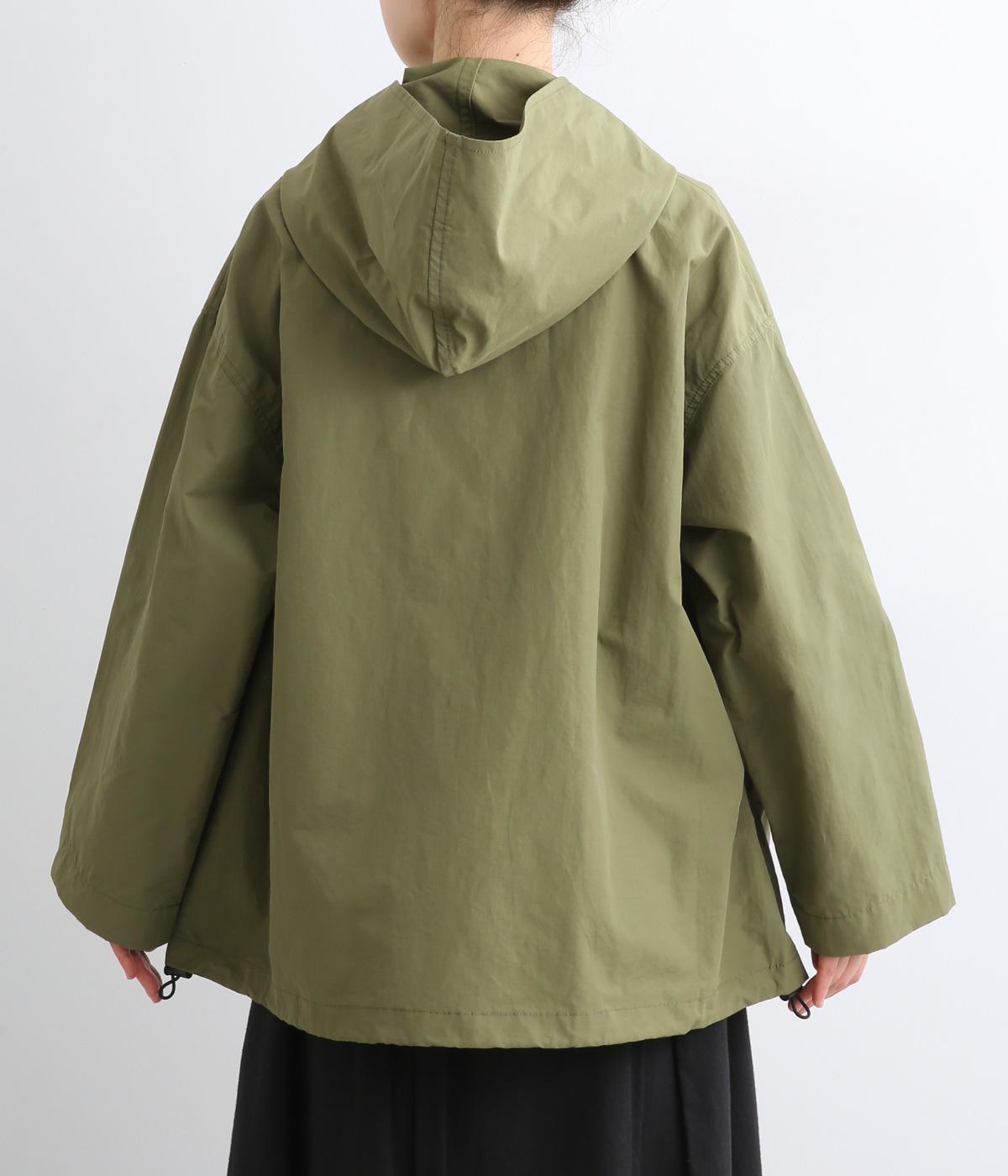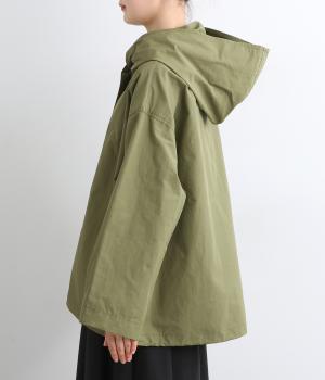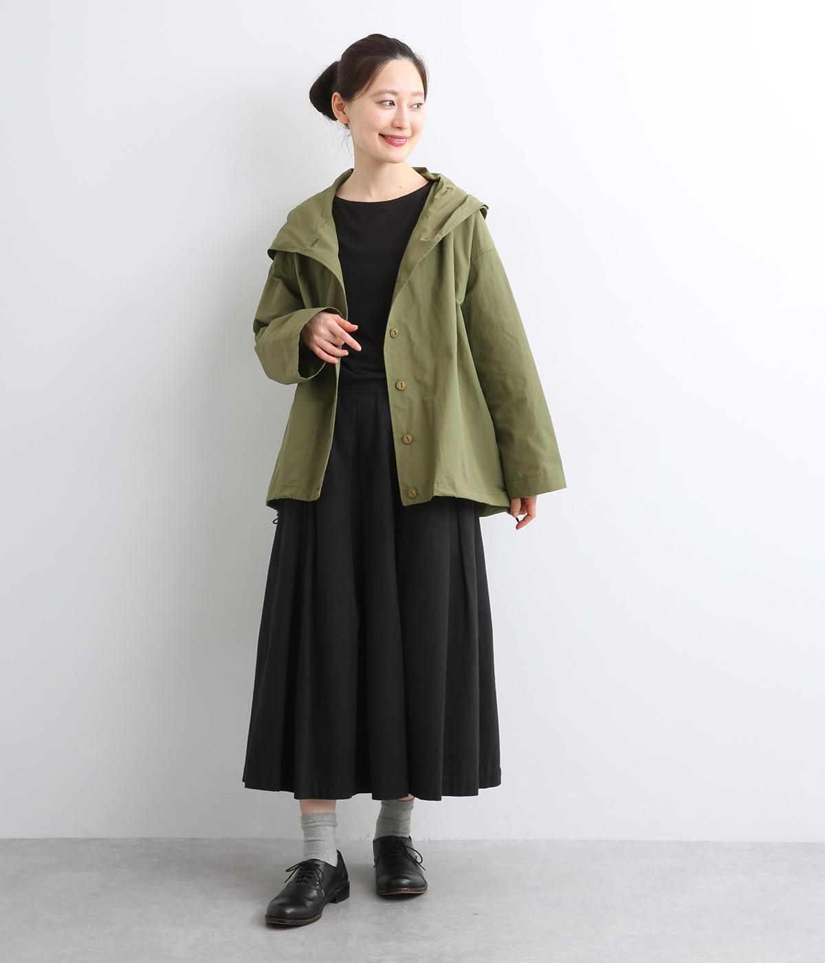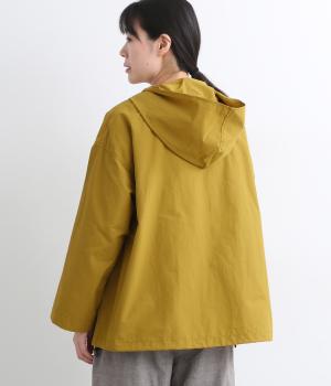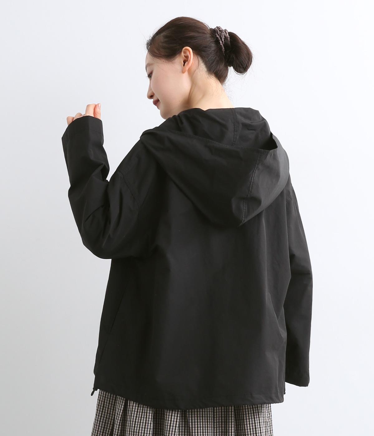 前ボタンのフードつきブルゾン。ゆとりのあるAラインとシンプルなデザインで、カジュアルすぎず品よく着られます。裾にはドローコードつきで、シルエットチェンジも楽しめます。