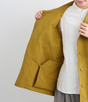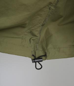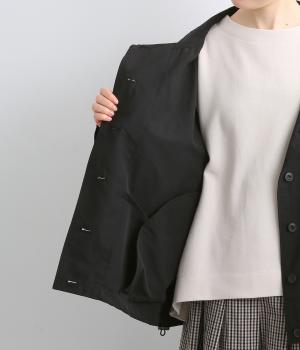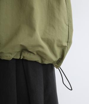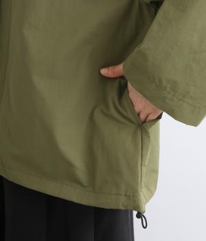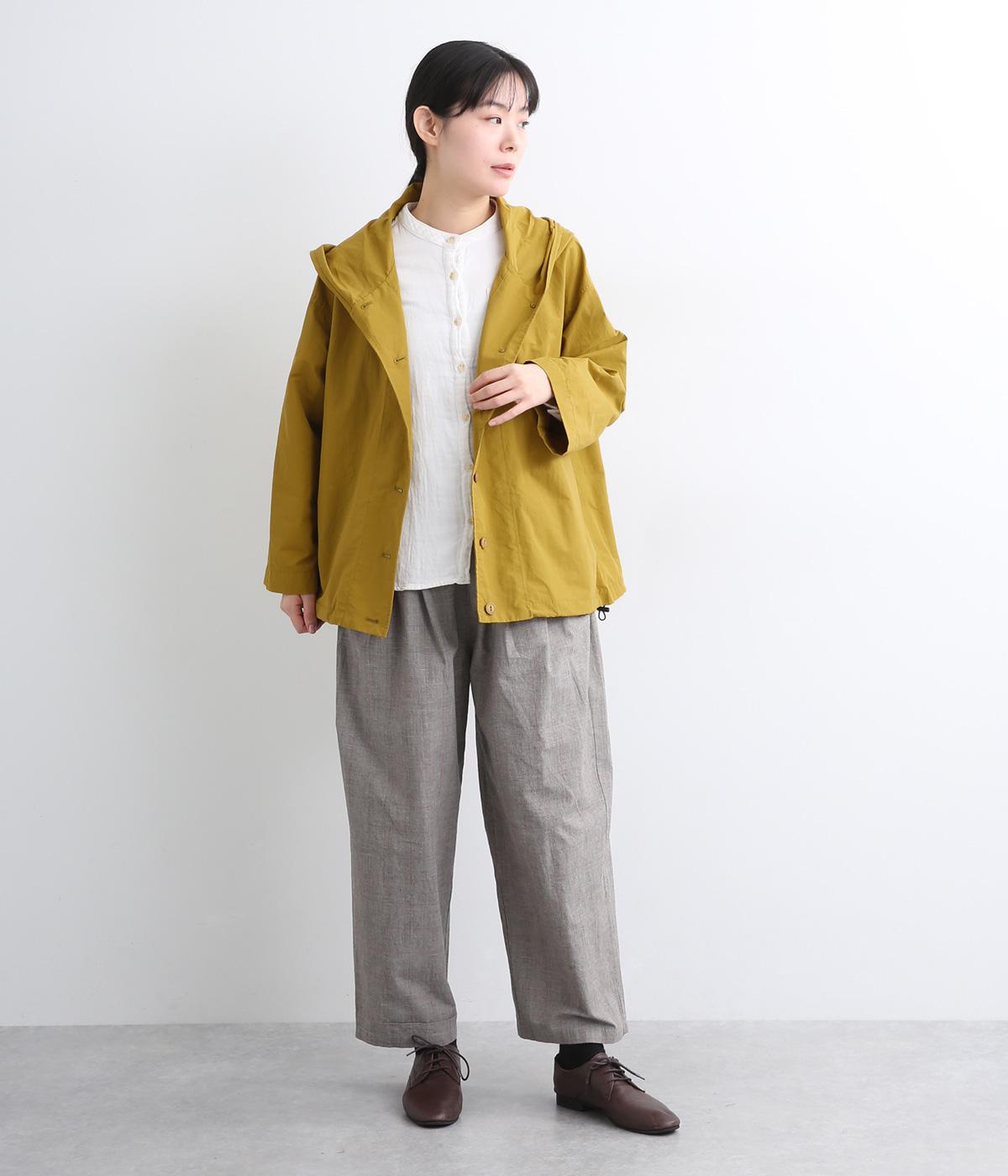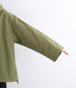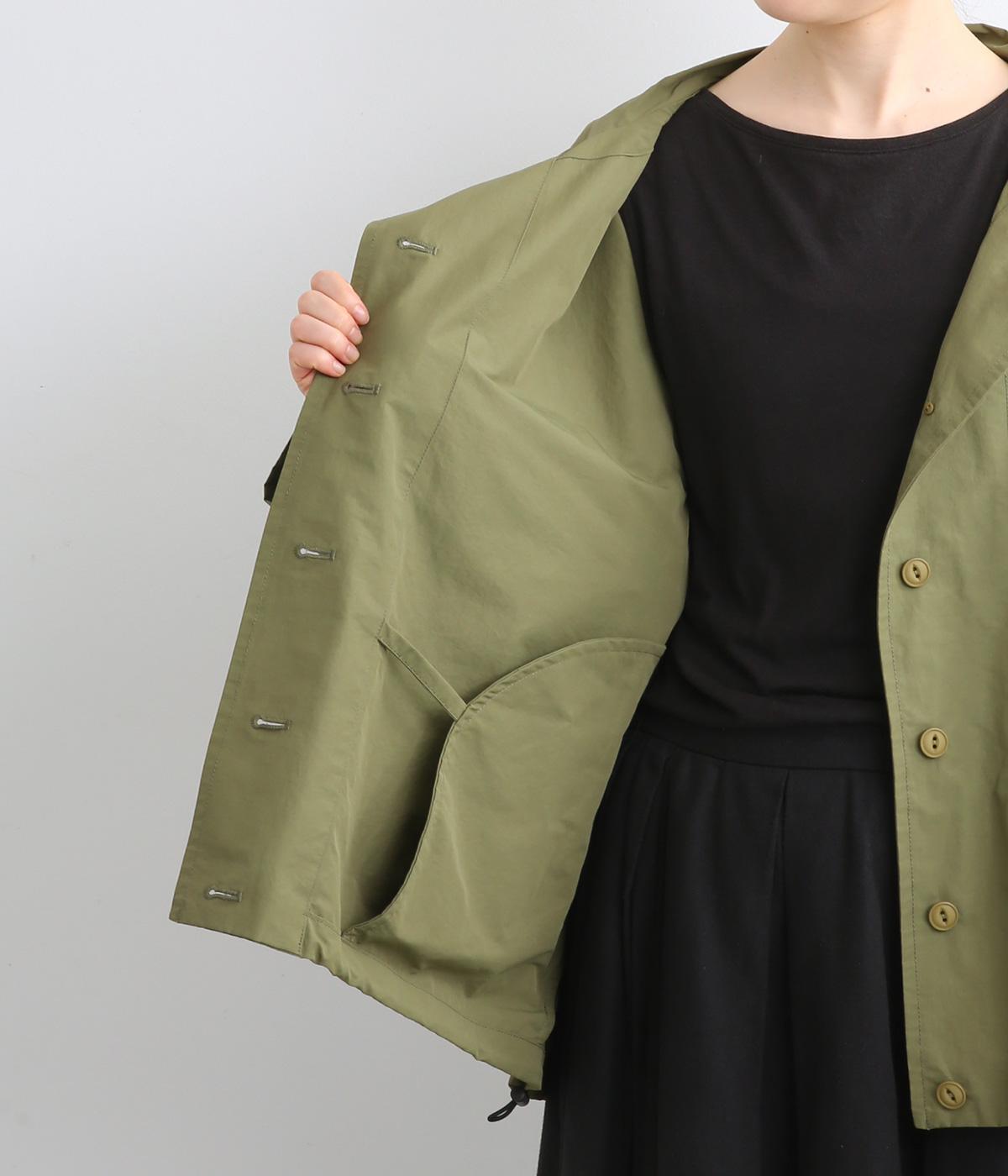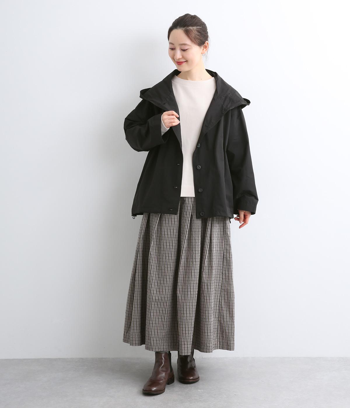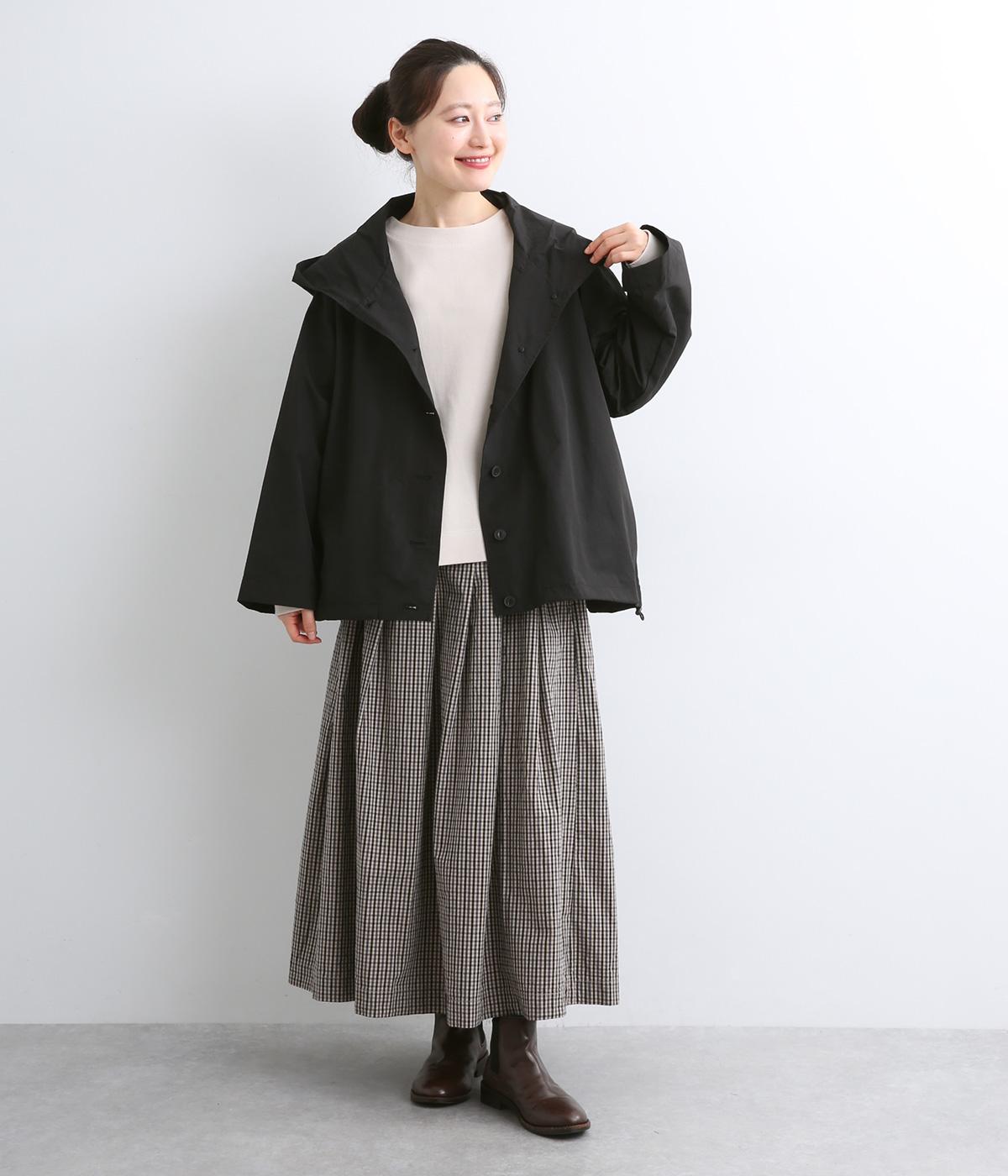 前ボタンのフードつきブルゾン。ゆとりのあるAラインとシンプルなデザインで、カジュアルすぎず品よく着られます。裾にはドローコードつきで、シルエットチェンジも楽しめます。