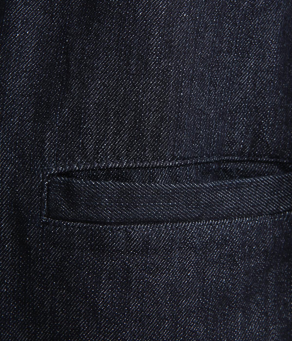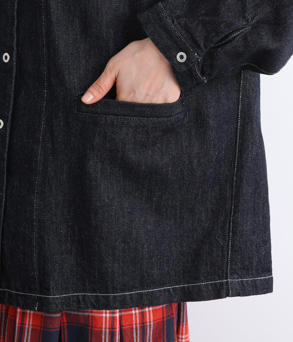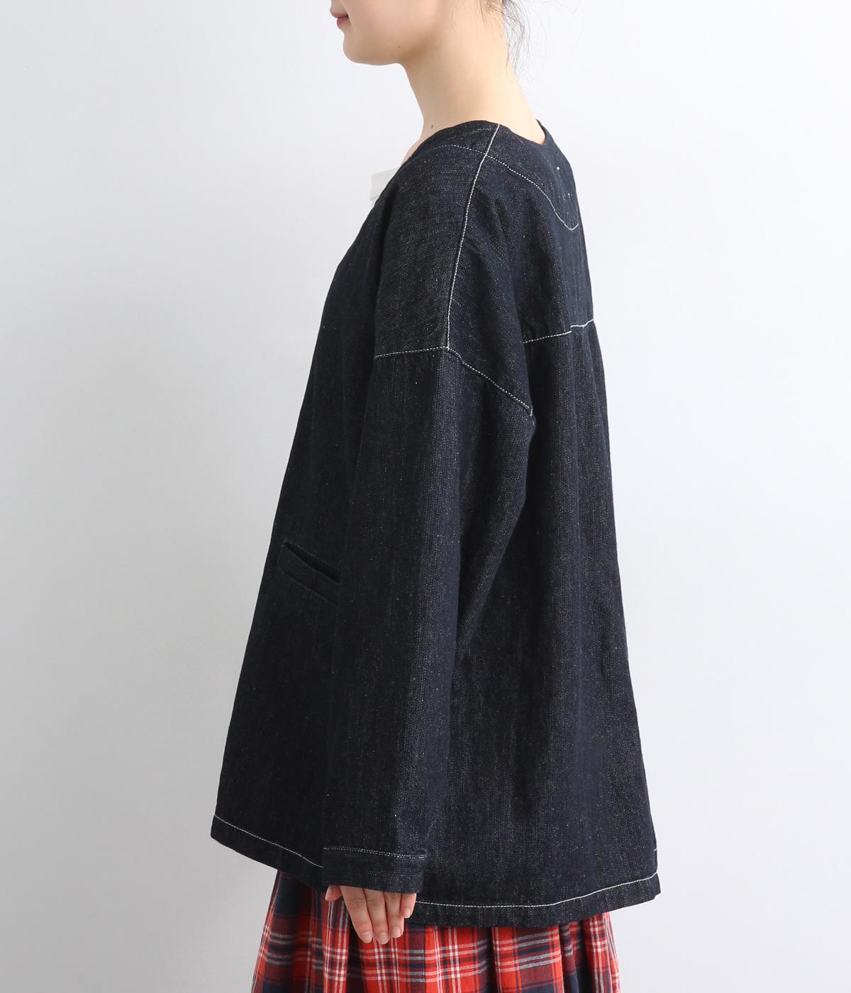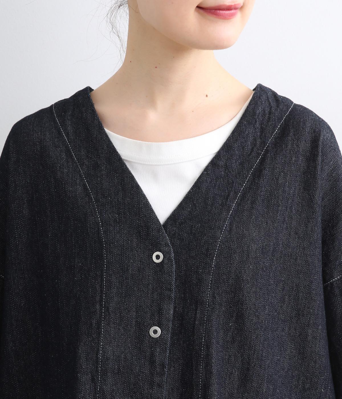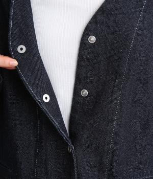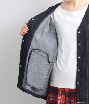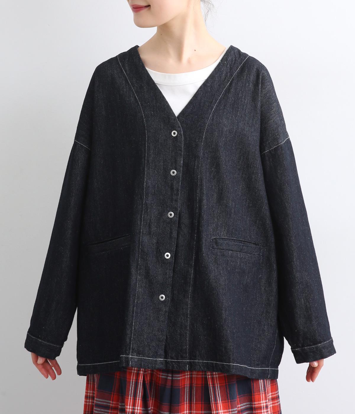 インディゴデニムに白ステッチがアクセントになったV開きのカバーオール。身幅はゆったりとしていますが、腕まわりはすっきりしていてバランスの取れたシルエットです。フロントポケットつきで使い勝手も◎。