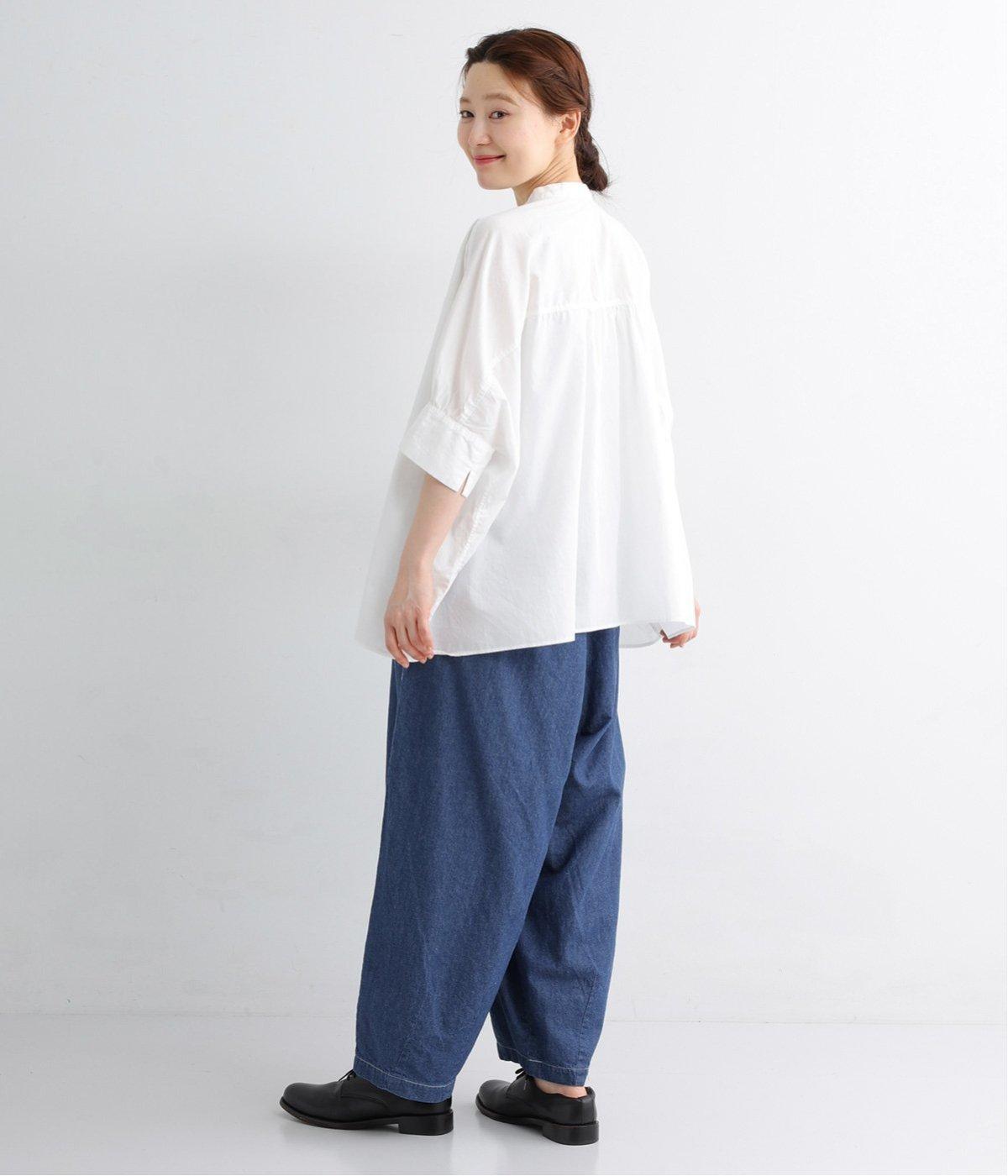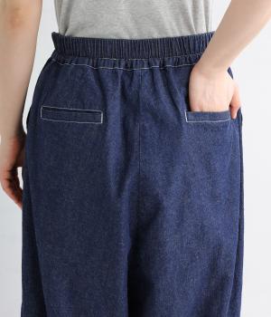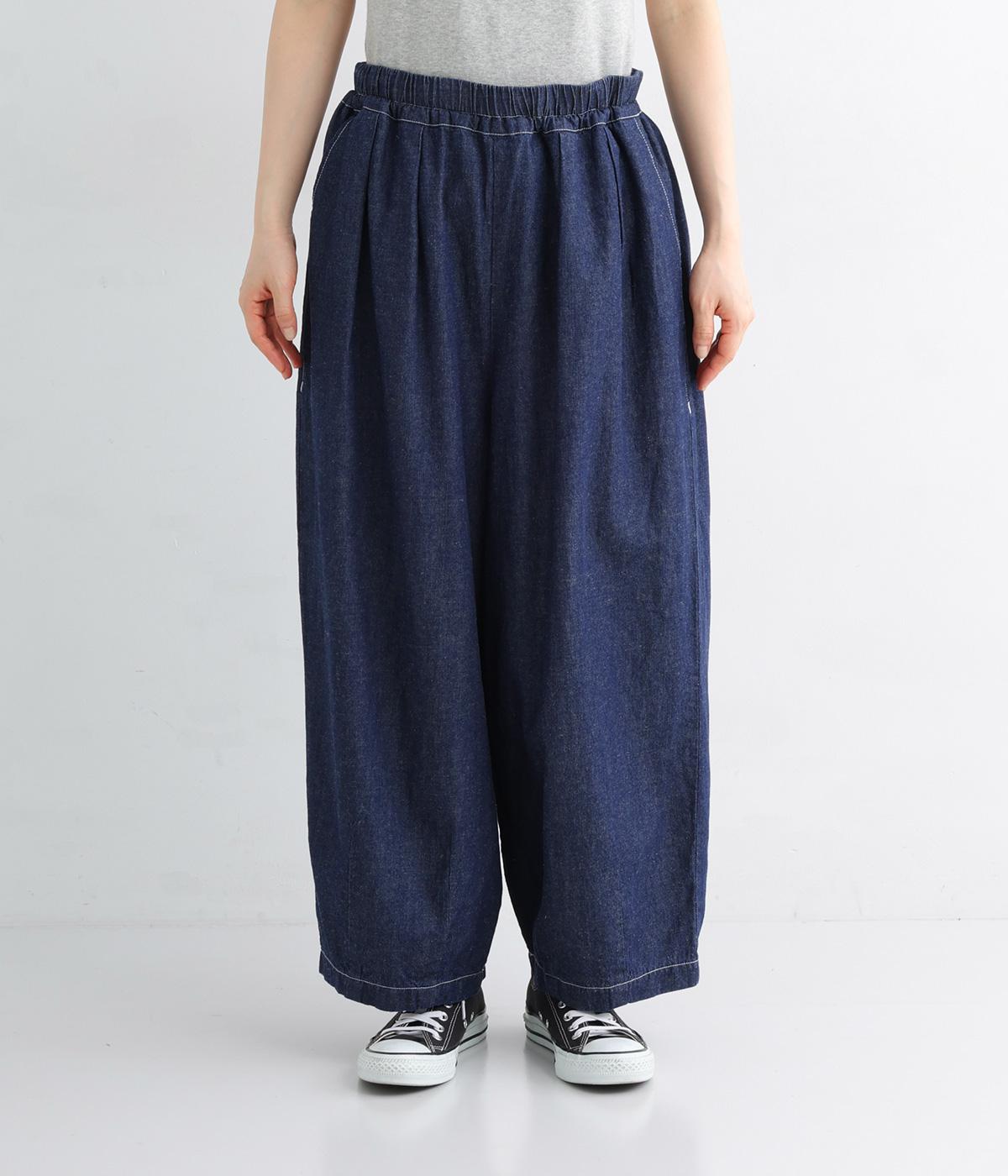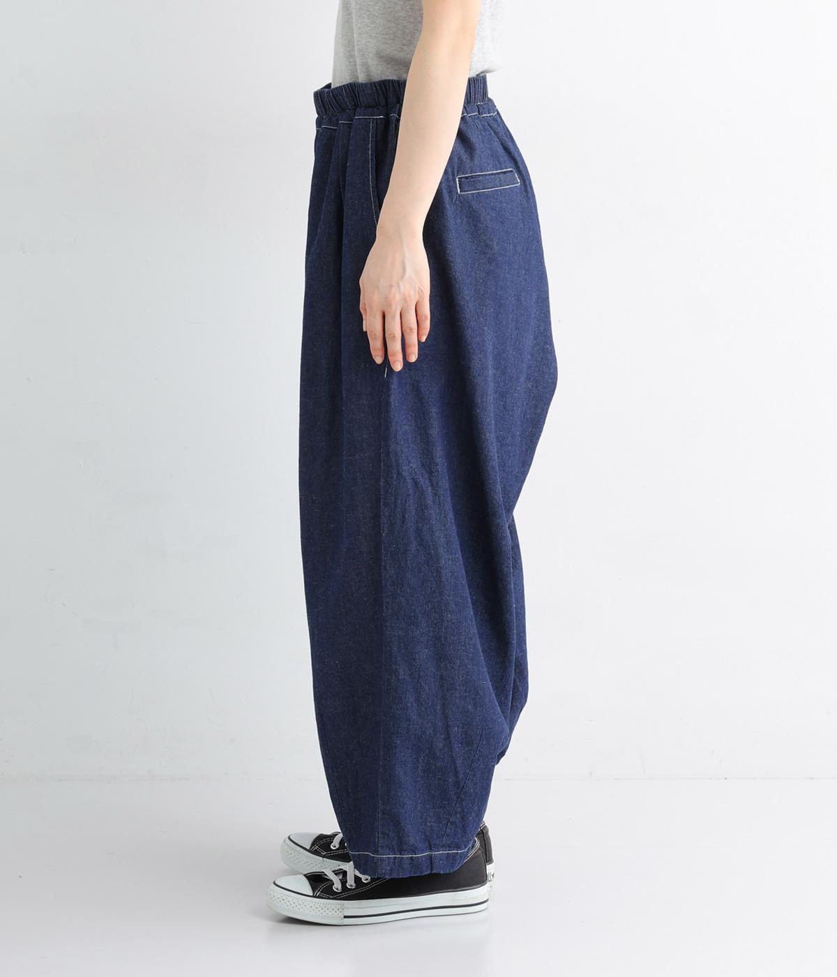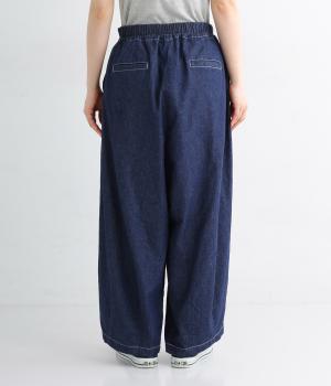 たっぷりとゆとりを持たせつつ、裾にダーツを入れることで広がりすぎない絶妙なバランスに仕上げたパンツ。ホワイトのステッチがデニムのさわやかなムードを加速させます。総ゴム仕様のウエストにドローコードをプラスし、はき心地も◎です。