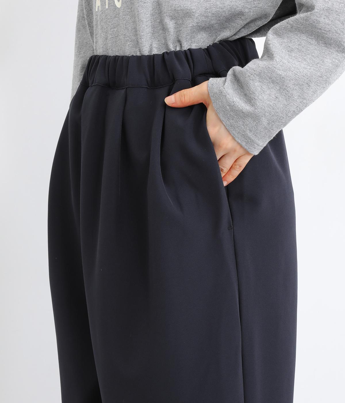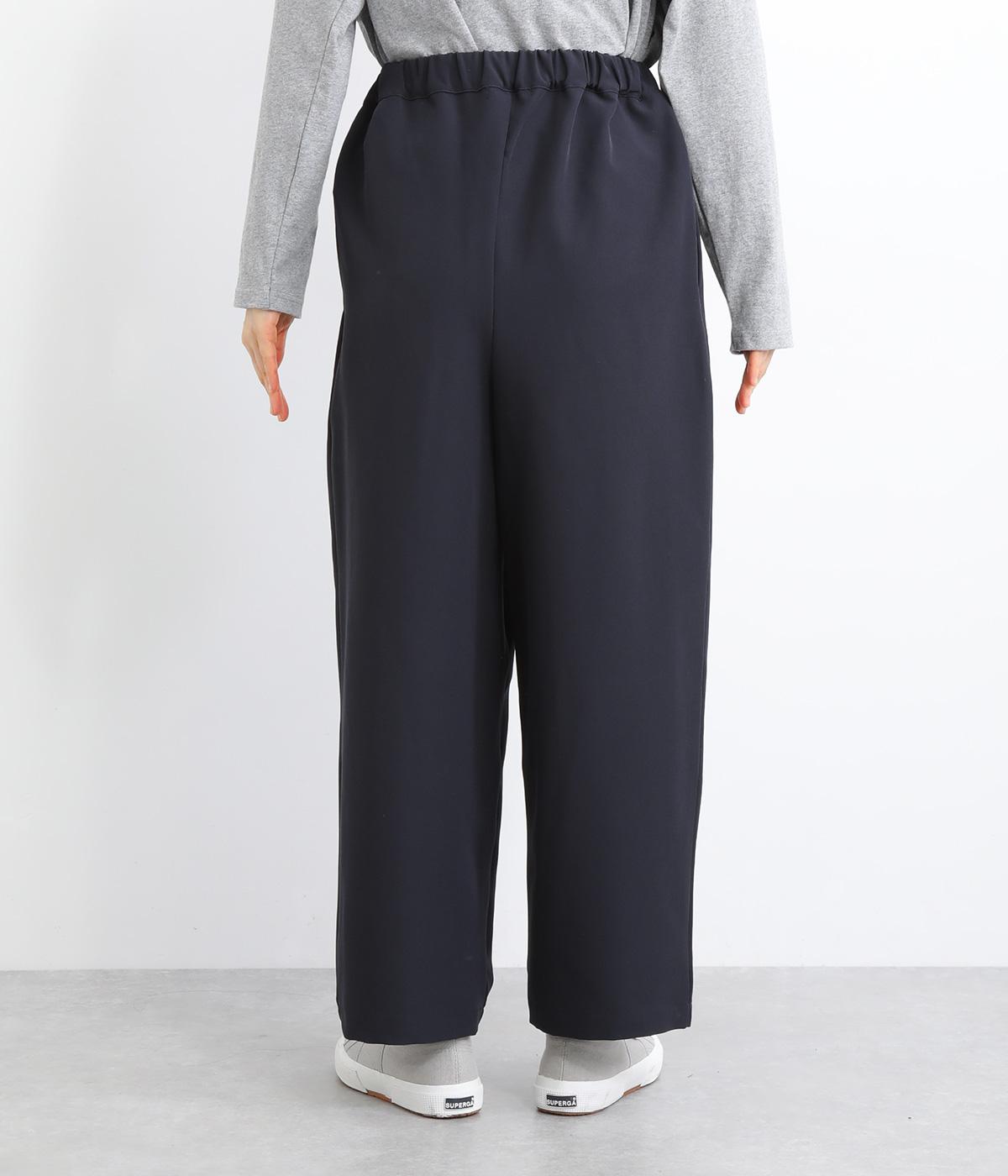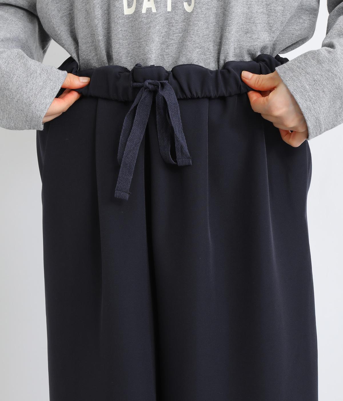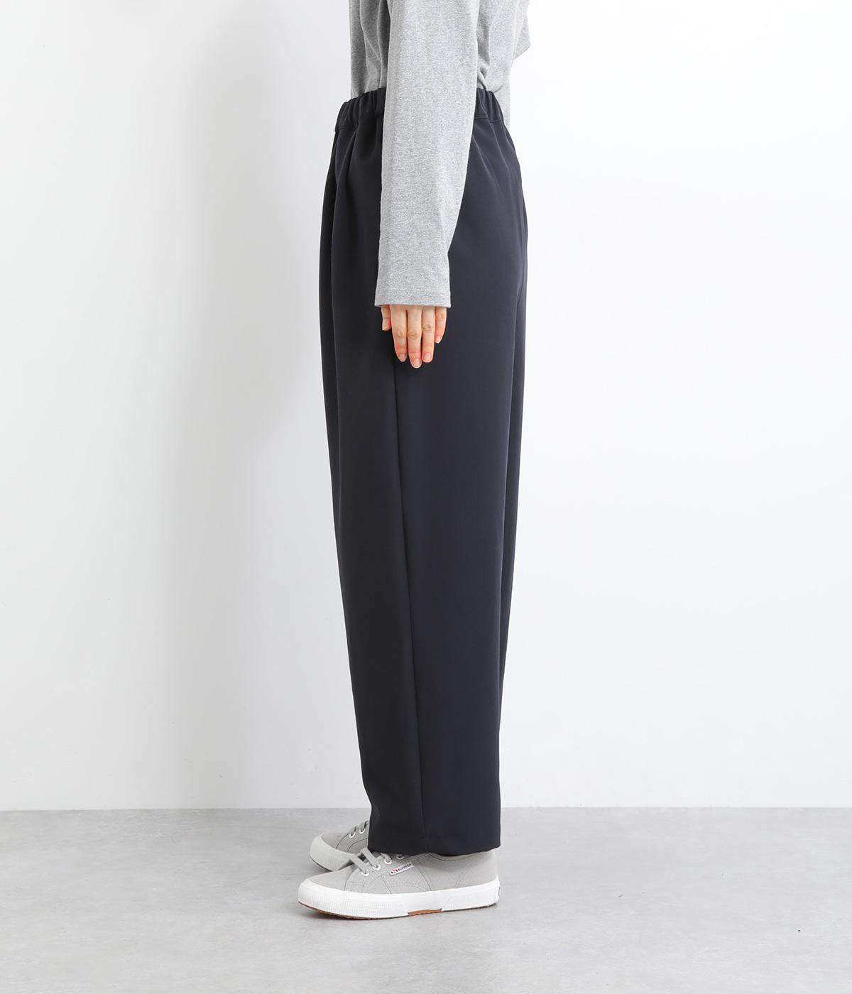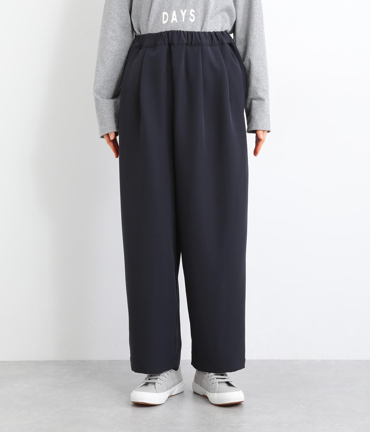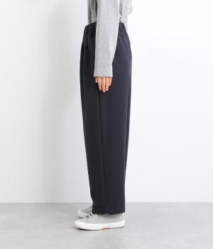 ウエスト部分にタックを入れ、裾に向かって細くなるテーパードシルエットのパンツ。体のラインを拾いにくく、ラフな印象になりすぎないのが魅力です。ウエストにはゴムと紐をぐるりと通し、ストレスフリーな着用感にもこだわりました。