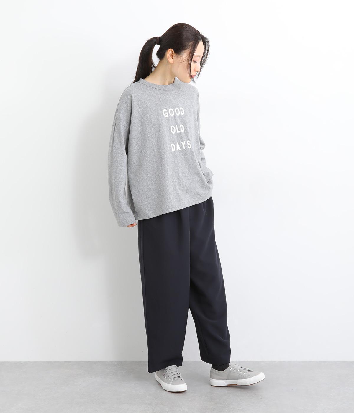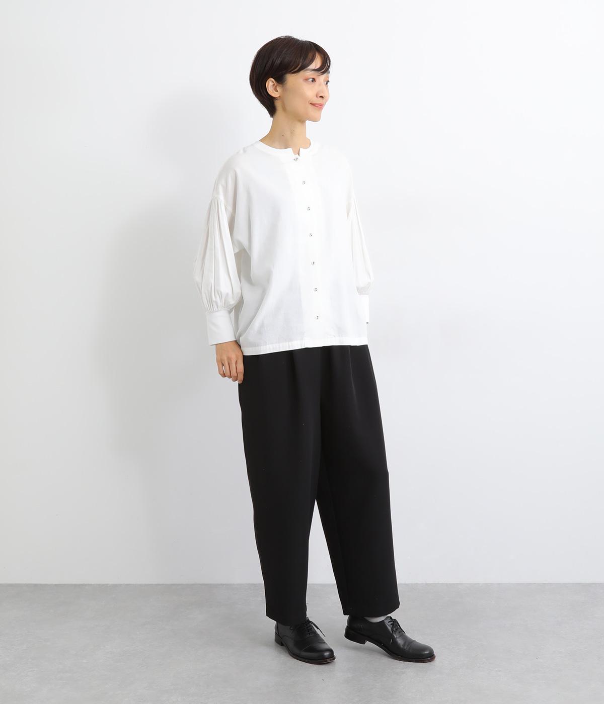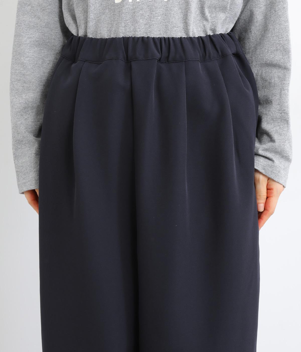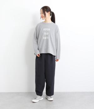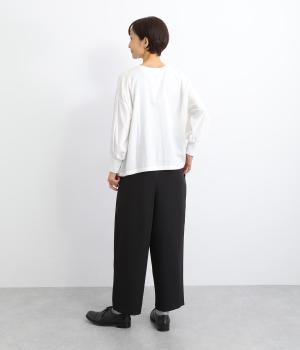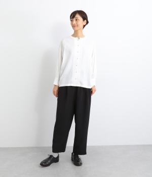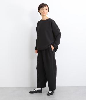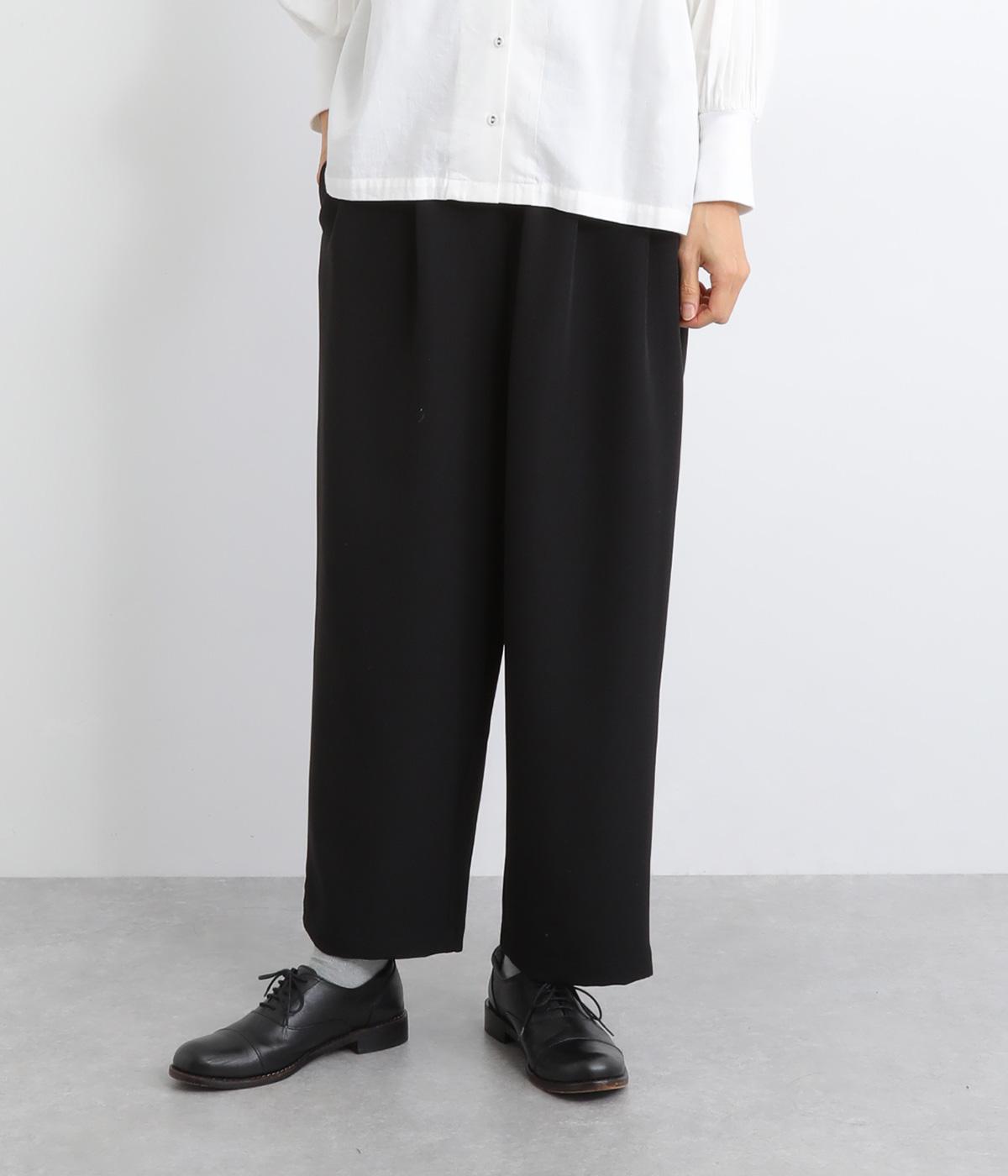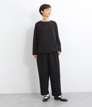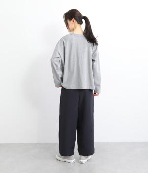 ウエスト部分にタックを入れ、裾に向かって細くなるテーパードシルエットのパンツ。体のラインを拾いにくく、ラフな印象になりすぎないのが魅力です。ウエストにはゴムと紐をぐるりと通し、ストレスフリーな着用感にもこだわりました。