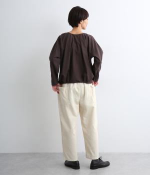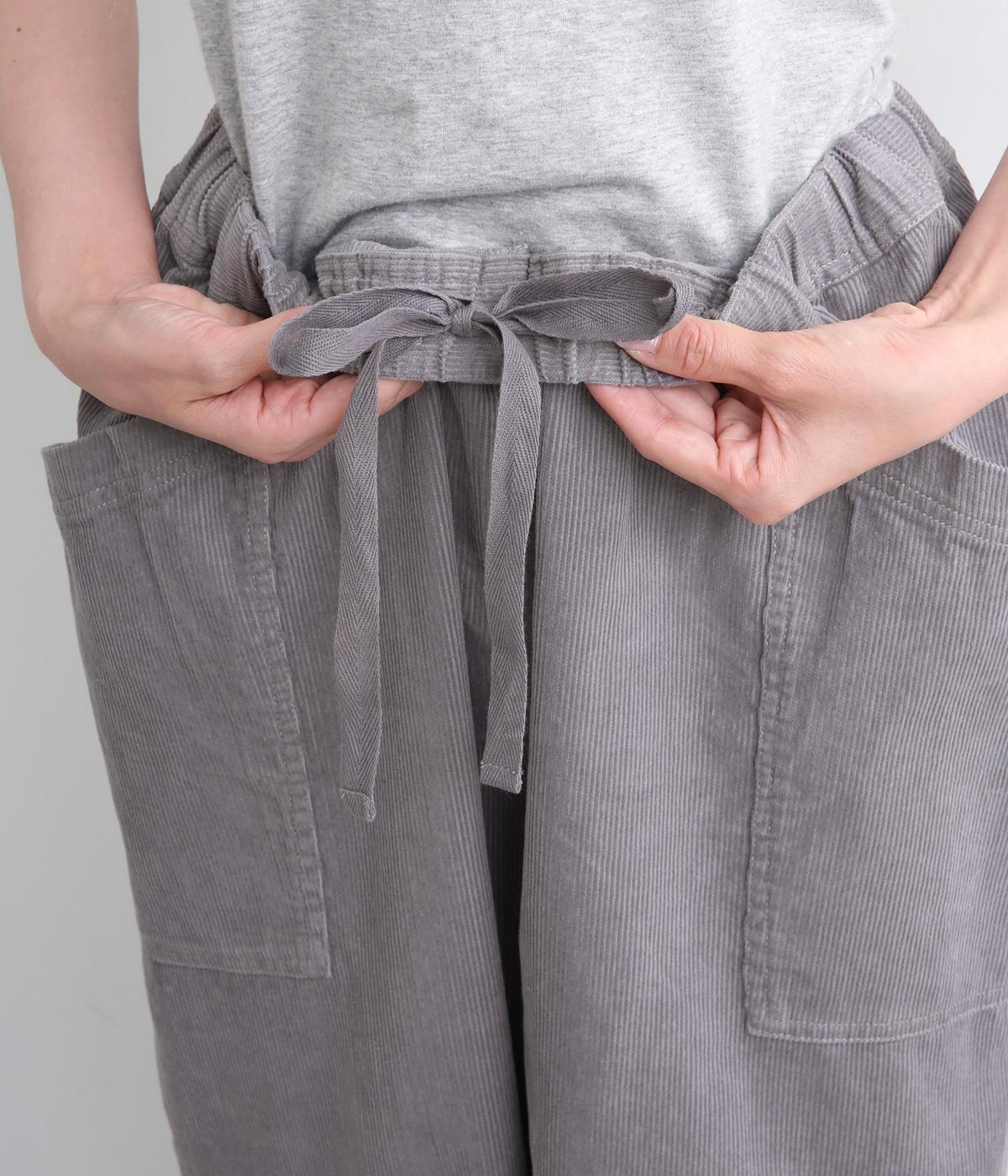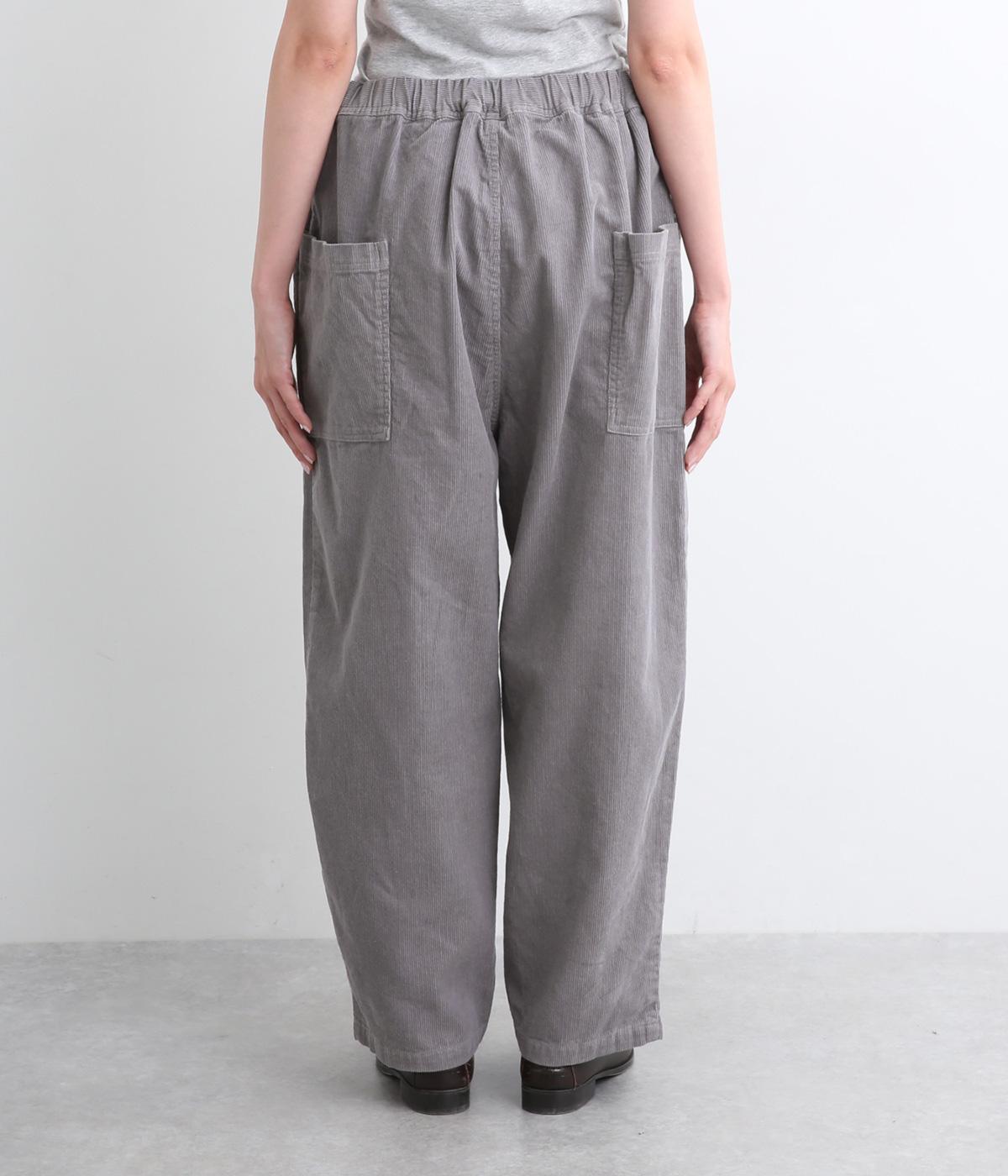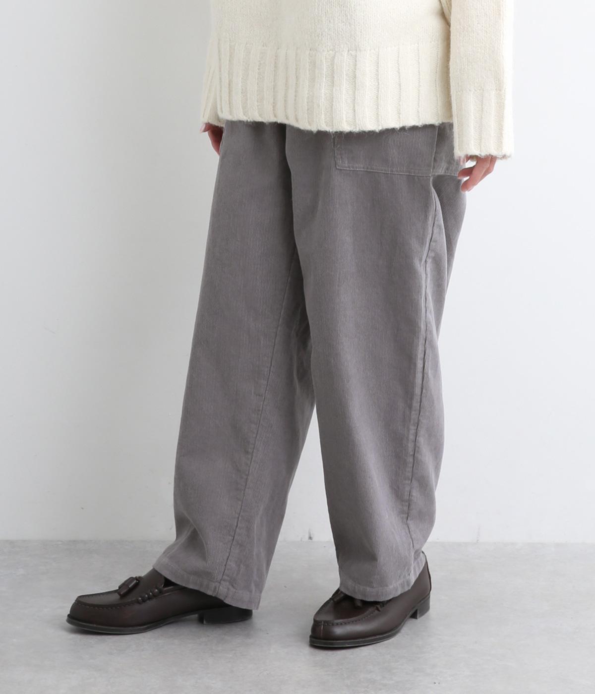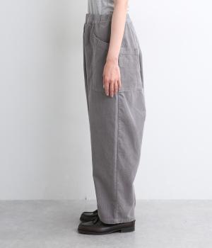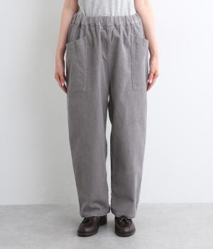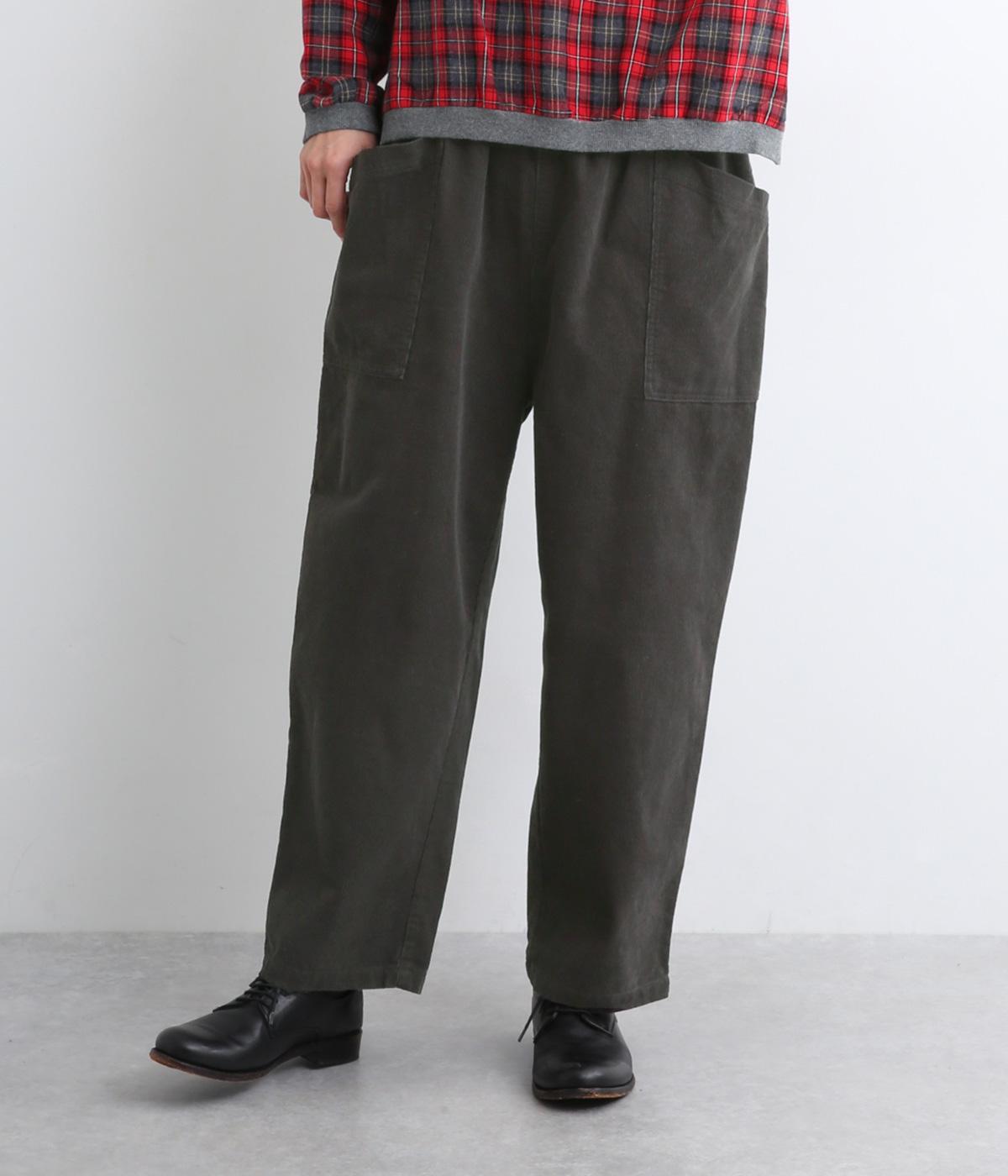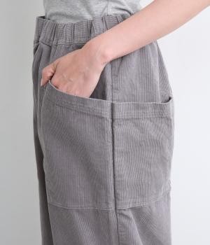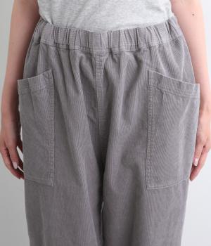 装いに季節感を与えるコーデュロイパンツ。ヒップや太ももに大きくゆとりを持たせたワイドシルエットと、サイドの大きなポケットがワーク感を漂わせます。ウエストは総ゴム仕様で、フィット感を調整できる内紐をプラスしました。