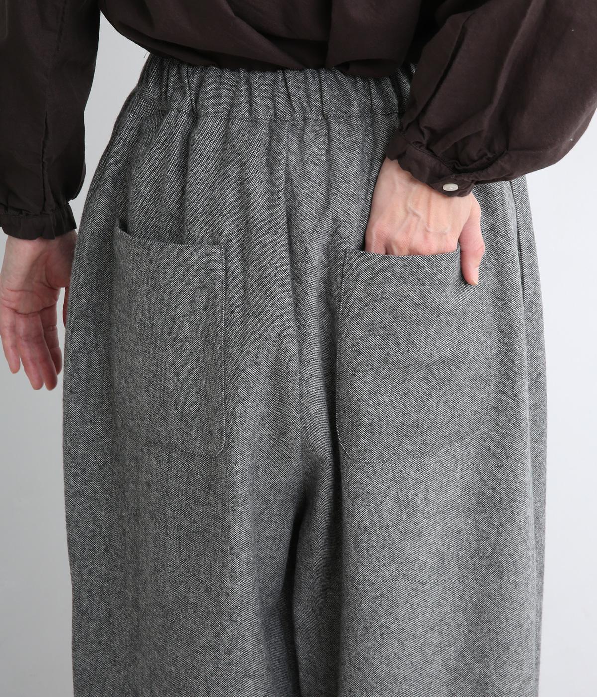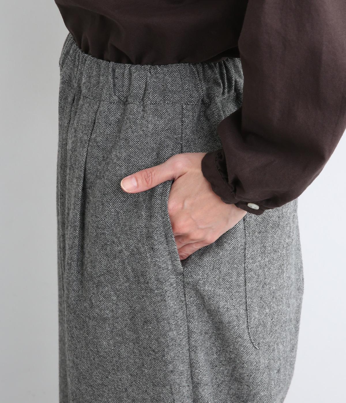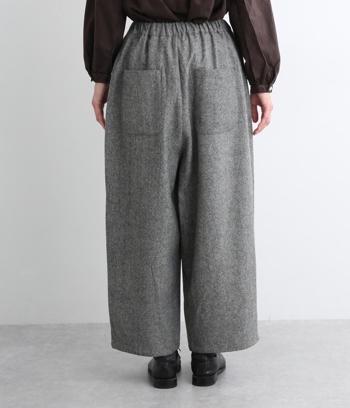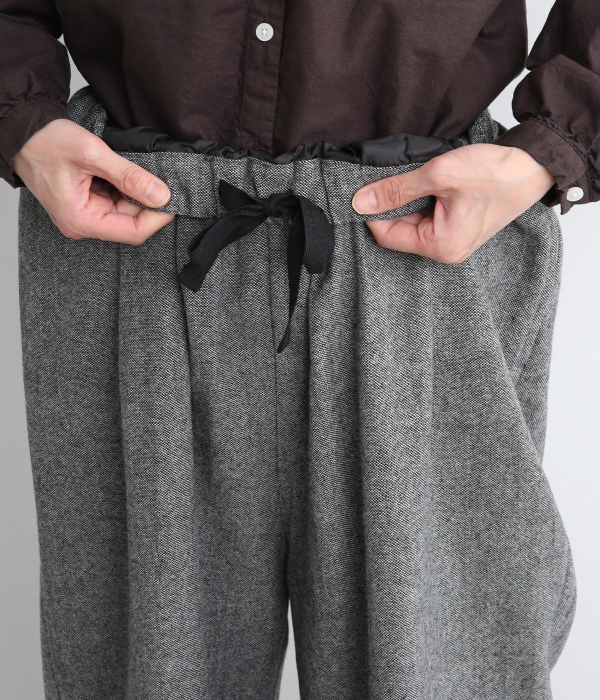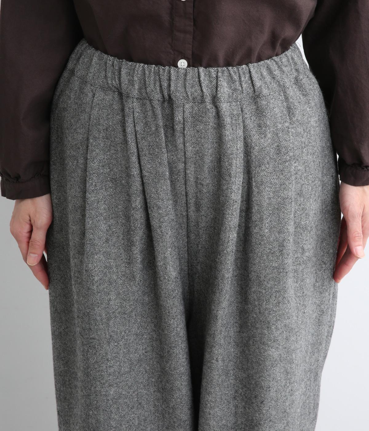 前ウエスト下のタックから流れるドレープが目を引くワイドパンツ。こだわりのツイード生地で、ゆったりとしたシルエットながらも上品な印象に仕上げました。大きなヒップポケットのほか、両サイドにも便利なポケットつき。ウエストにはゴムと紐をぐるりと通しています。