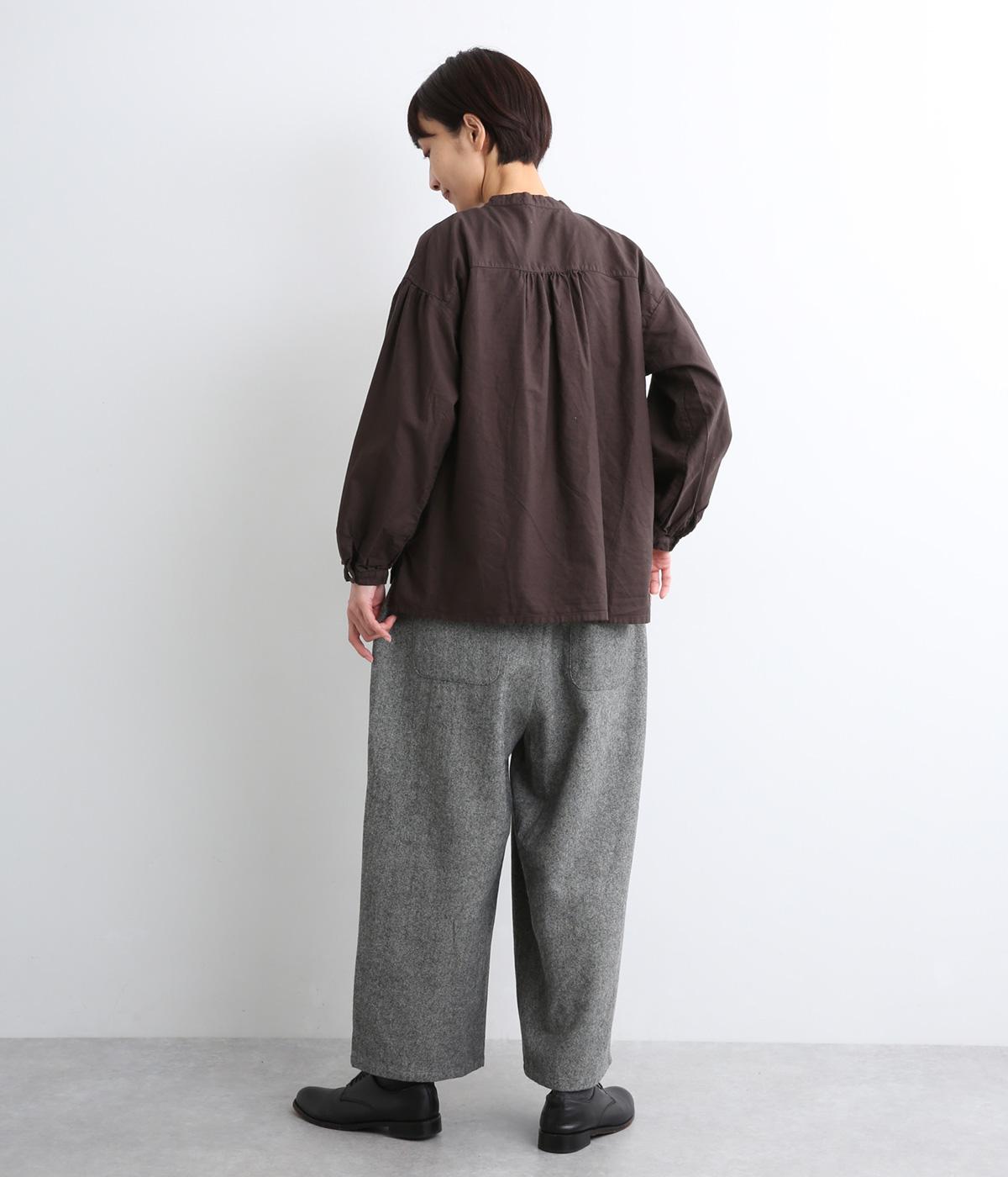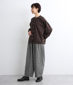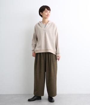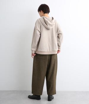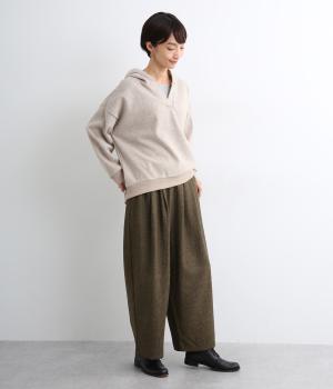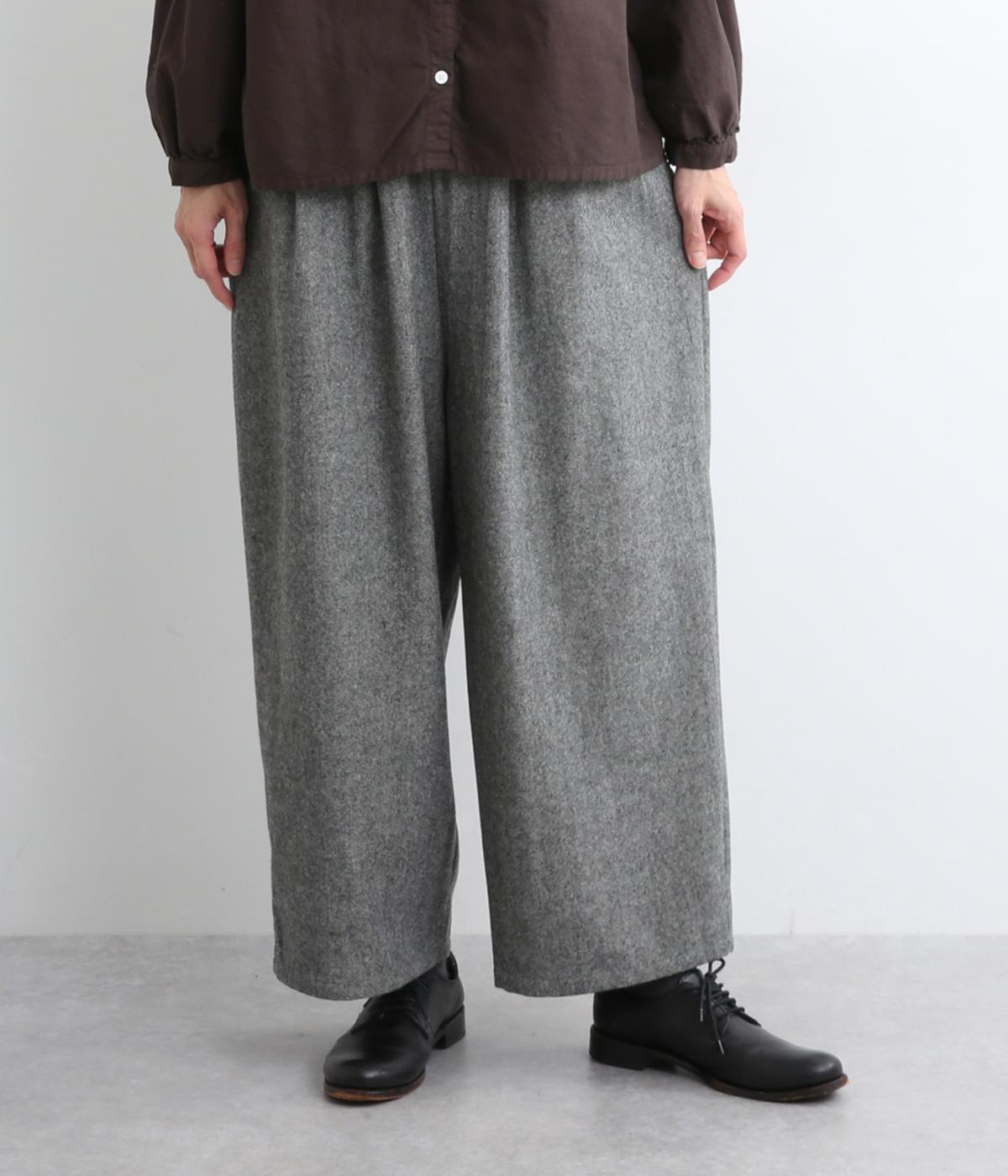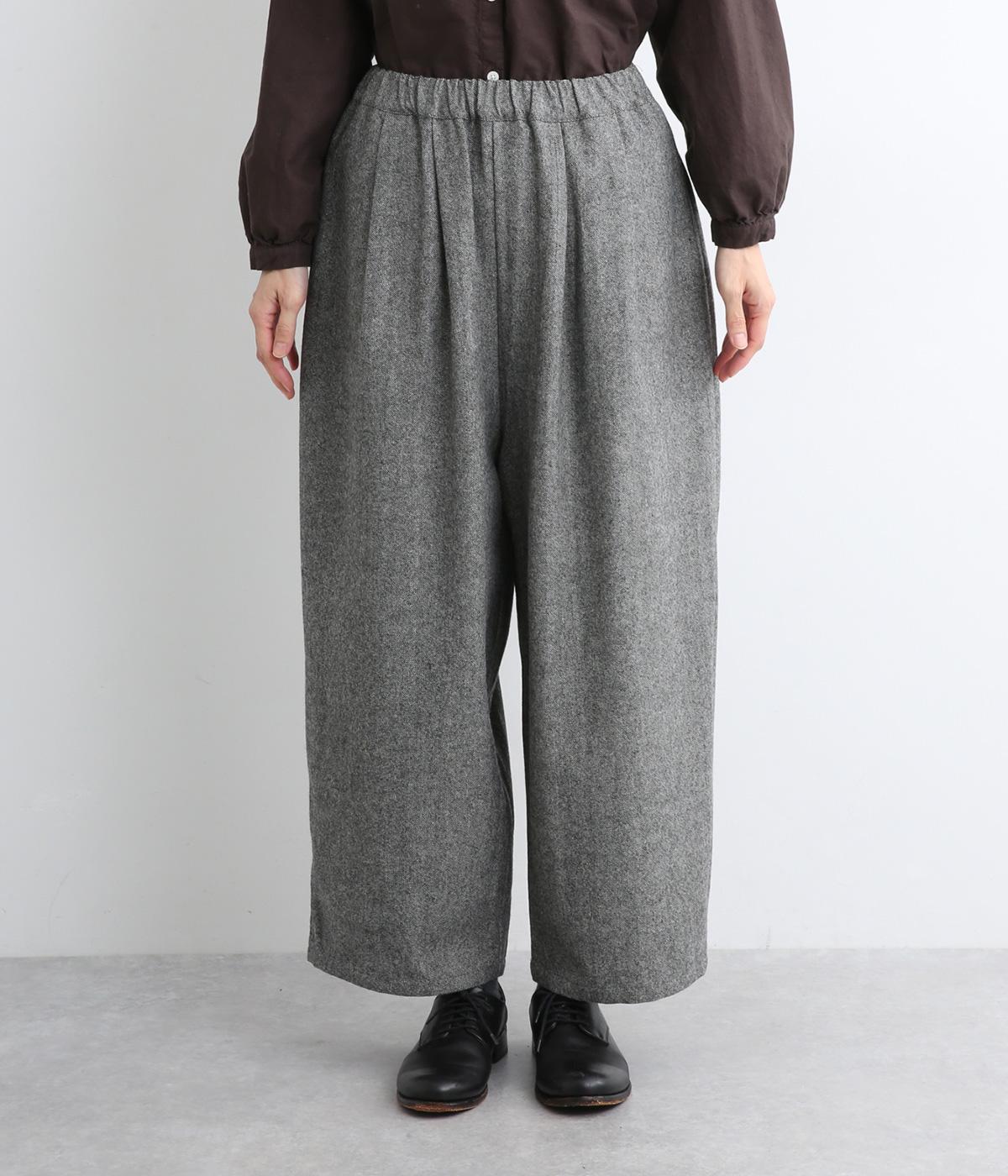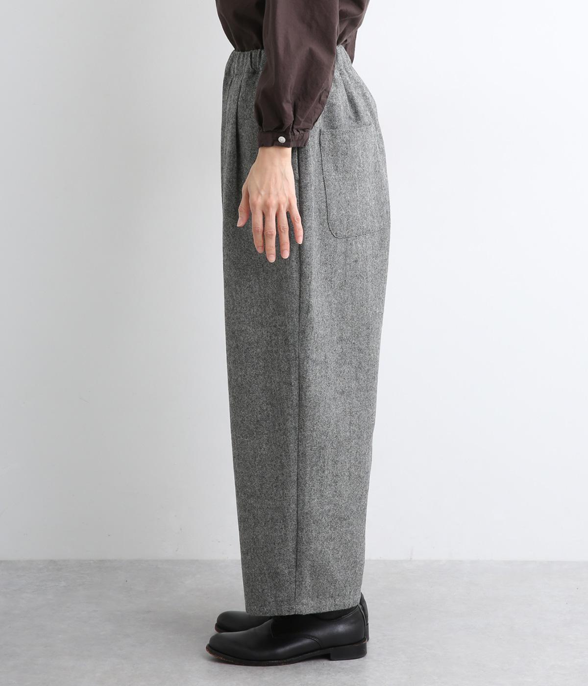 前ウエスト下のタックから流れるドレープが目を引くワイドパンツ。こだわりのツイード生地で、ゆったりとしたシルエットながらも上品な印象に仕上げました。大きなヒップポケットのほか、両サイドにも便利なポケットつき。ウエストにはゴムと紐をぐるりと通しています。