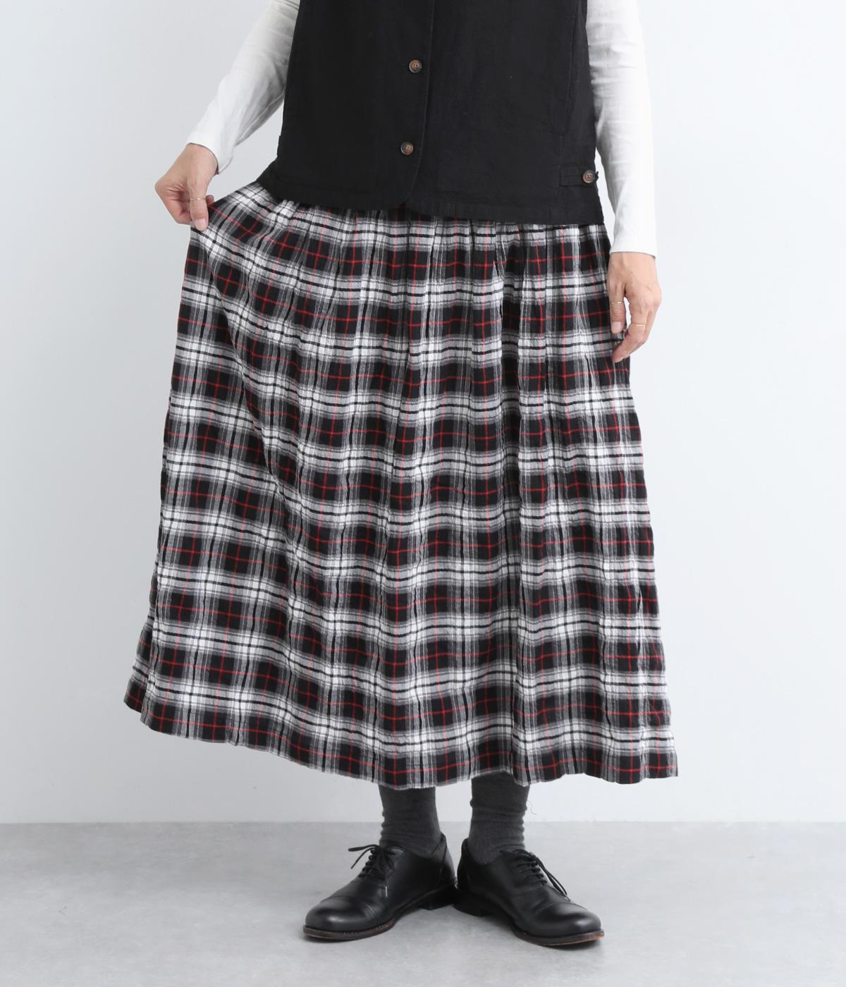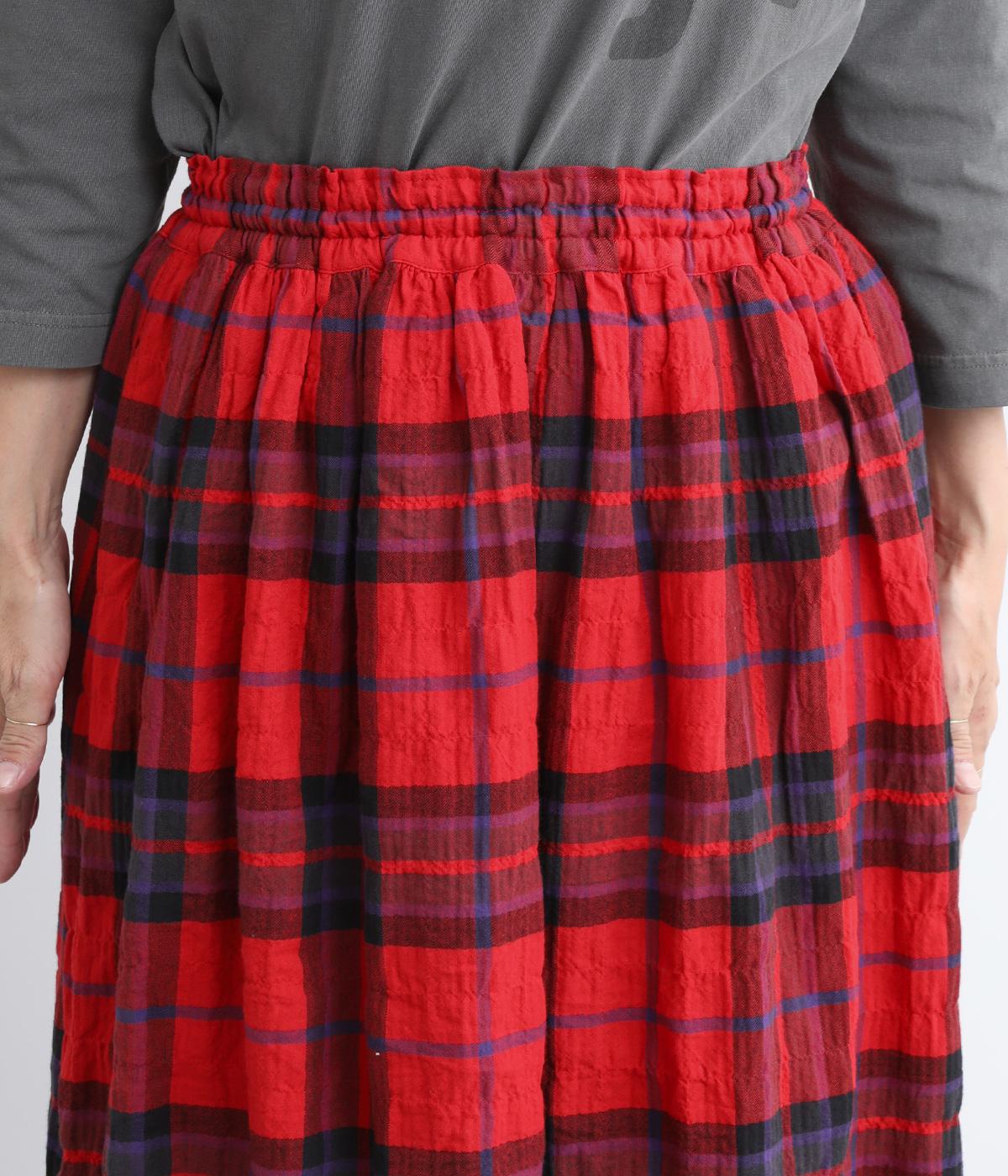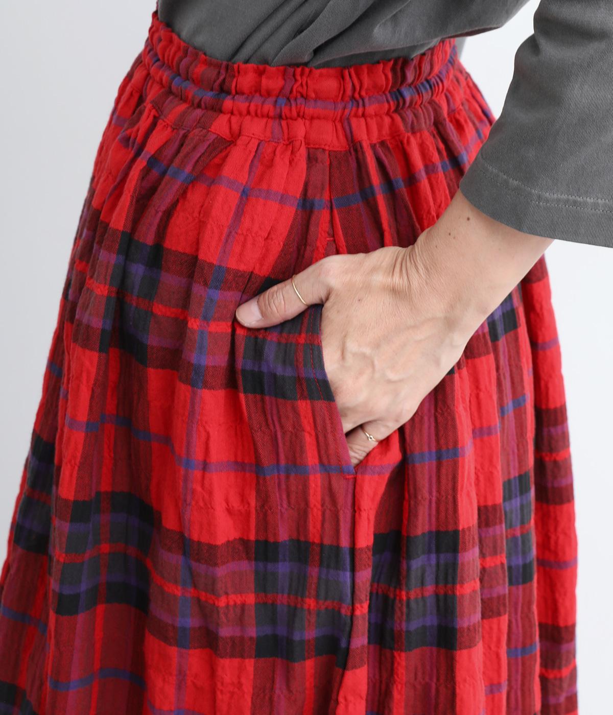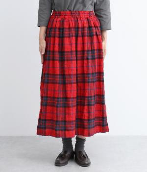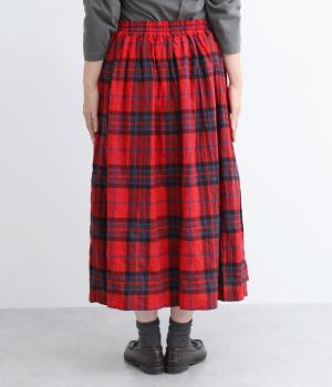 ウエストギャザーで動きのあるふんわりとしたシルエットに仕立てました。広がりすぎないロング丈で大人のカジュアルスタイルのワンポイントに活躍。ウエスト総ゴム仕様ではき心地も良く、内紐で微調整も可能です。