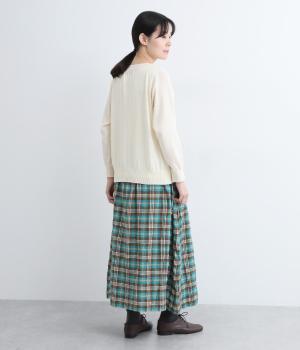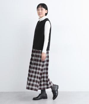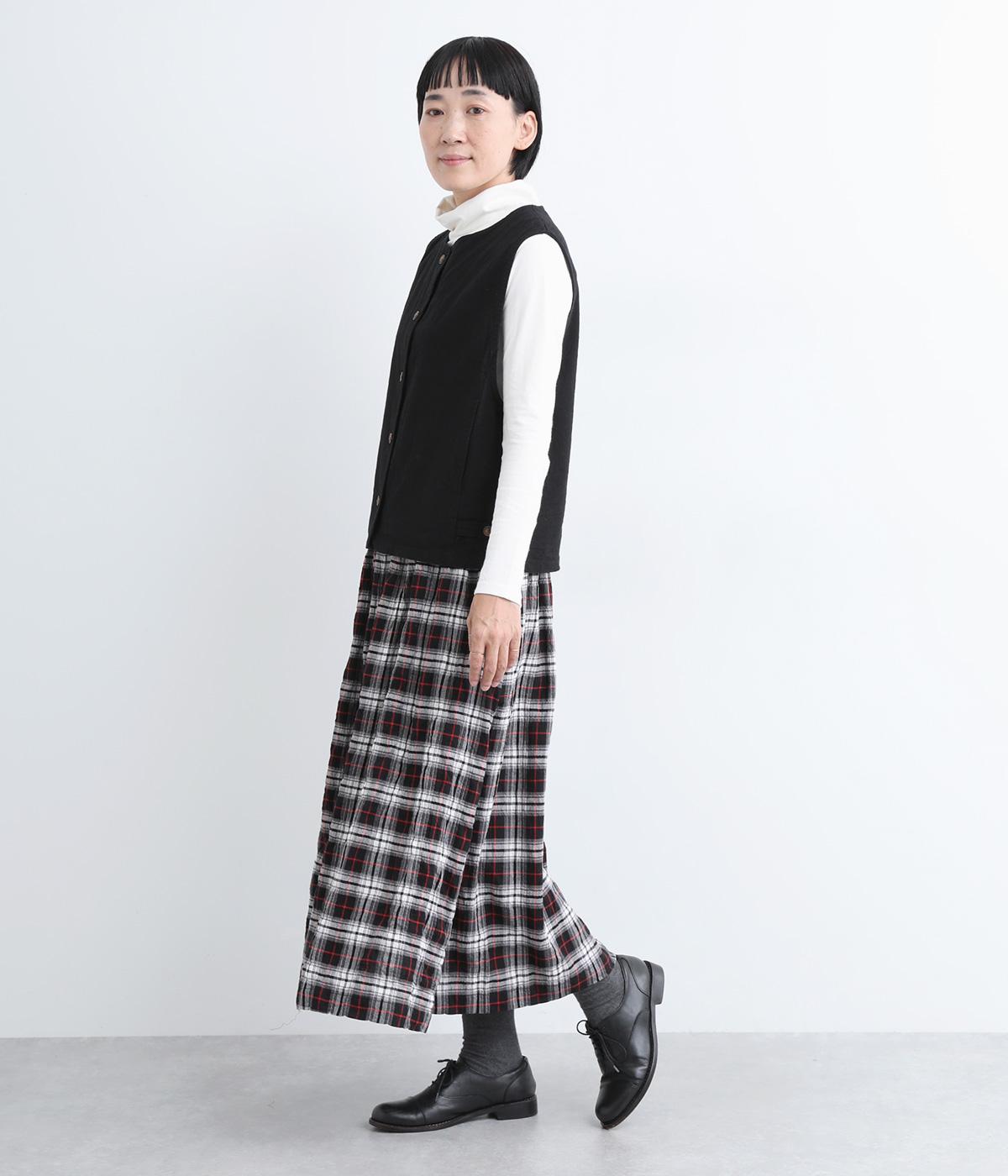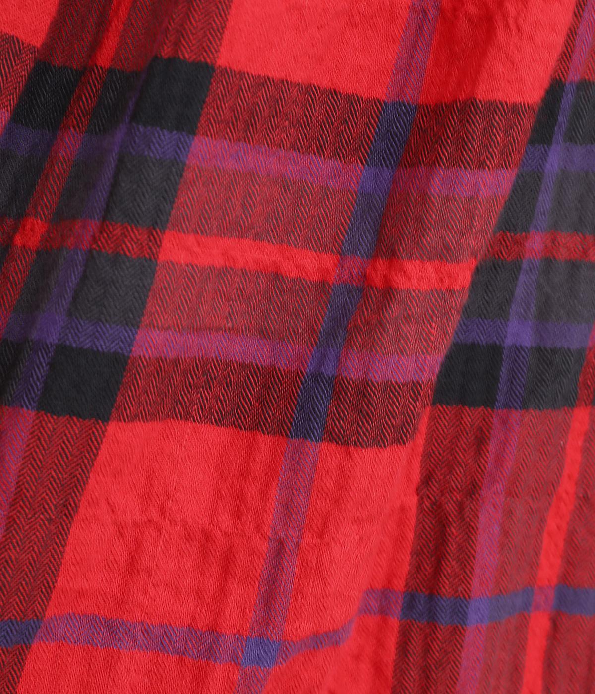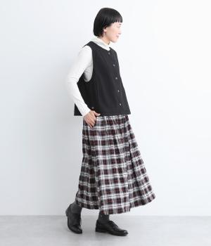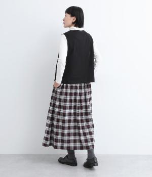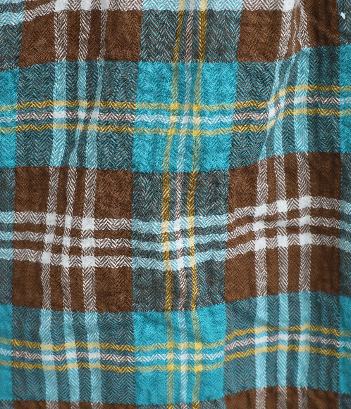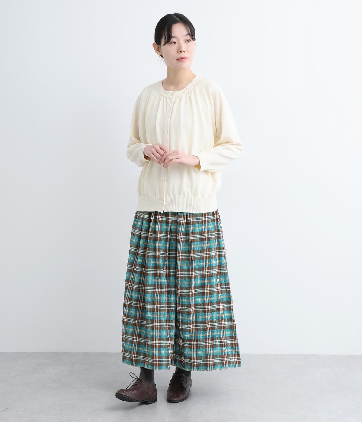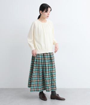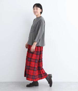 ヘリンボーン織りとチェック柄を組み合わせた、着こなしのアイキャッチになる生地を使用。シャーリング加工がほどこされており、自然な立体感やナチュラルな風合いを演出しています。