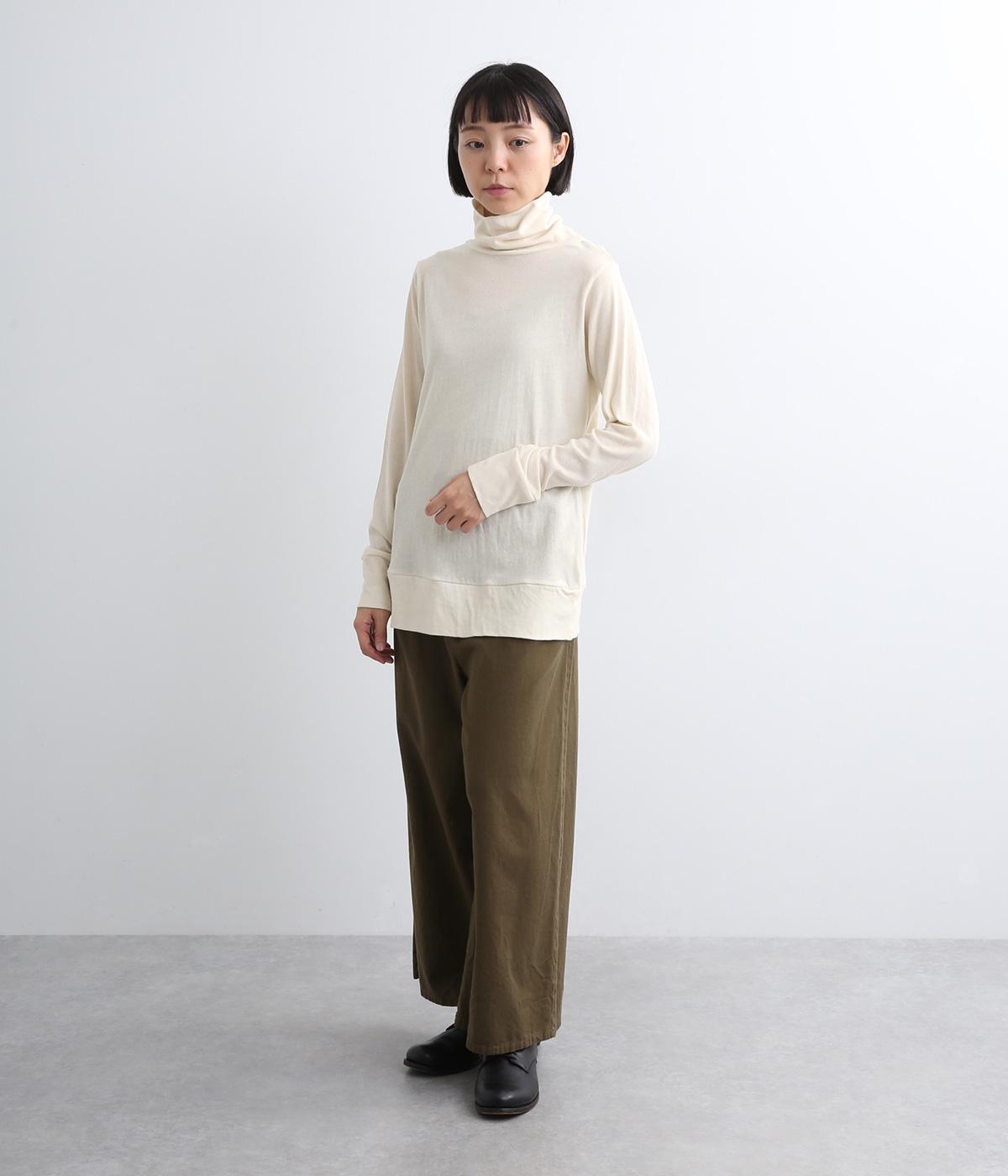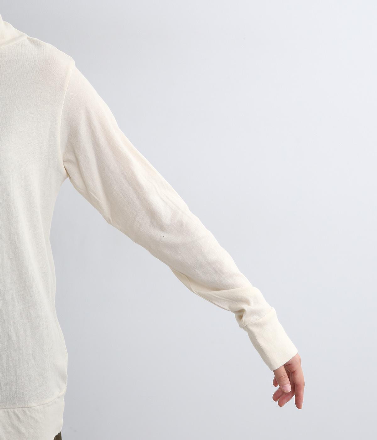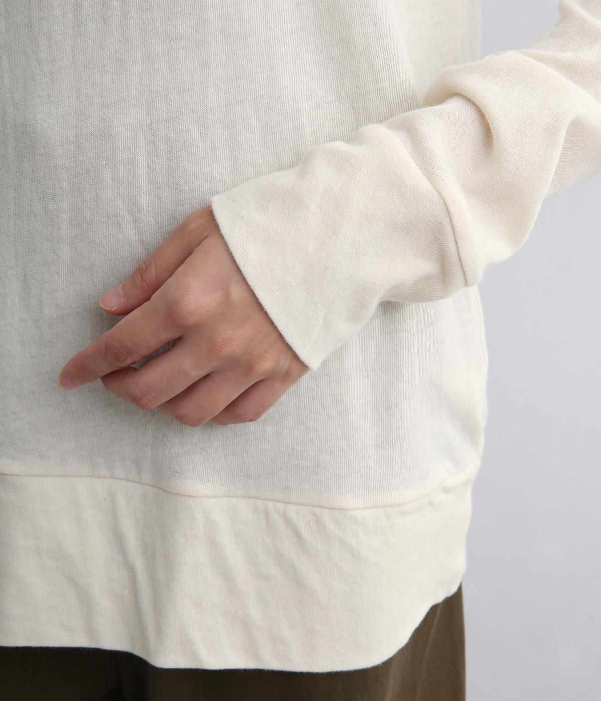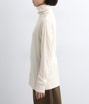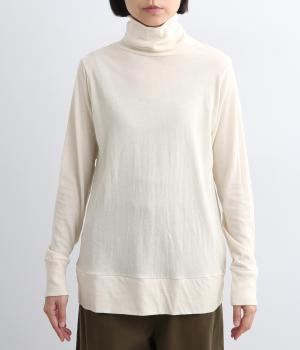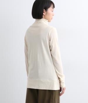 ふわりとやわらかな肌触りが極上の着心地を生む、甘く編んだコットンガーゼ天竺を使用。適度な肉感があり、使い勝手のいい薄手なのでインナーにするなど着まわしのきく生地感です。