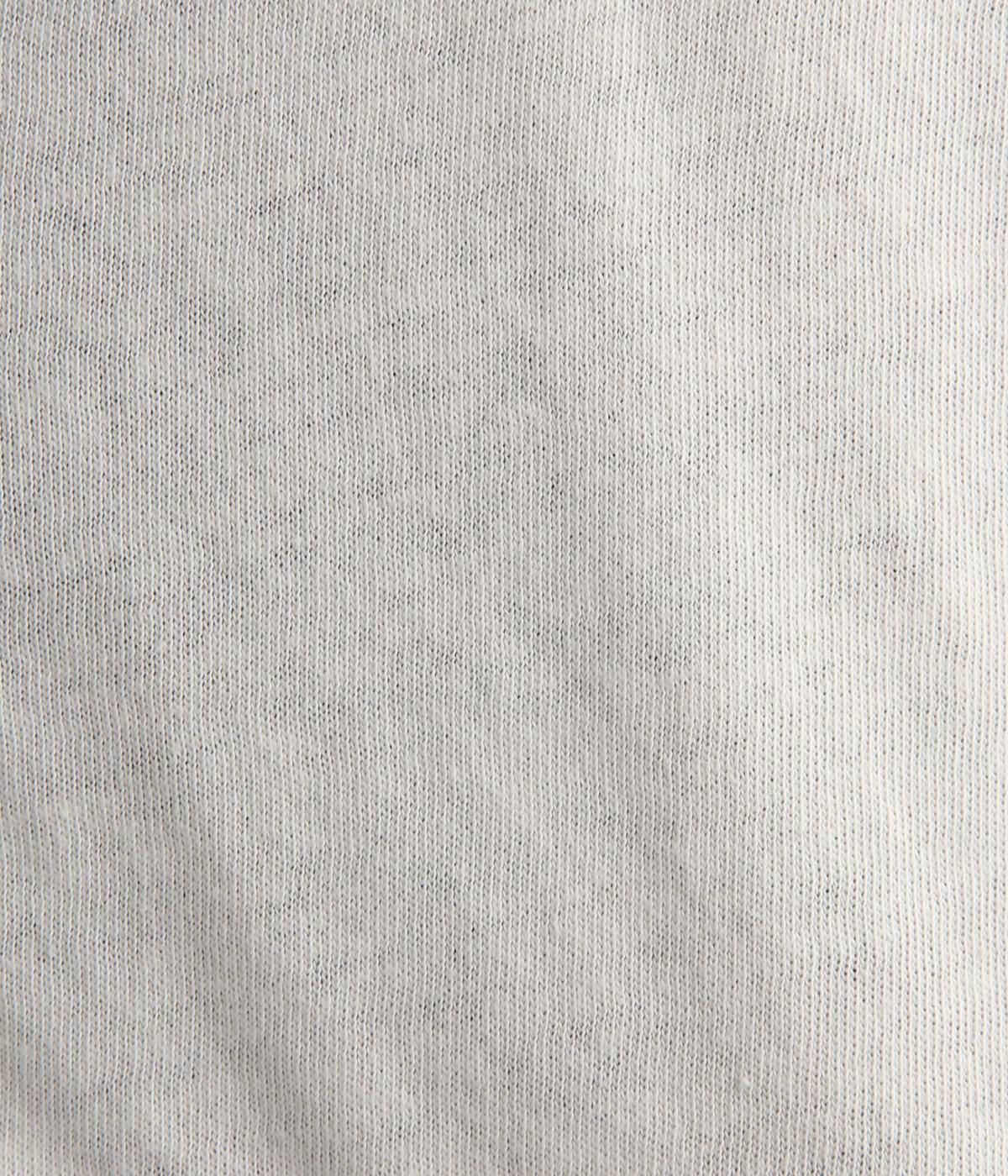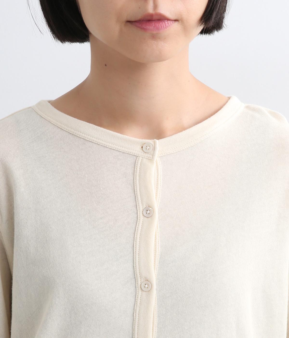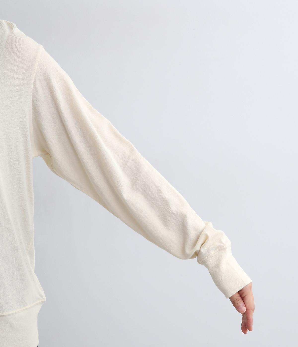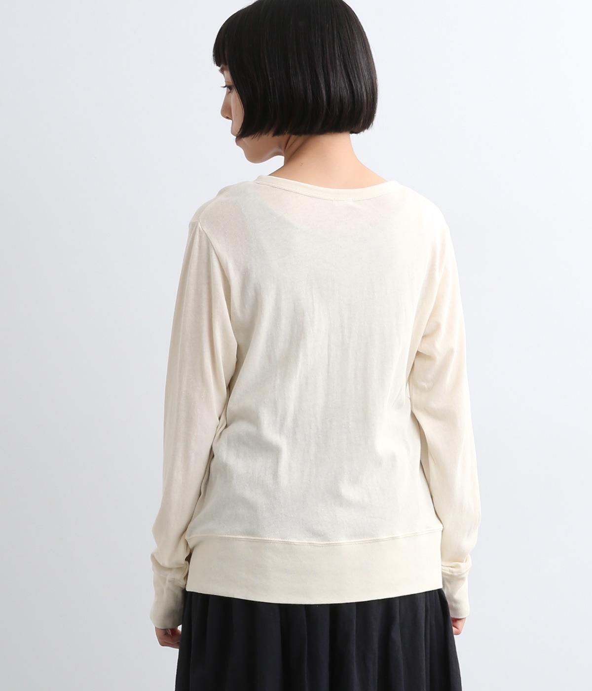 ふわりとやわらかな肌触りが極上の着心地を生む、甘く編んだコットンガーゼ天竺を使用。適度な肉感があり、使い勝手のいい薄手なのでインナーにするなど着まわしのきく生地感です。