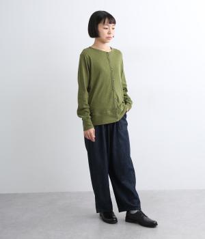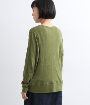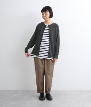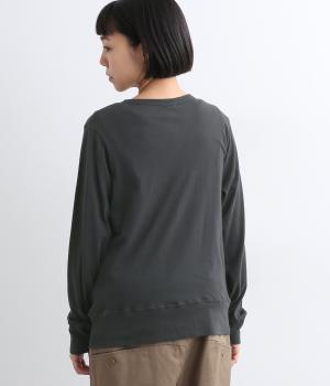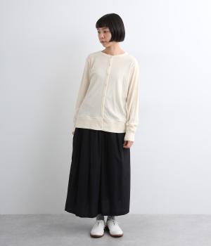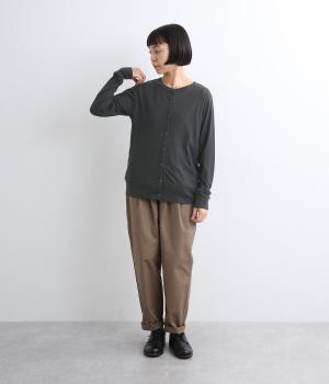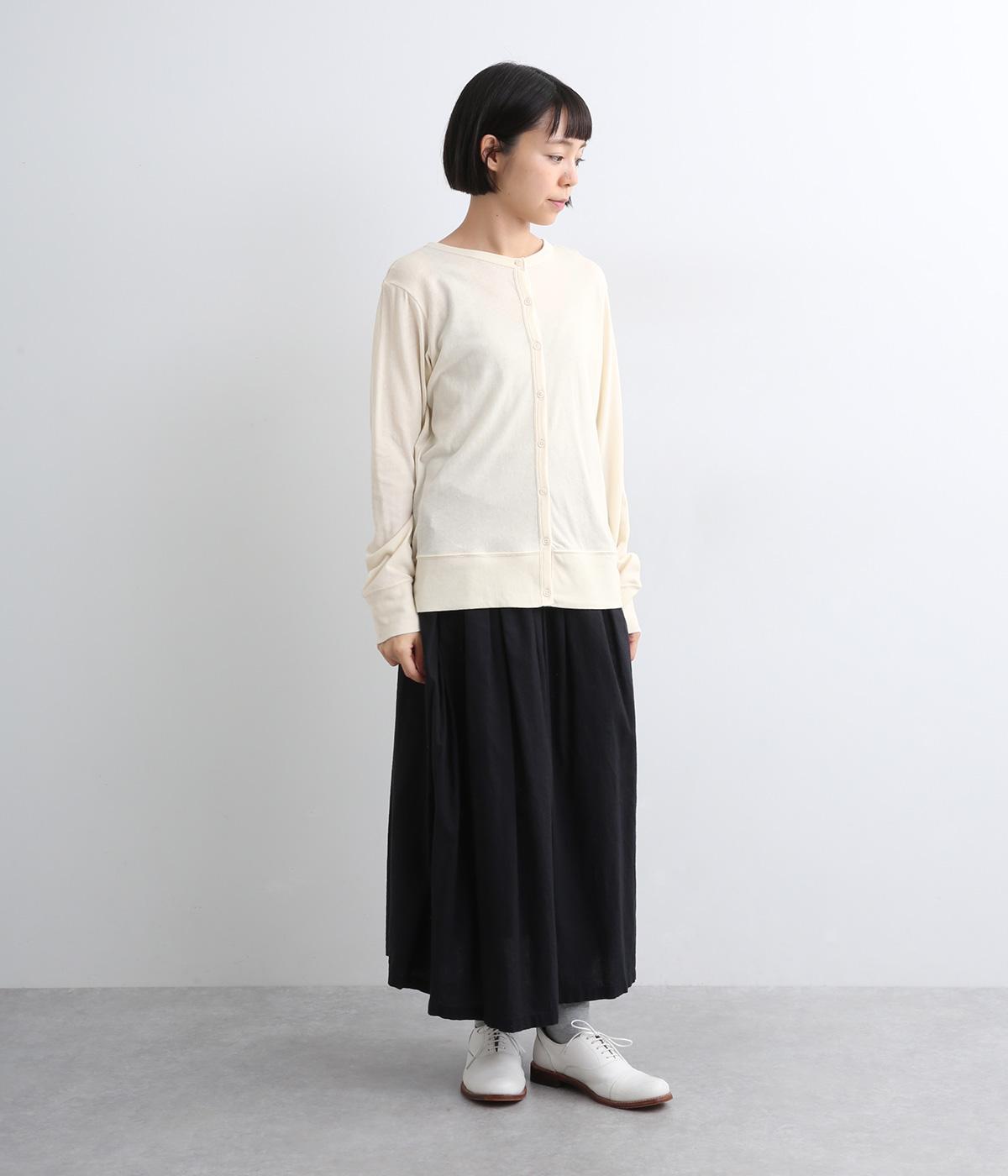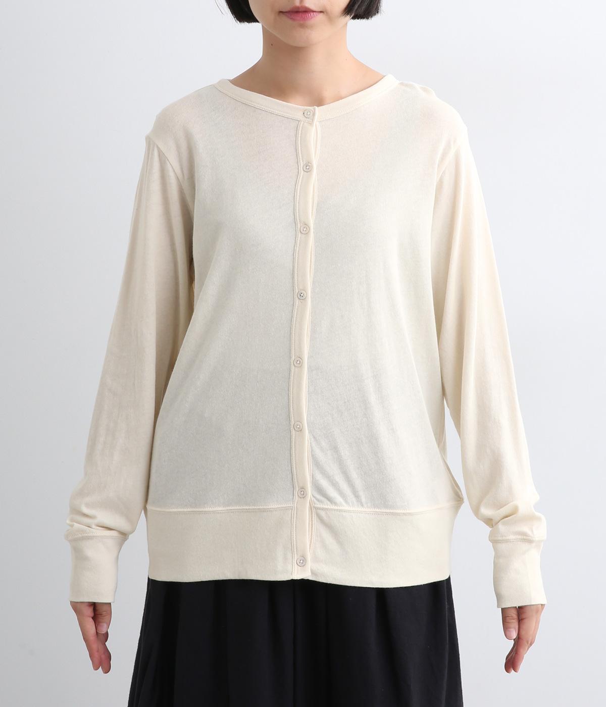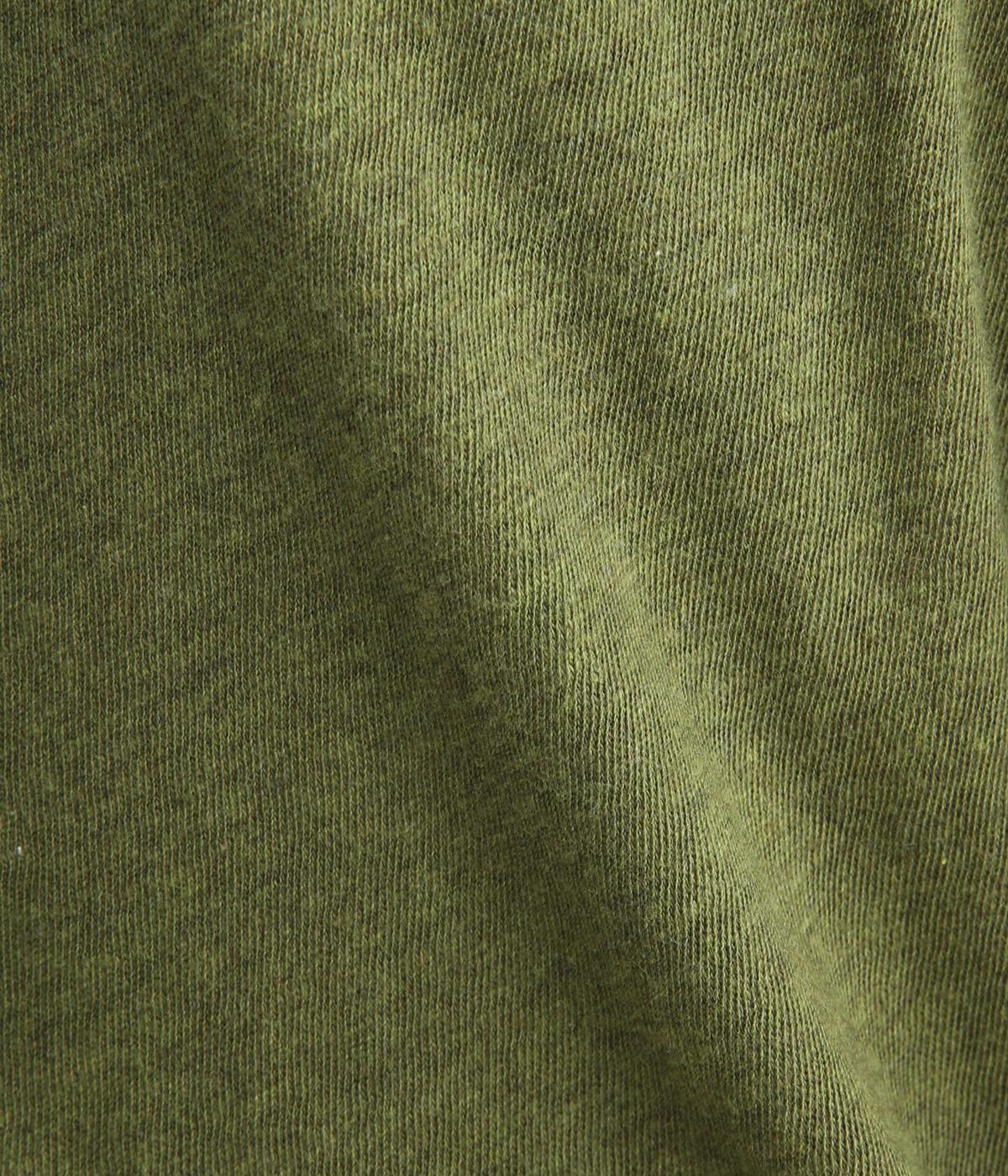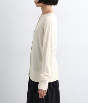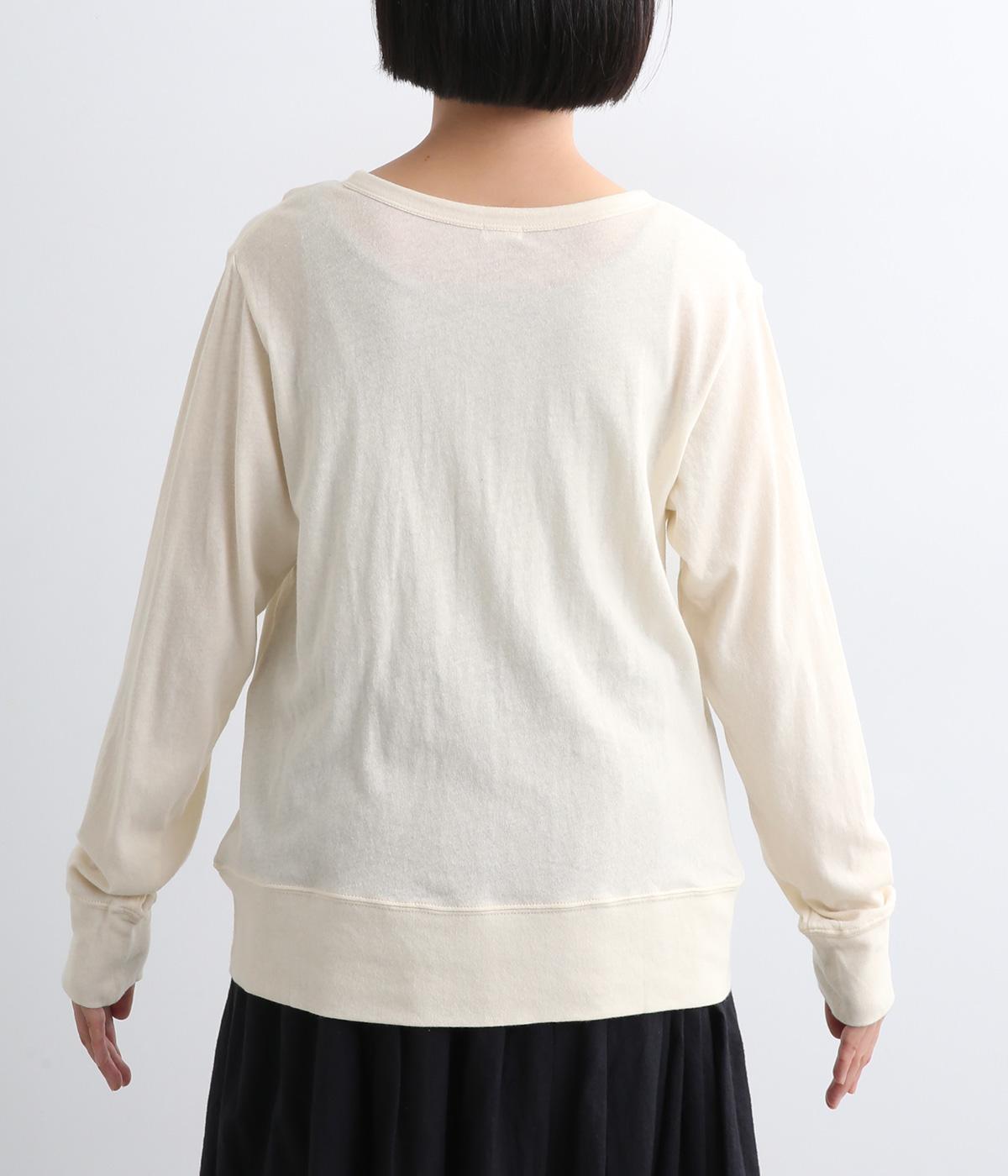ふわりとやわらかな肌触りが極上の着心地を生む、甘く編んだコットンガーゼ天竺を使用。適度な肉感があり、使い勝手のいい薄手なのでインナーにするなど着まわしのきく生地感です。