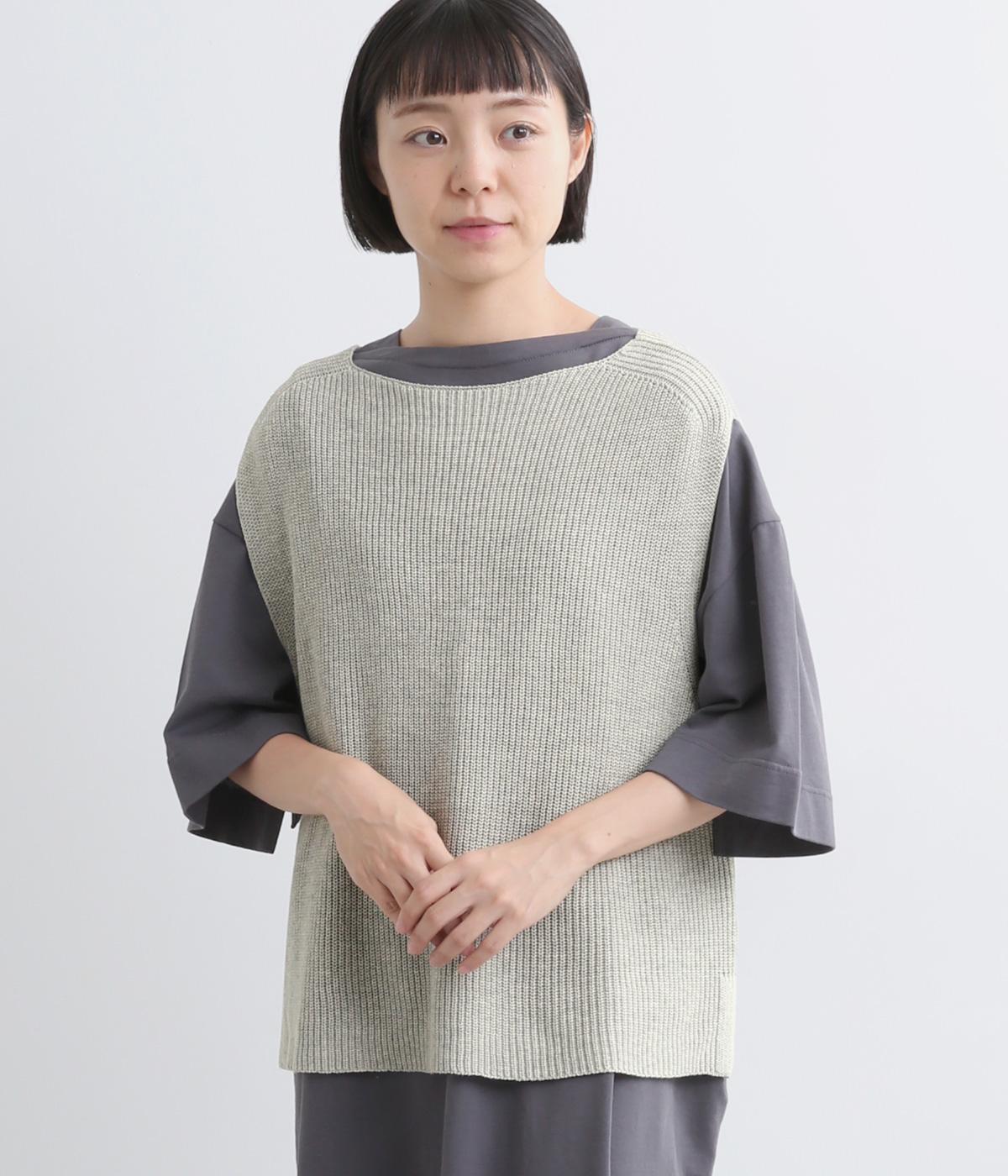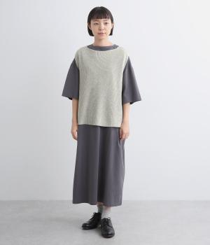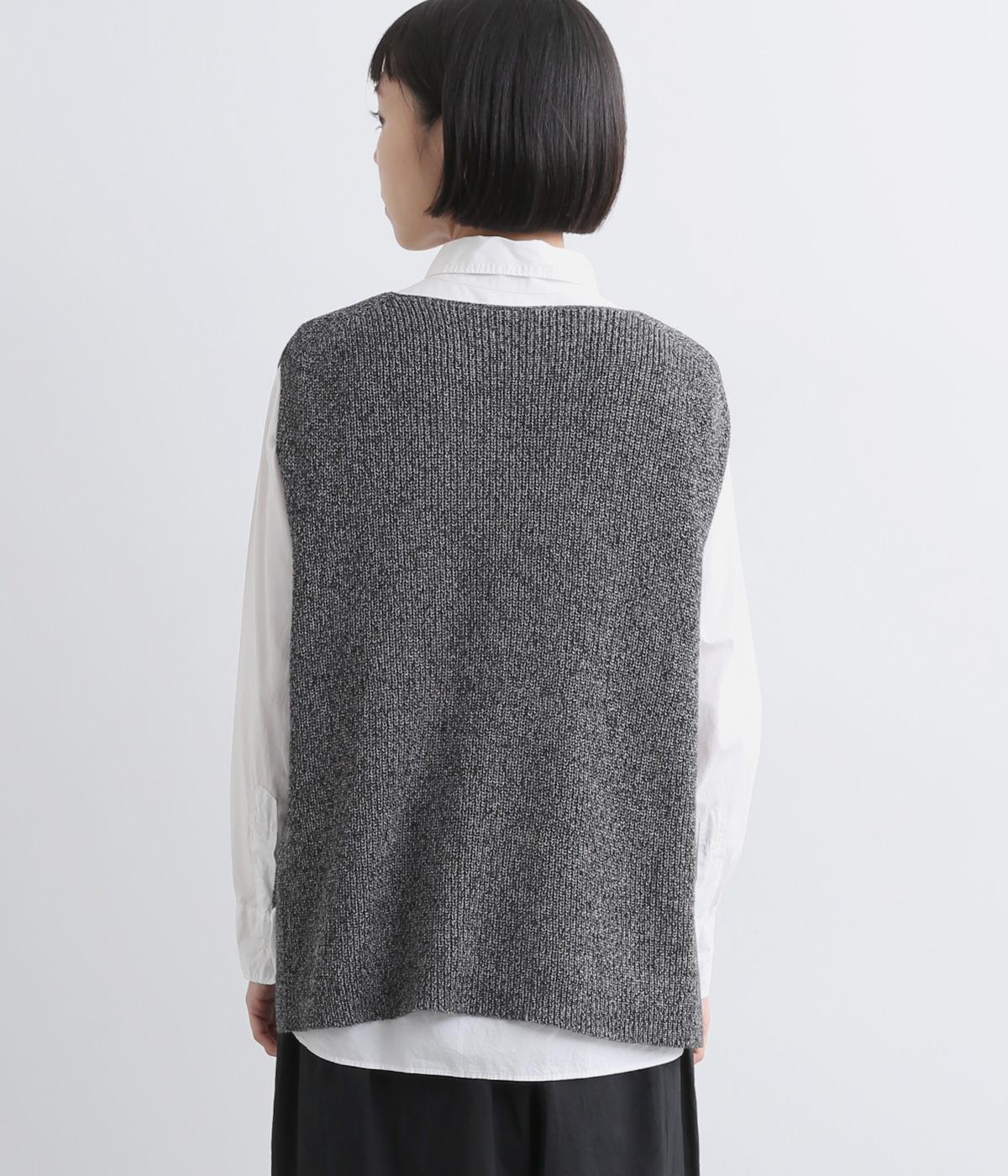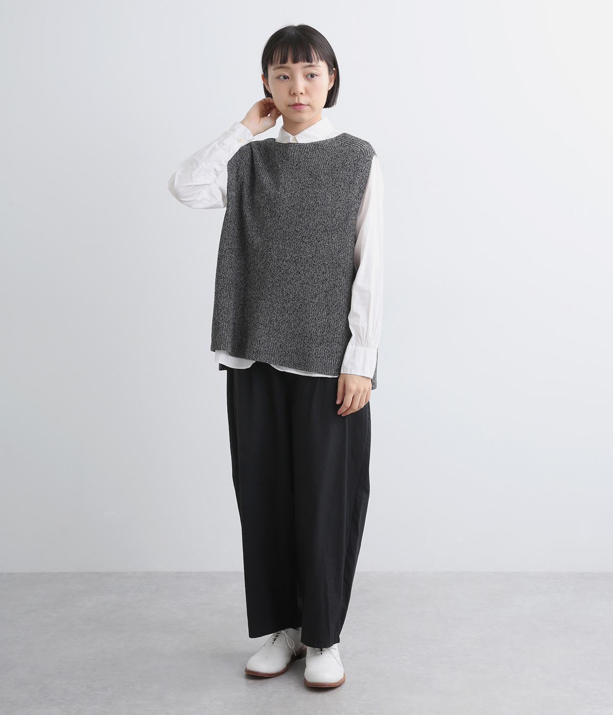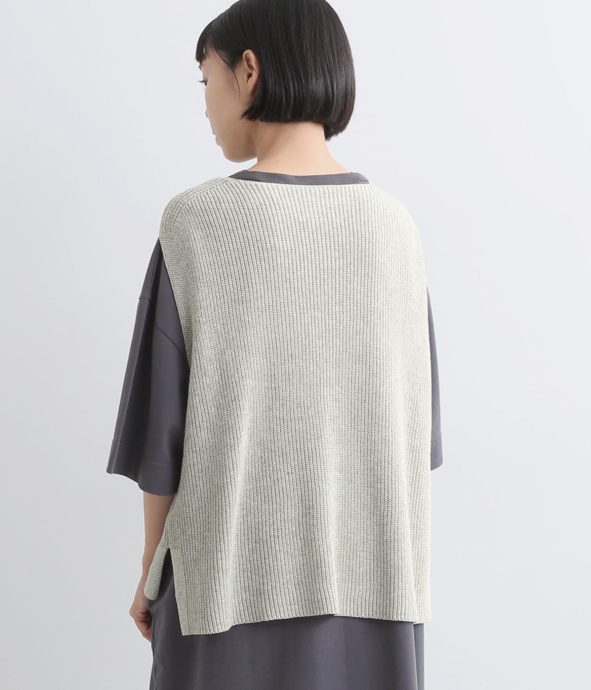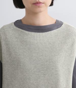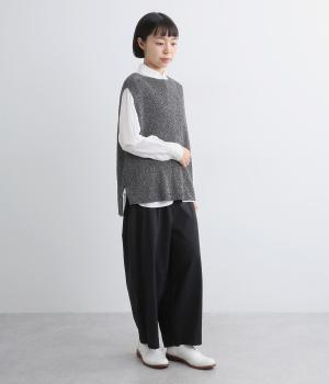ボックス型シルエットが特徴的なプルオーバータイプのベストです。横に広く開いたボートネックはインナーのチラ見せにも◎。着丈は前後差をつけスリットを入れることで、ボトム合わせもすっきり決まります。