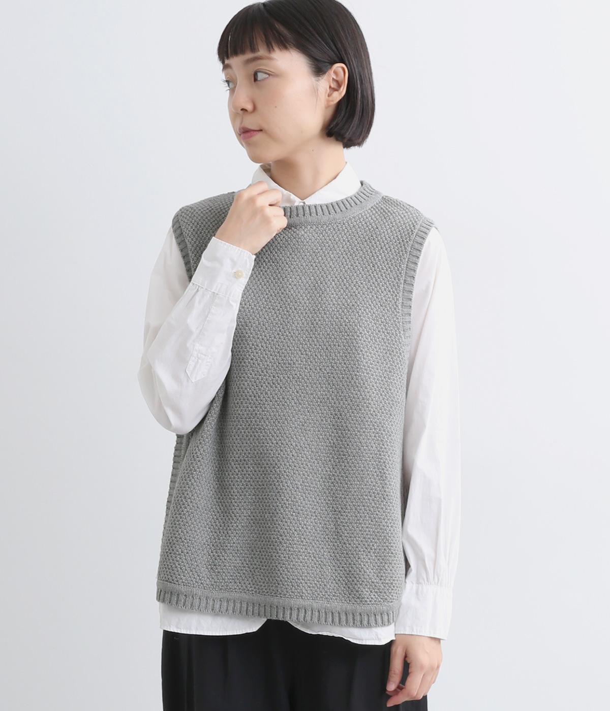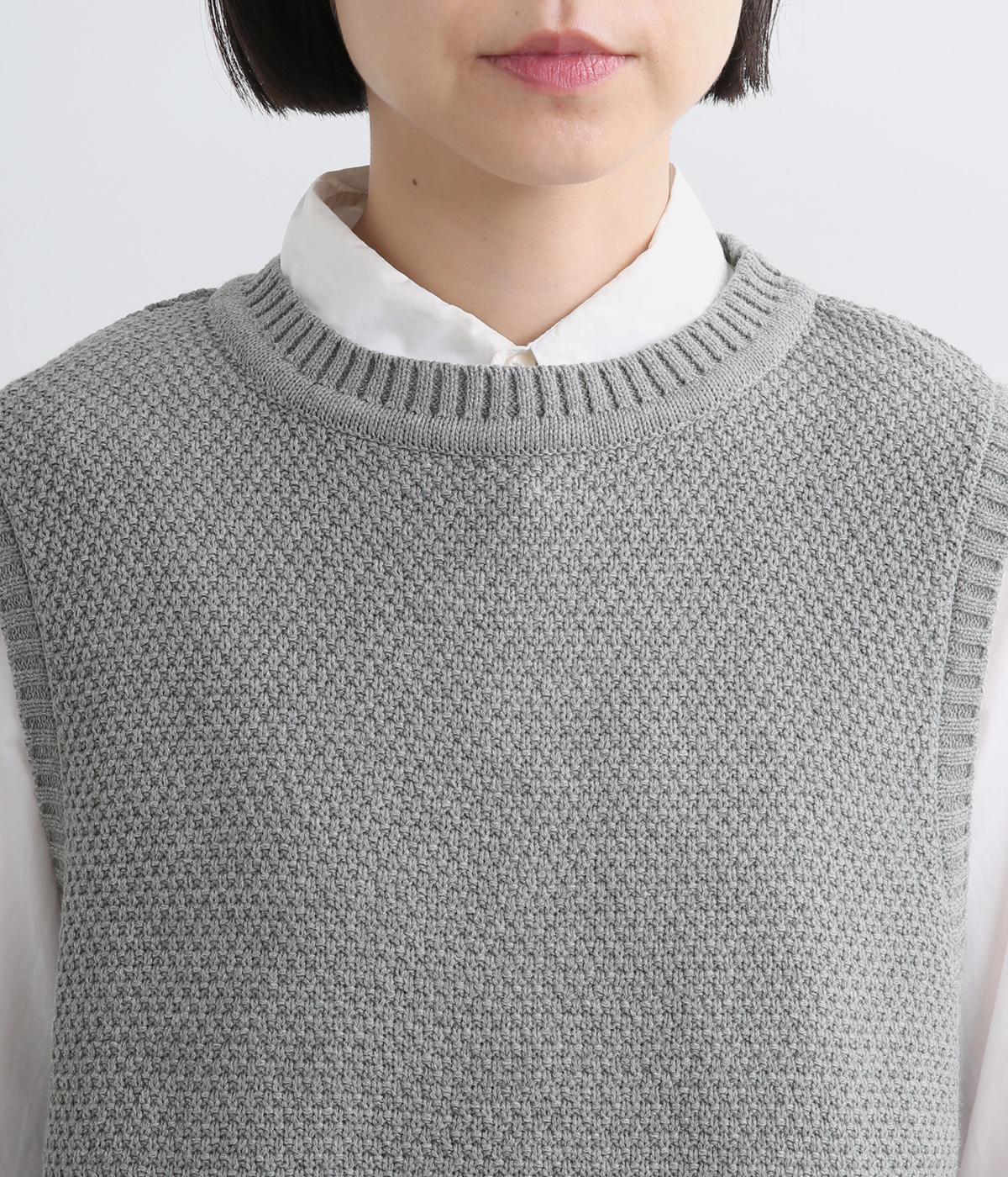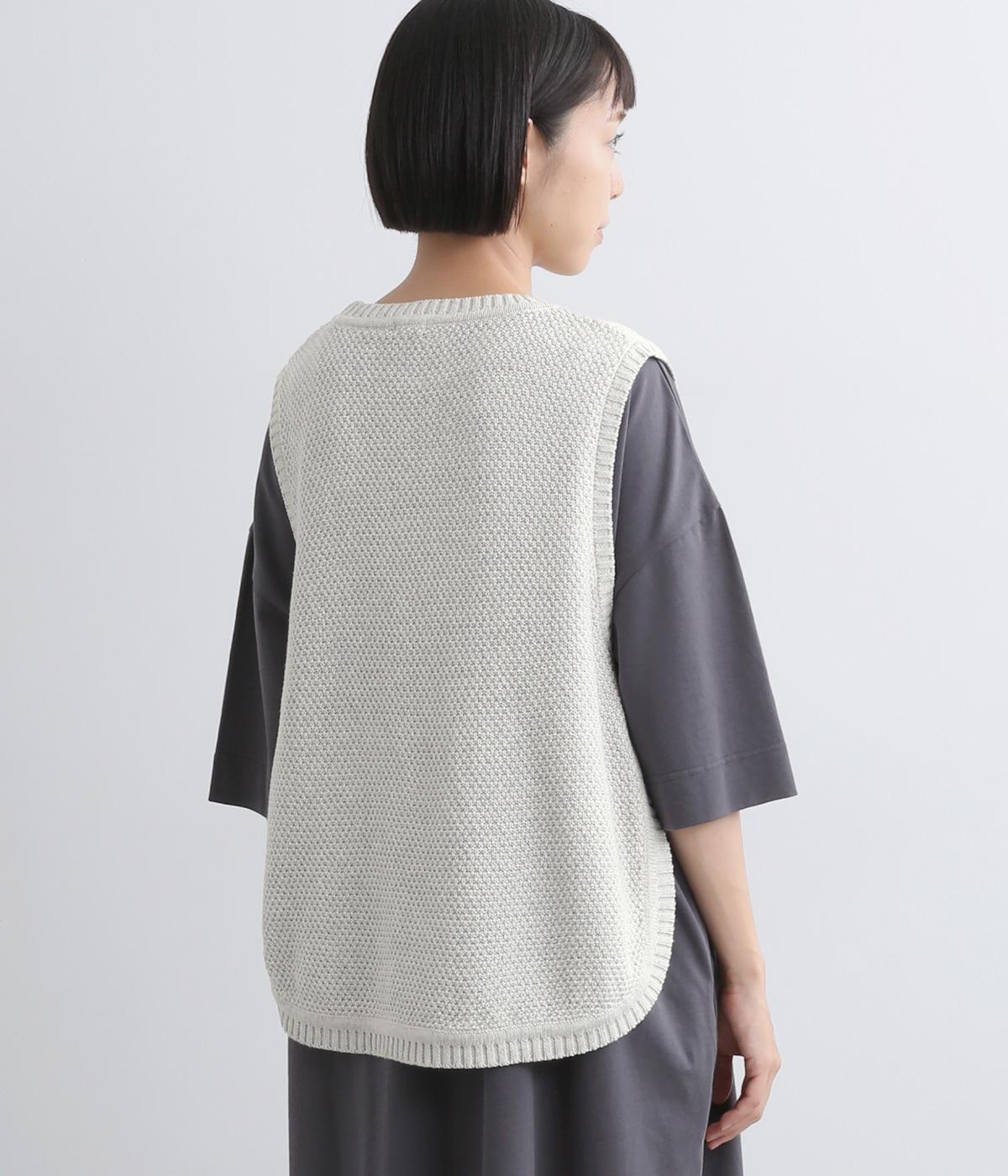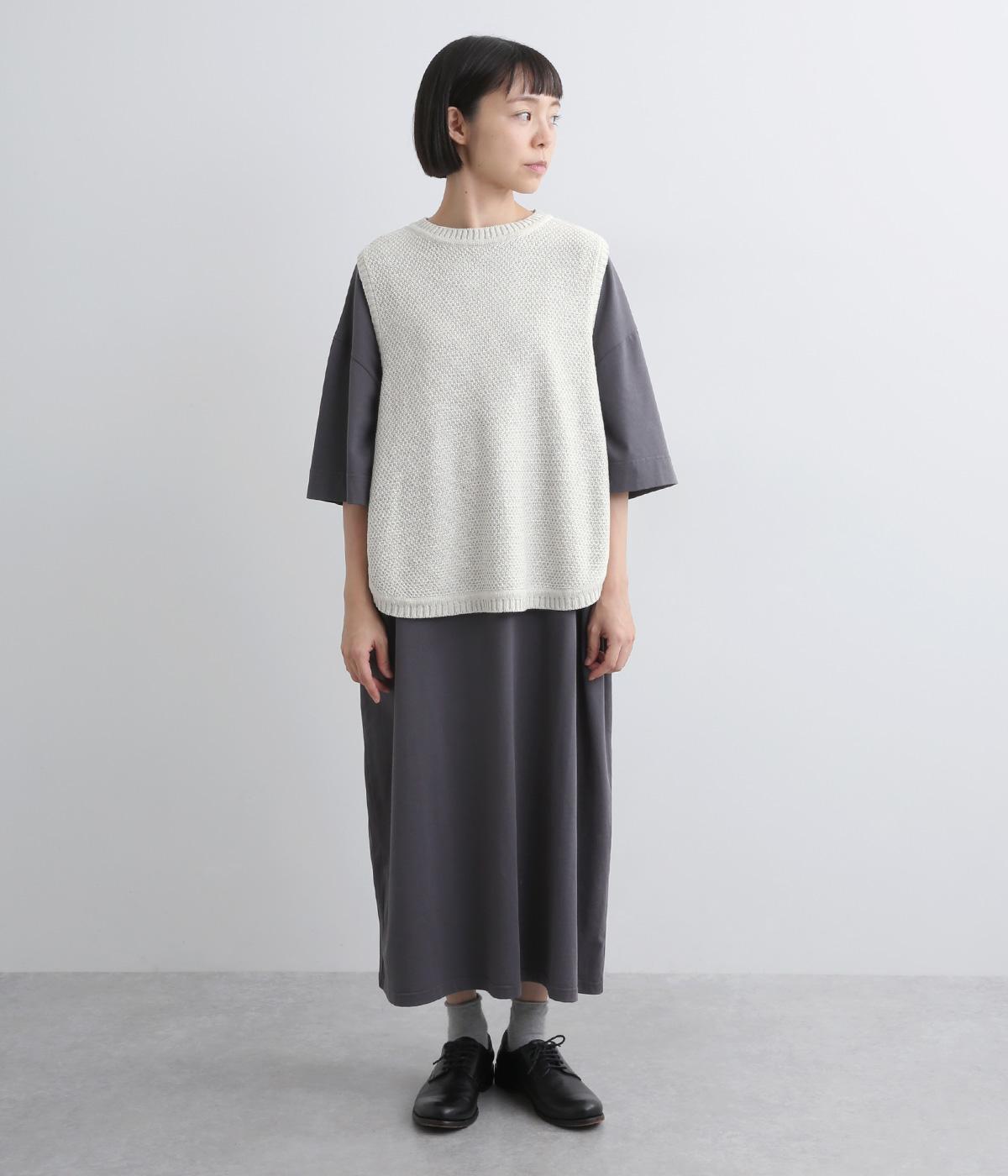 表面に凹凸模様が特徴的で、通気性に優れた鹿の子編みのコットンニットで仕立てました。さらっとしたややドライな肌触りが心地よく、合わせ方次第でロングシーズン着まわせます。