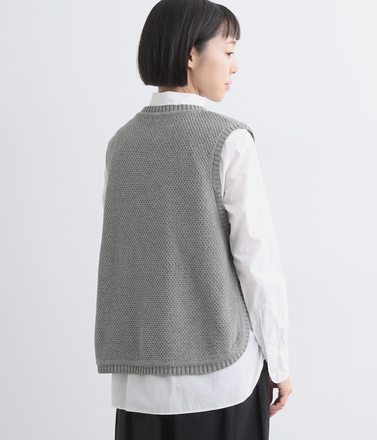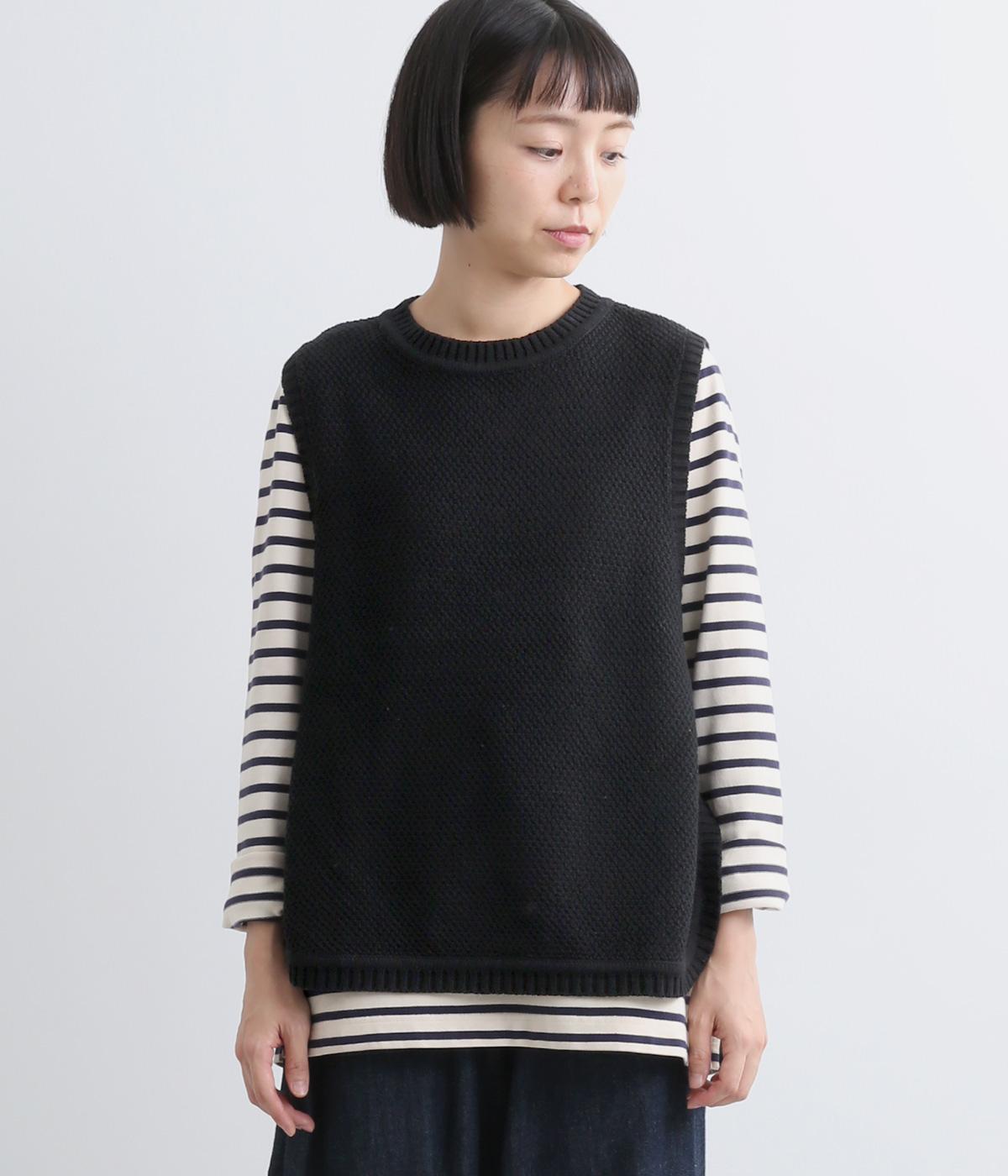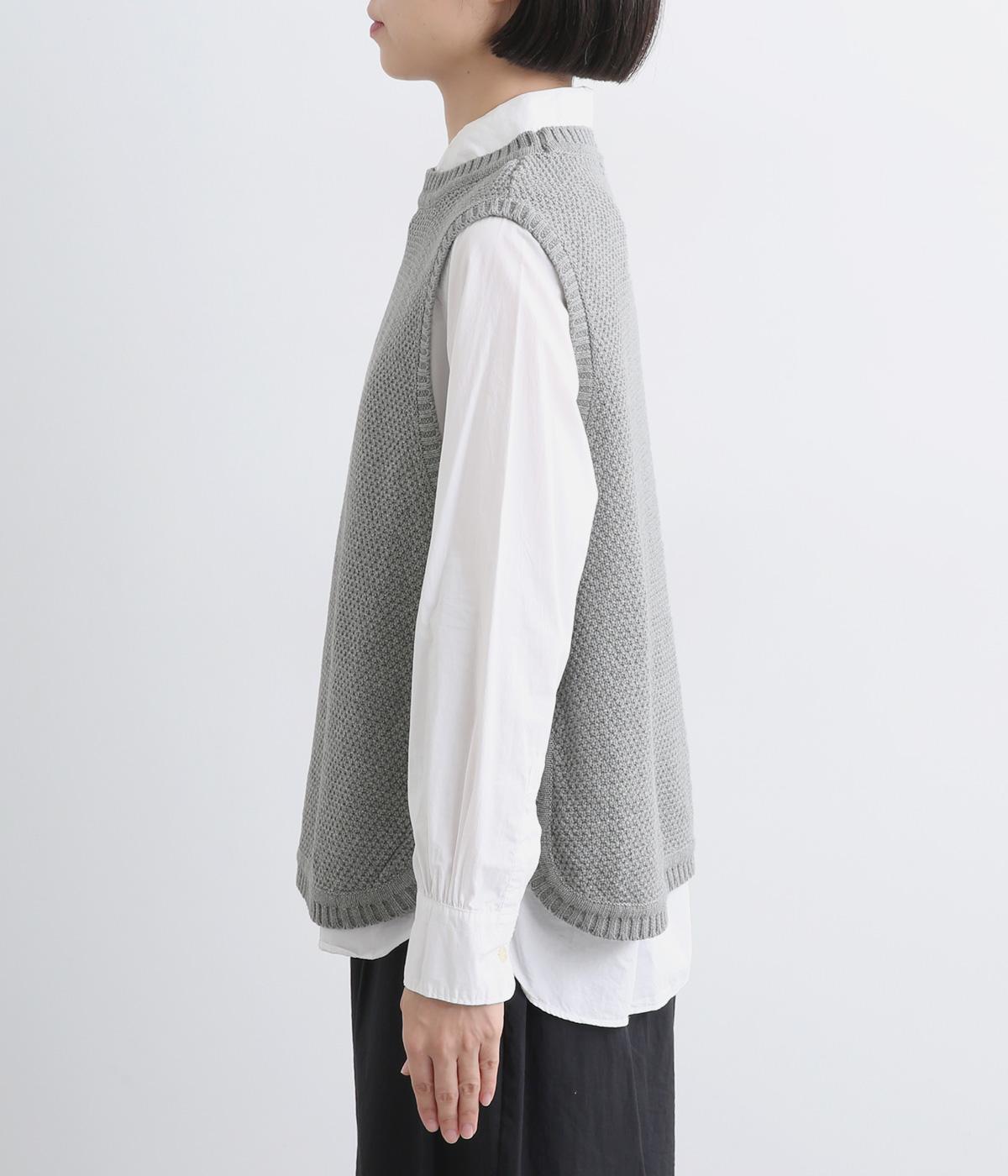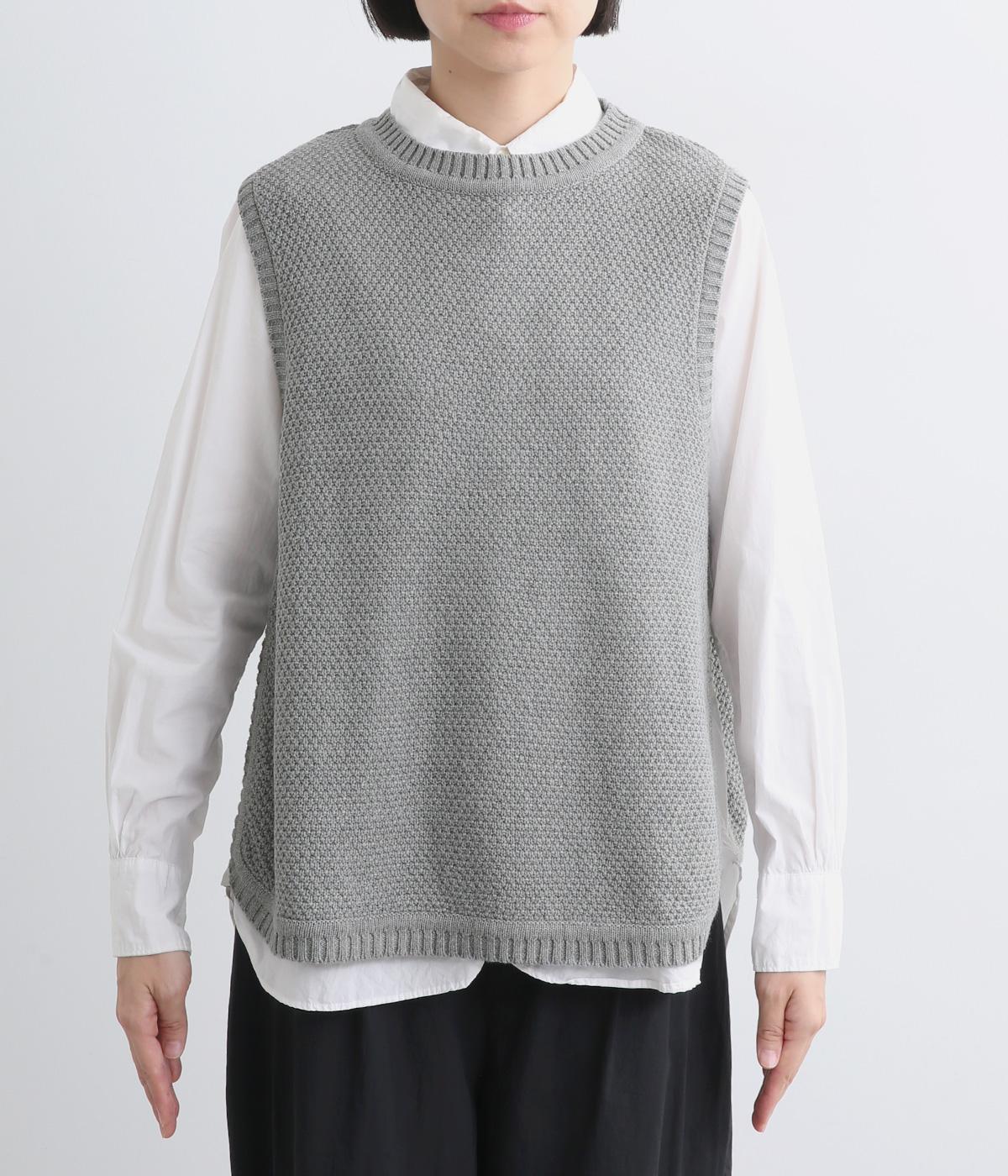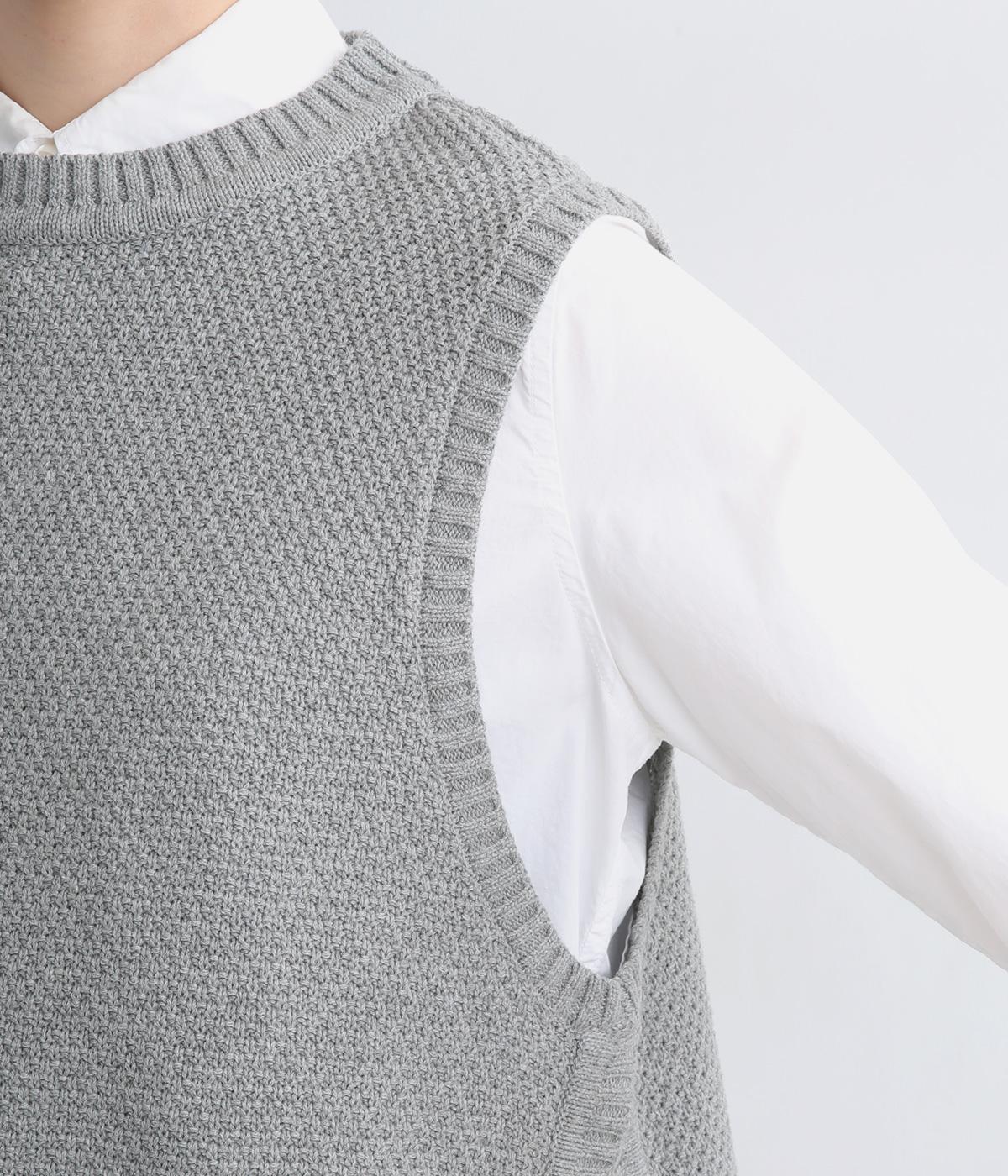 表面に凹凸模様が特徴的で、通気性に優れた鹿の子編みのコットンニットで仕立てました。さらっとしたややドライな肌触りが心地よく、合わせ方次第でロングシーズン着まわせます。