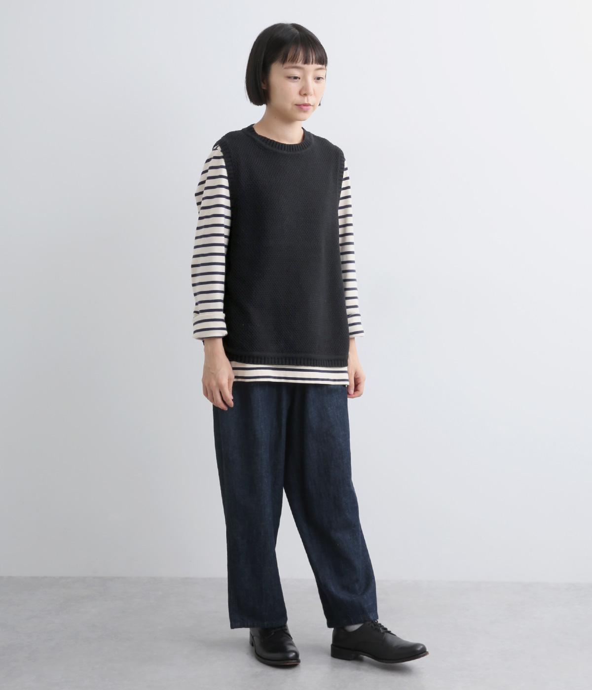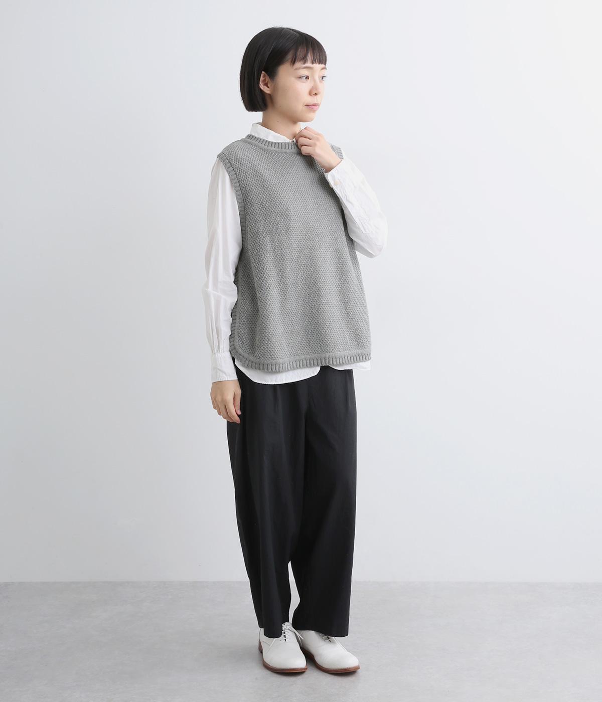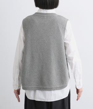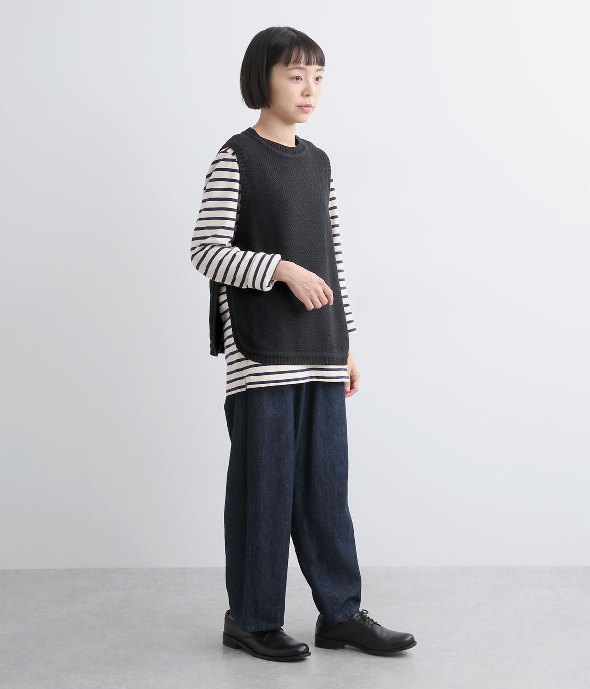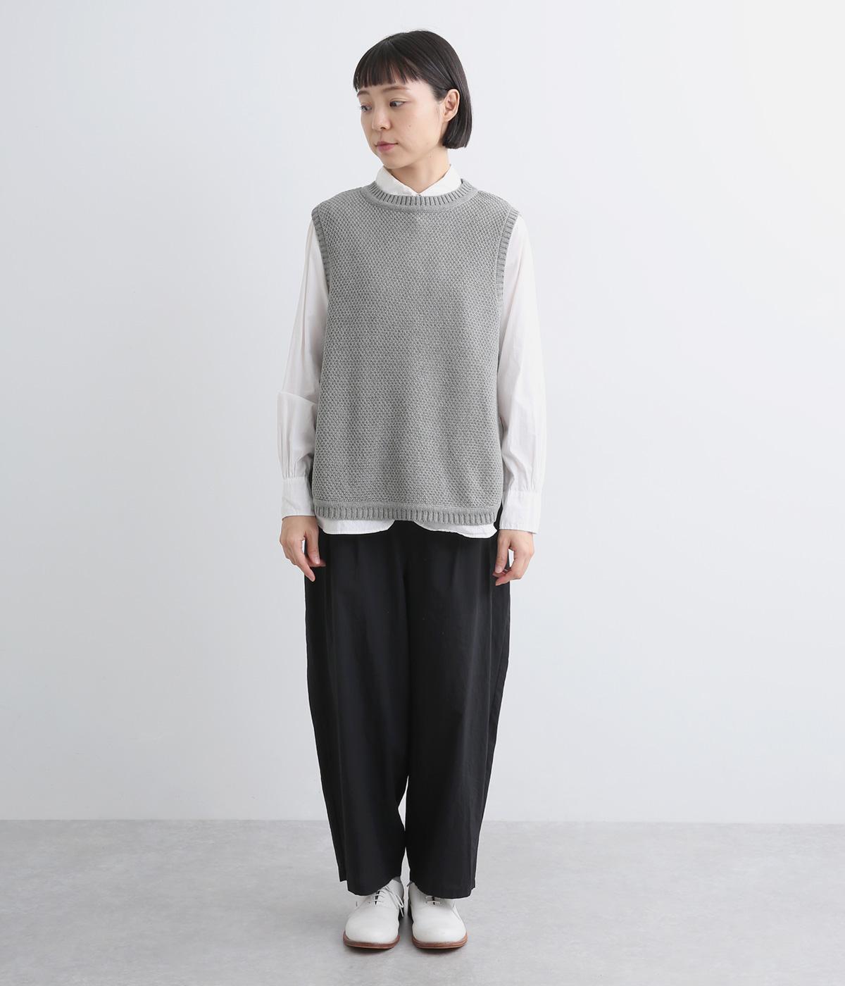 表面に凹凸模様が特徴的で、通気性に優れた鹿の子編みのコットンニットで仕立てました。さらっとしたややドライな肌触りが心地よく、合わせ方次第でロングシーズン着まわせます。