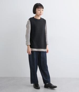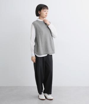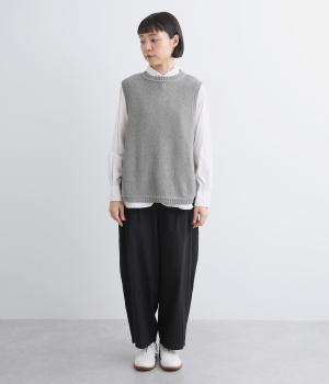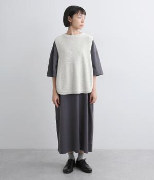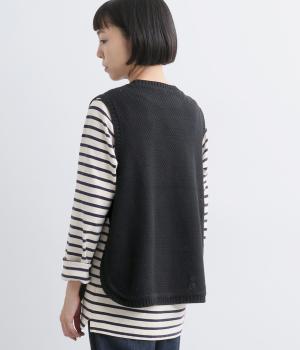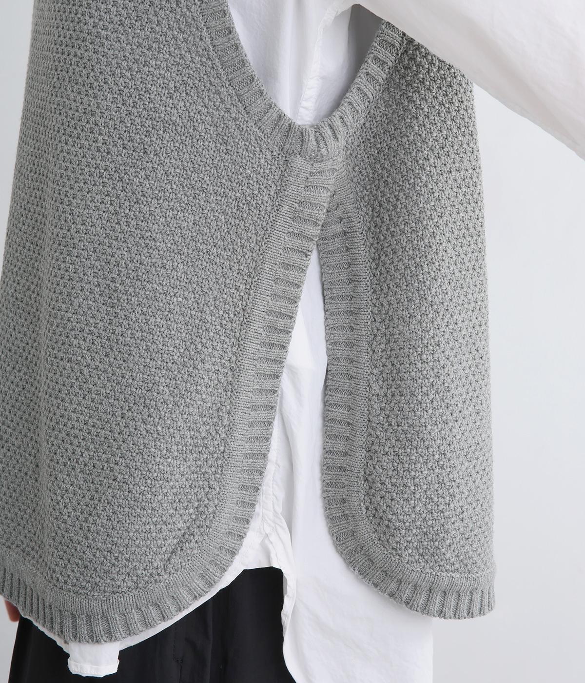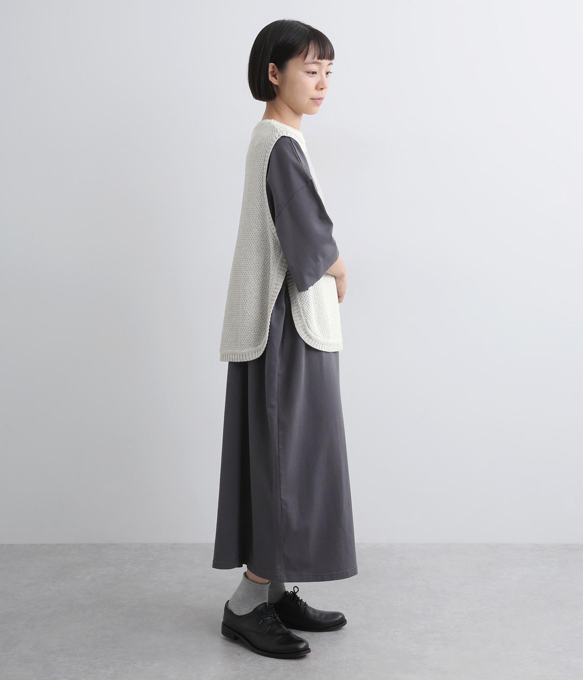 裾を大きくラウンドさせた、サイドスリットがデザインポイント。着用するとシンプルなボックス型になり、シャツやカットソーなどインナーのチラ見せによって表情が変化します。サイドが開くのでワンピースなどに合わせても◎。