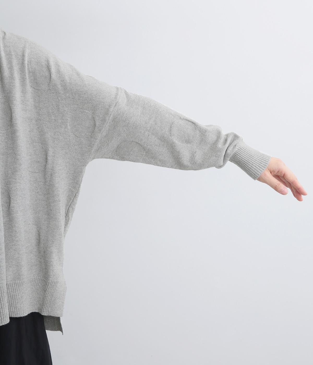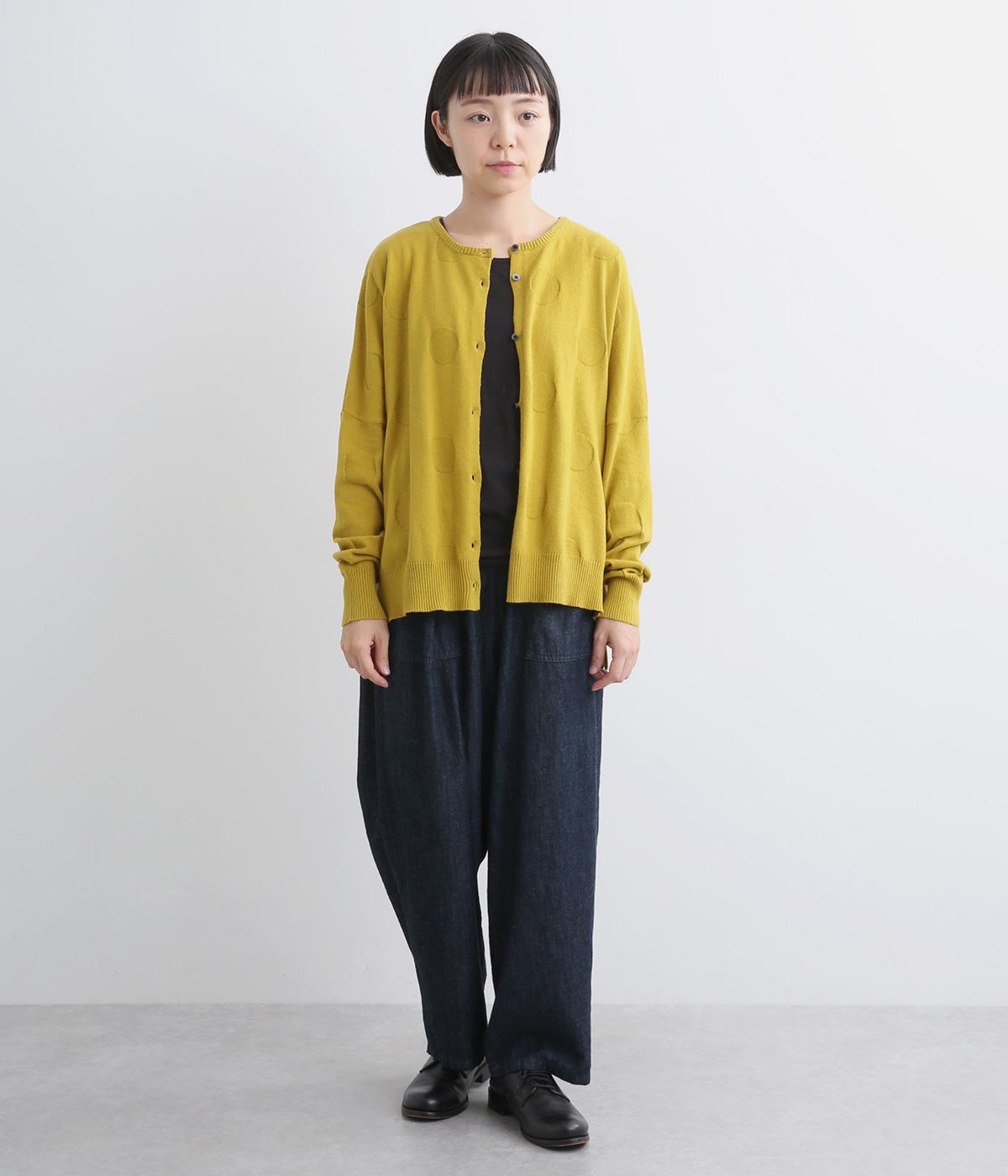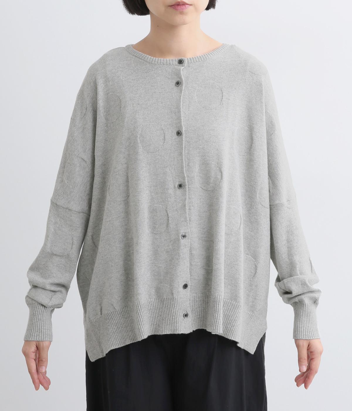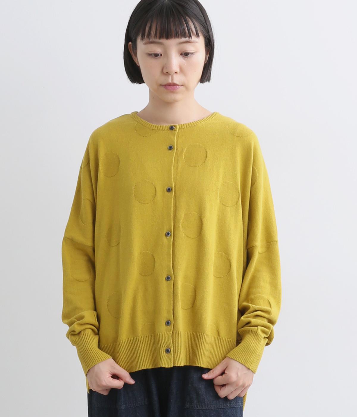 ゆったりしていてラフに羽織りやすいニットカーディガンは、ドットジャカードを活かしてベーシックにまとめました。袖口と裾は長めのリブ編みで適度にメリハリを。小さめのラウンドネックでプルオーバーのようなメイン使いも◎。