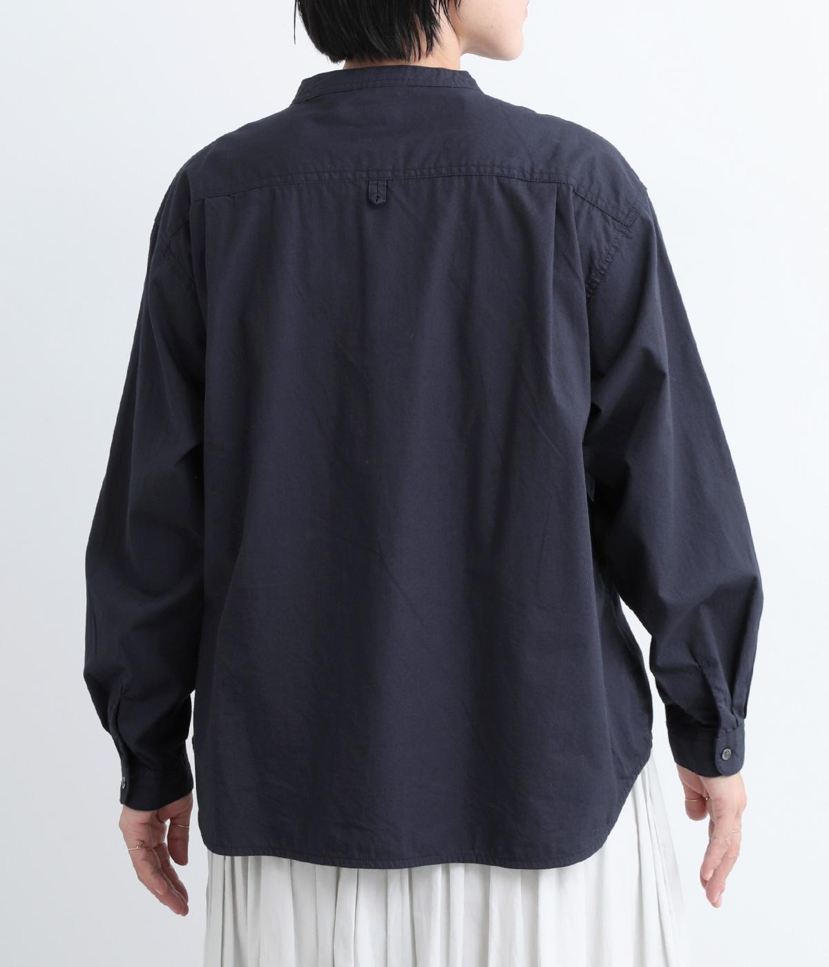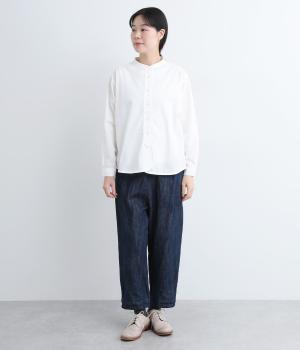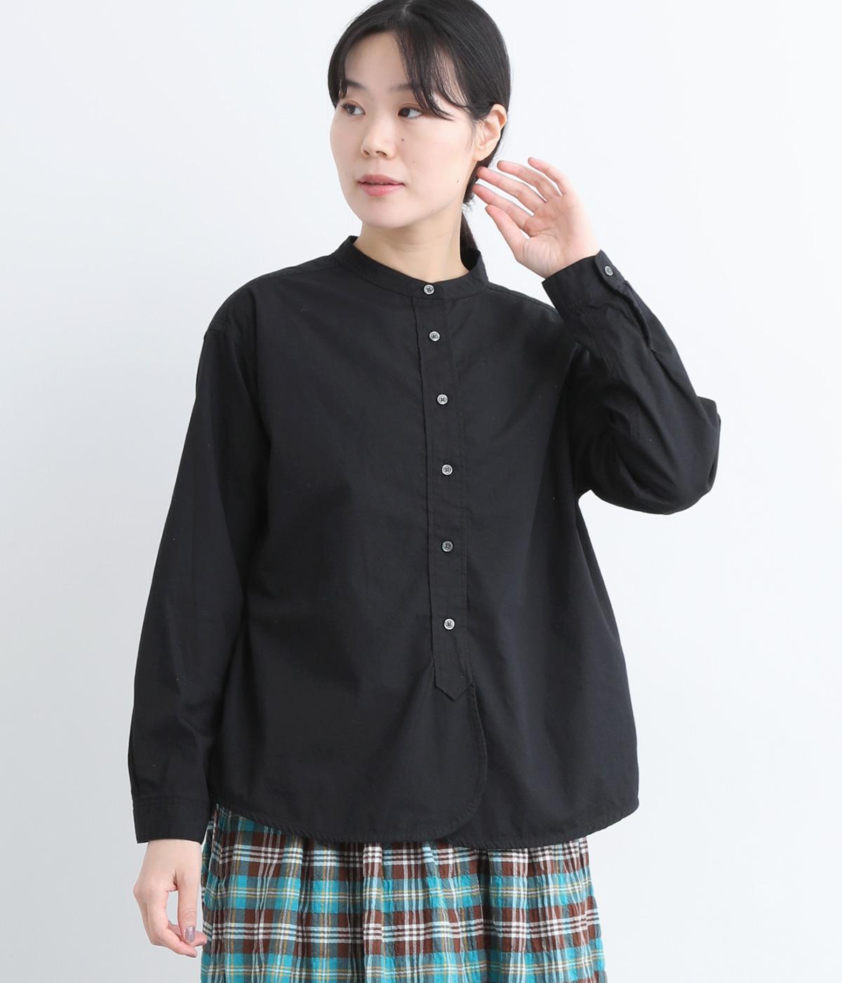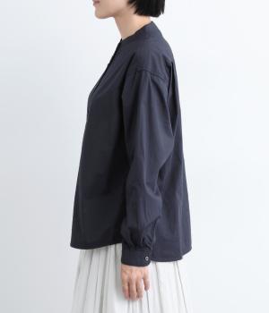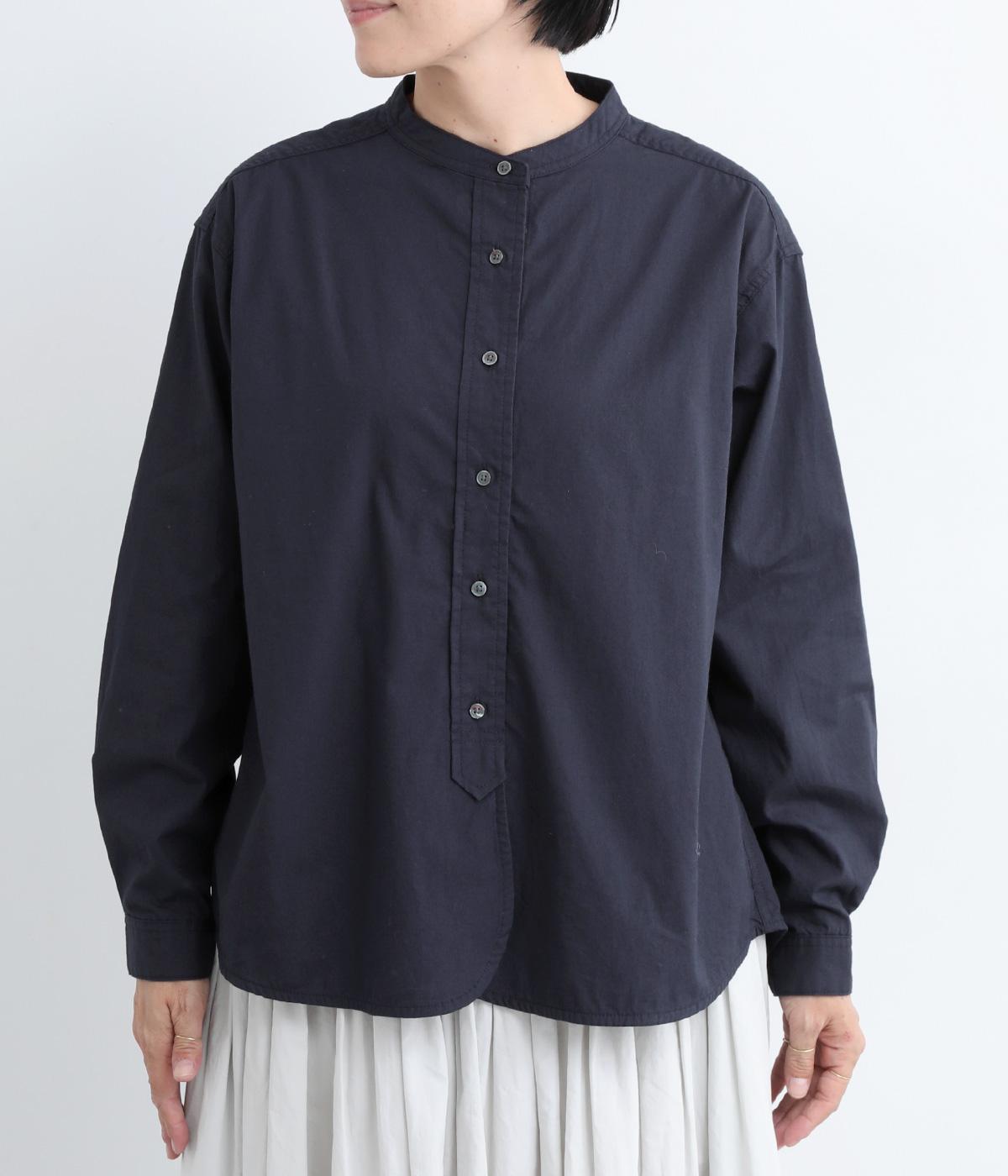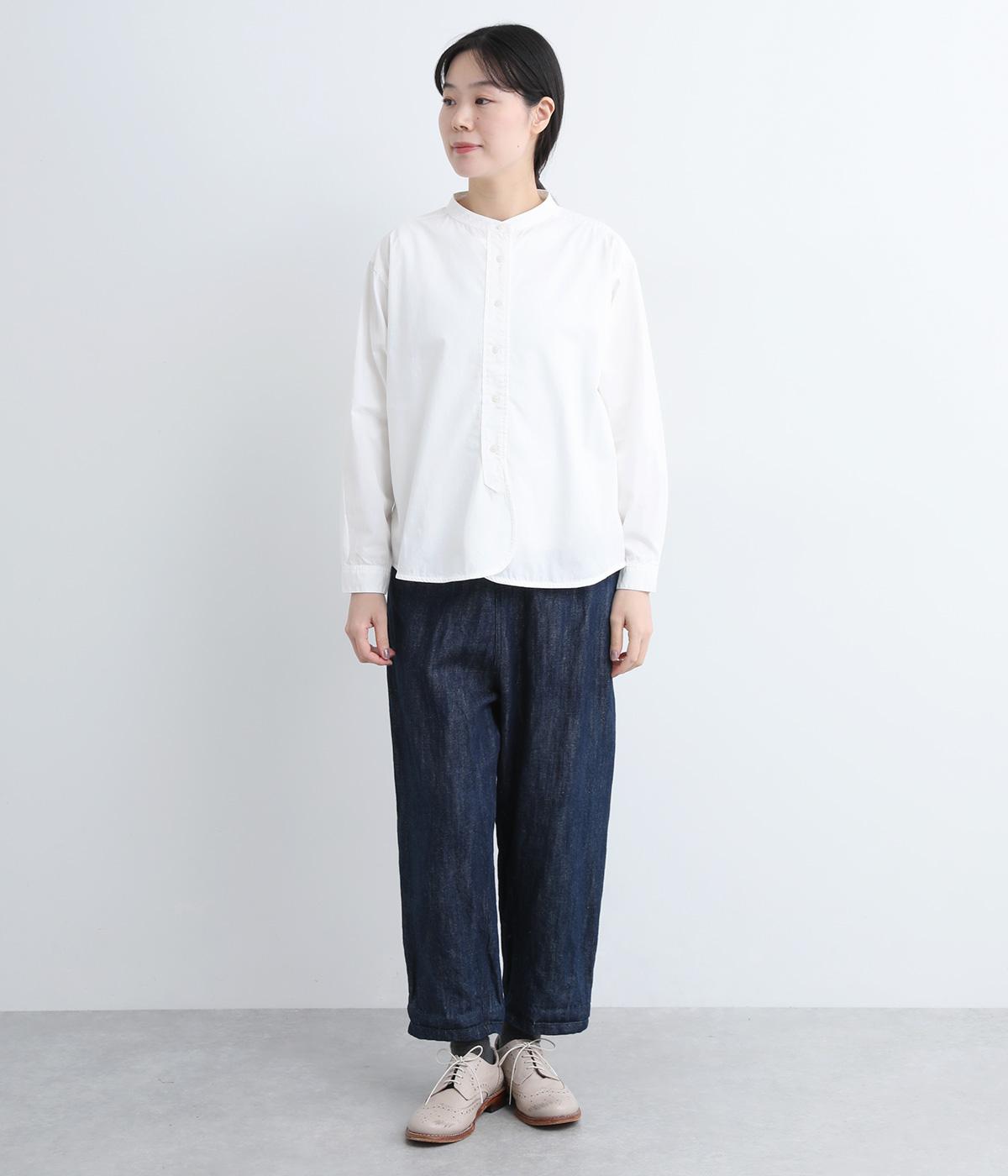 すっきりとしたバンドカラーが上品な印象のシャツは、ラウンドしたヘムラインでやわらかなシルエットに仕立てました。シンプルながらもこなれた雰囲気を楽しめる一枚で、羽織りスタイルもさまになります。