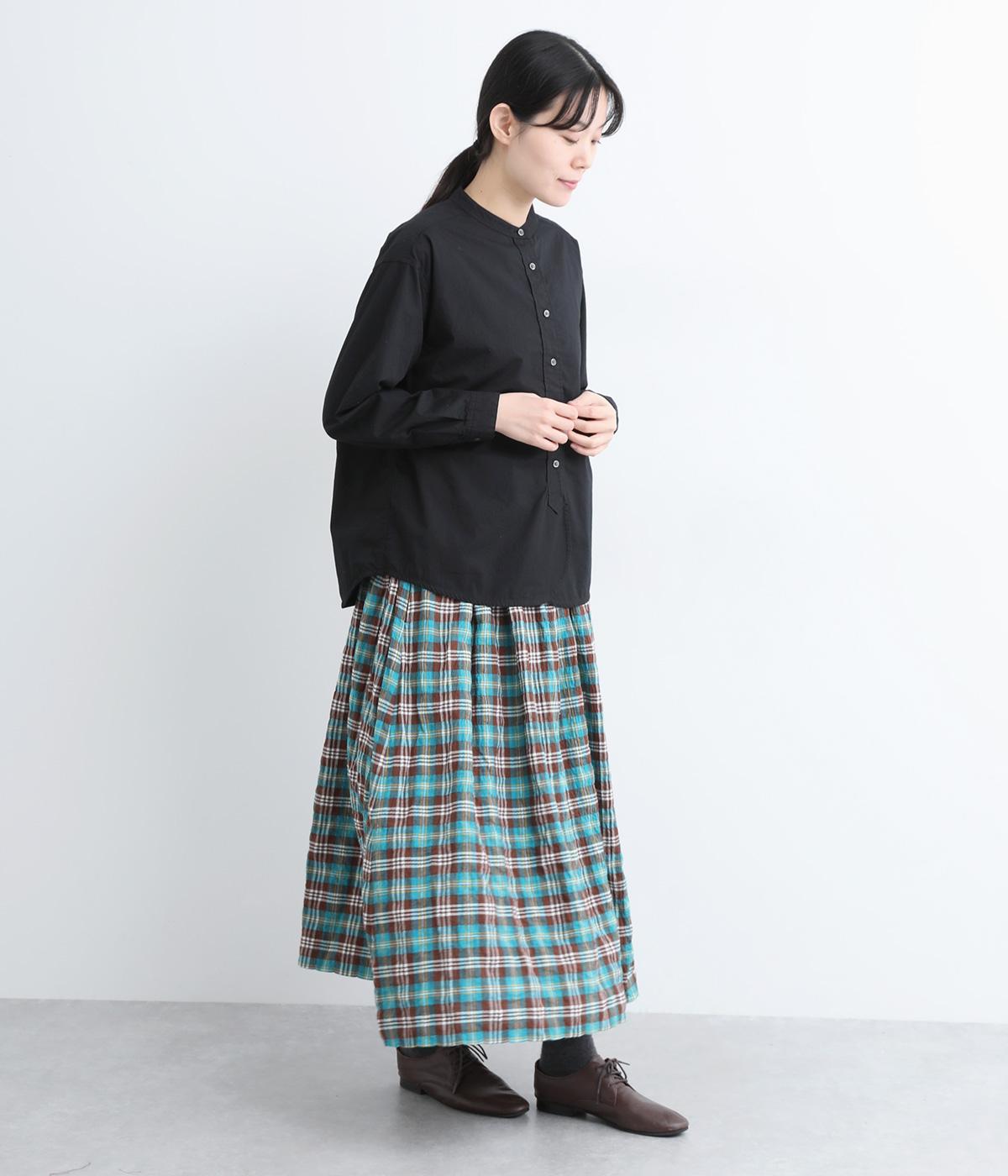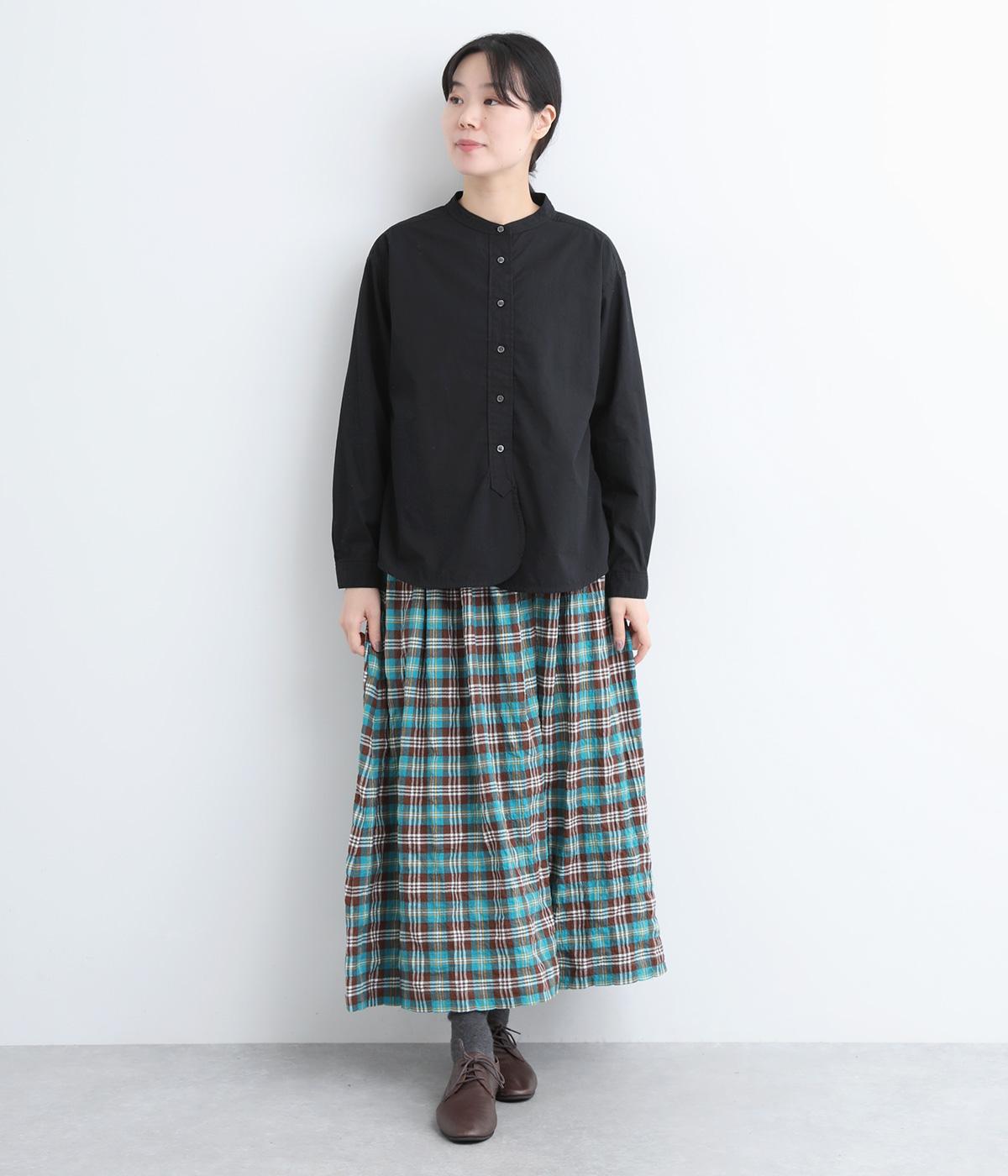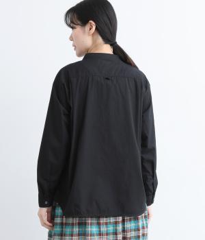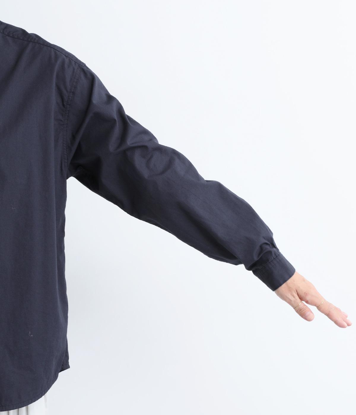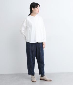 すっきりとしたバンドカラーが上品な印象のシャツは、ラウンドしたヘムラインでやわらかなシルエットに仕立てました。シンプルながらもこなれた雰囲気を楽しめる一枚で、羽織りスタイルもさまになります。