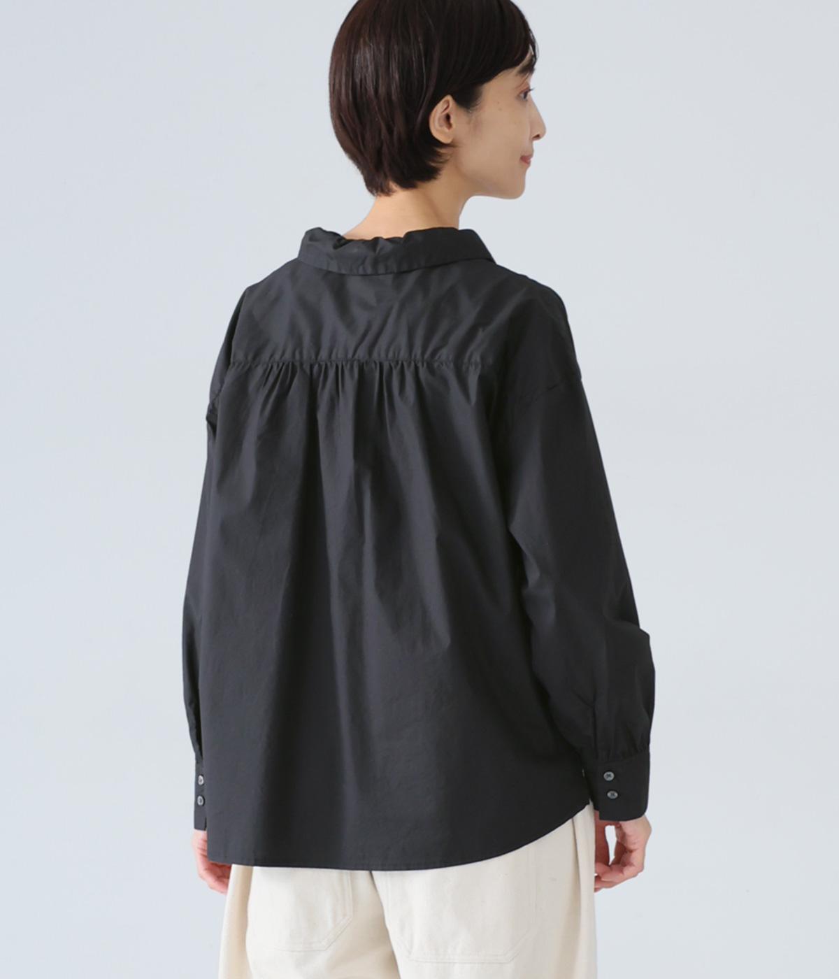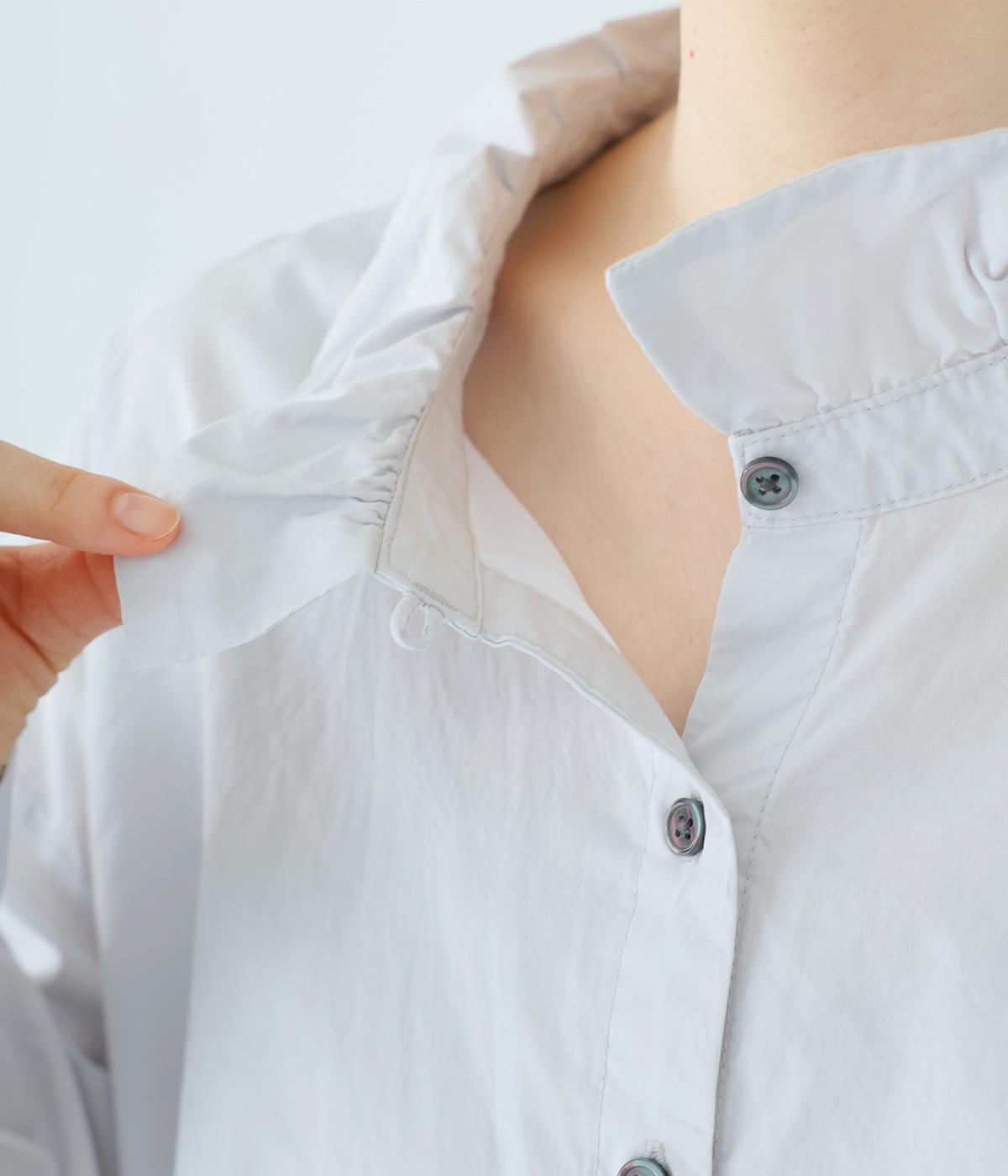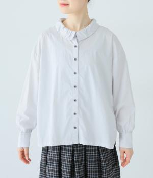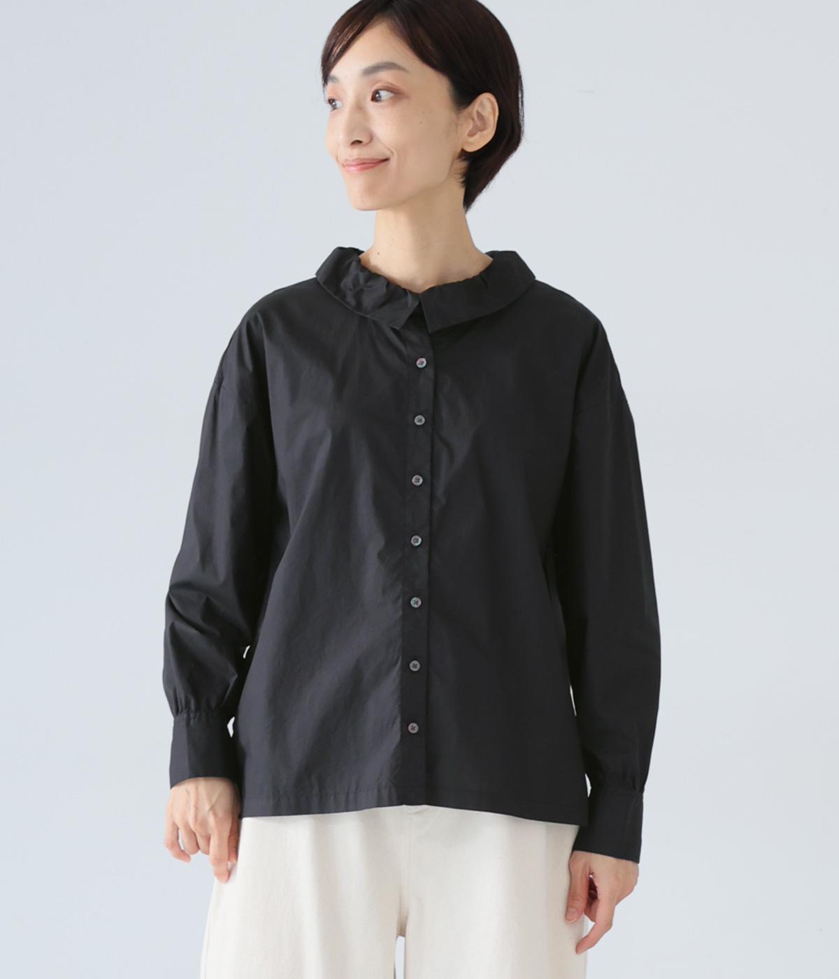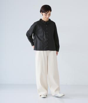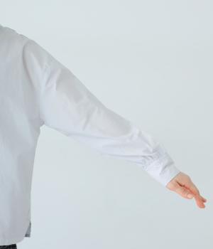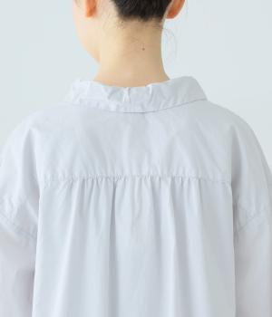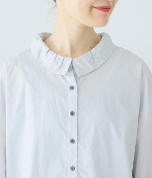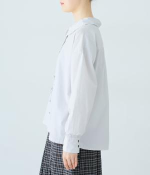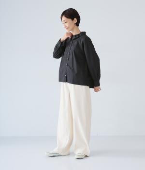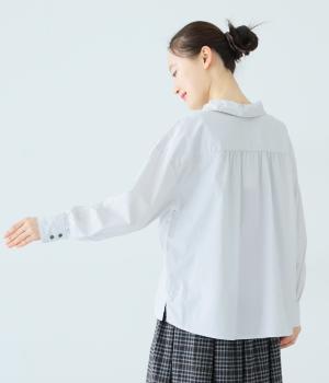 ギャザーを寄せた襟が、きちんと感のあるブラウスに大人かわいいエッセンスをプラス。後ろはギャザー入りで適度なフレアシルエットに。裾は前後差をつけたスリット入りでボトム合わせしやすく、横姿もきれいに見せてくれます。