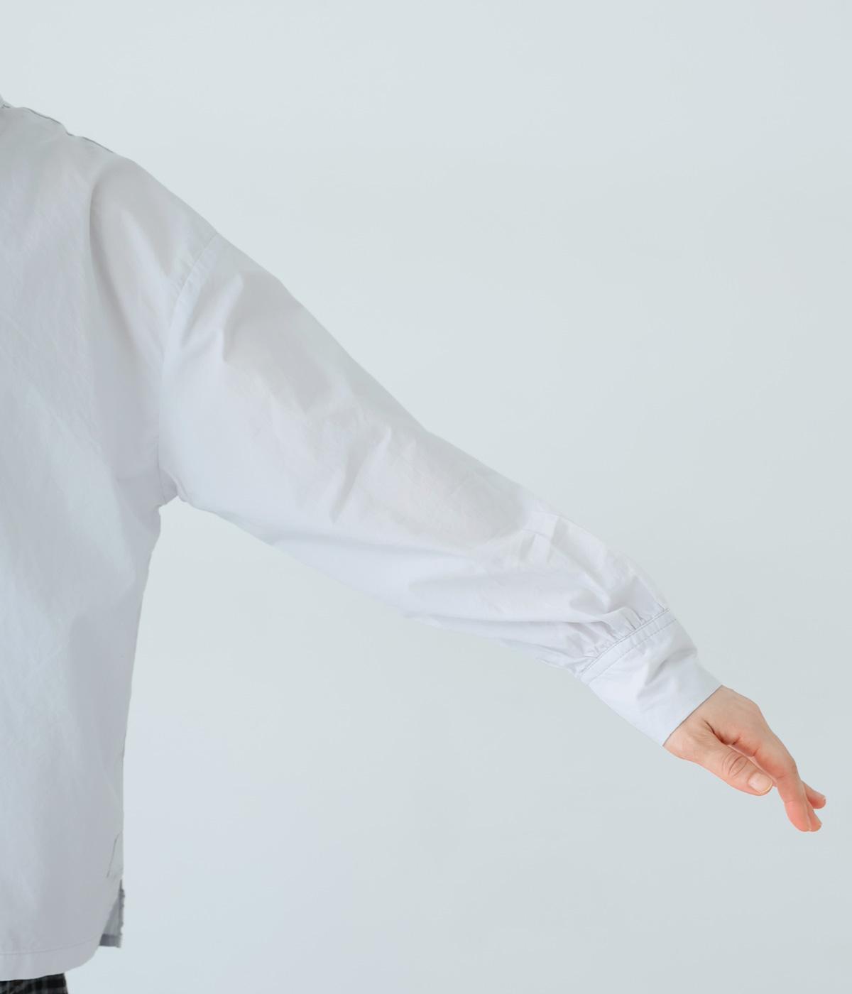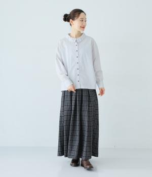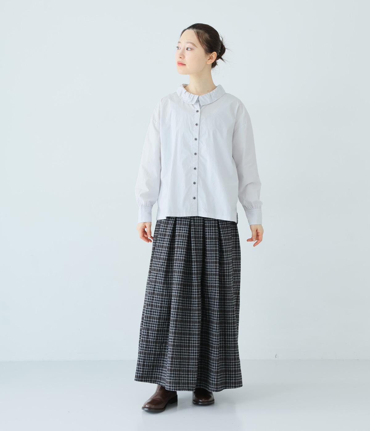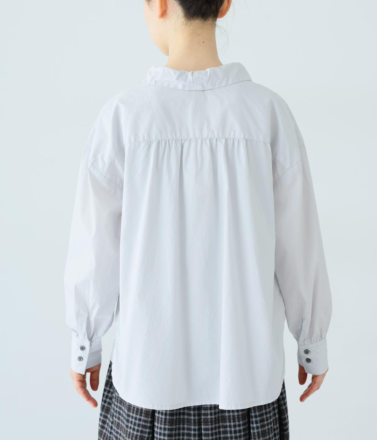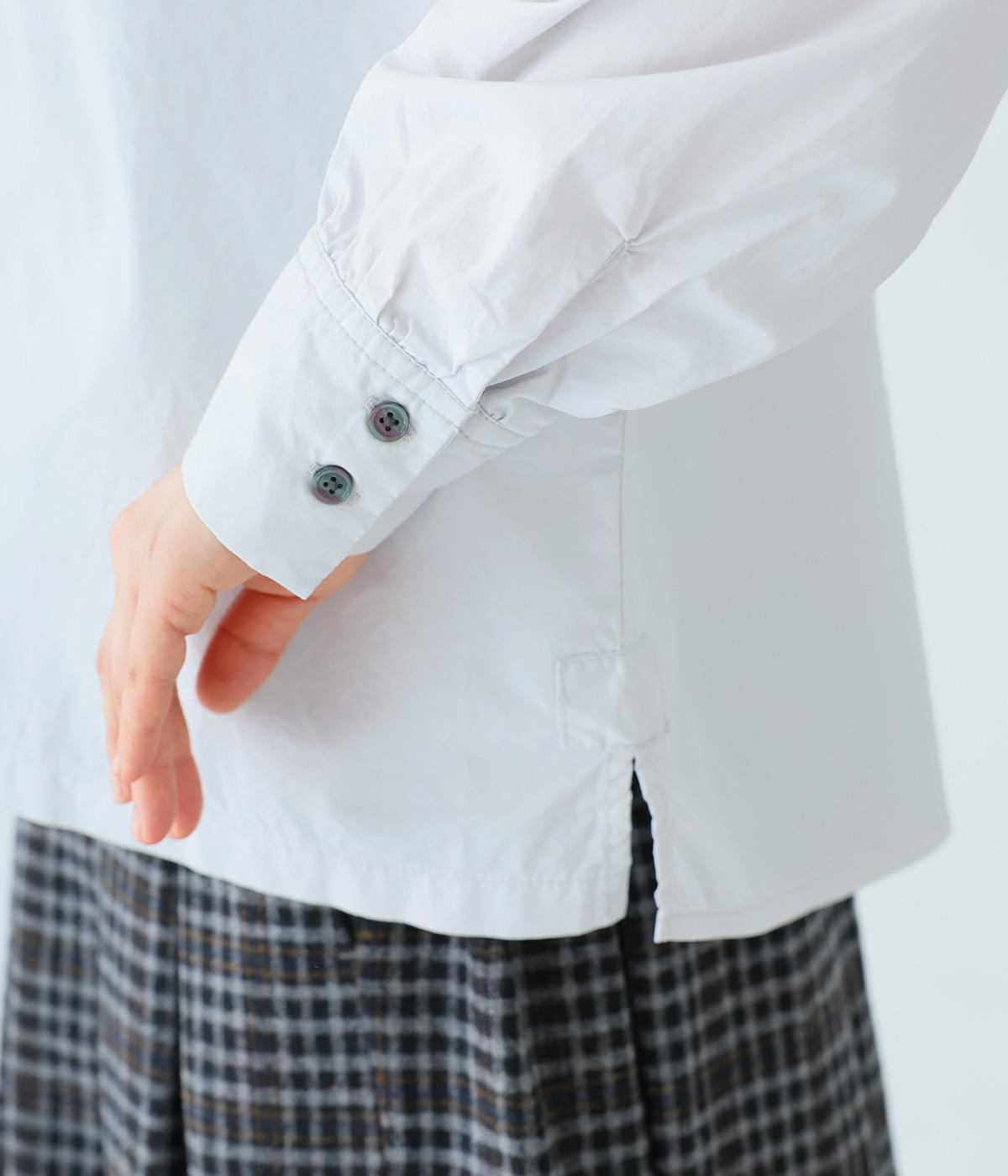 ギャザーを寄せた襟が、きちんと感のあるブラウスに大人かわいいエッセンスをプラス。後ろはギャザー入りで適度なフレアシルエットに。裾は前後差をつけたスリット入りでボトム合わせしやすく、横姿もきれいに見せてくれます。