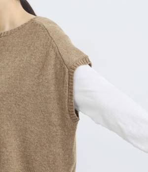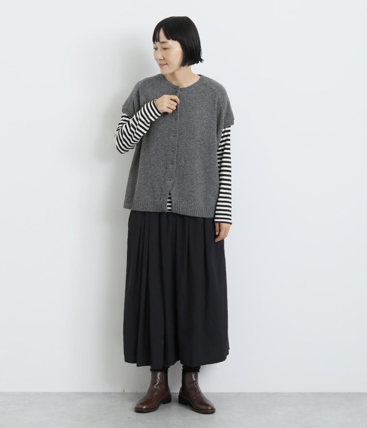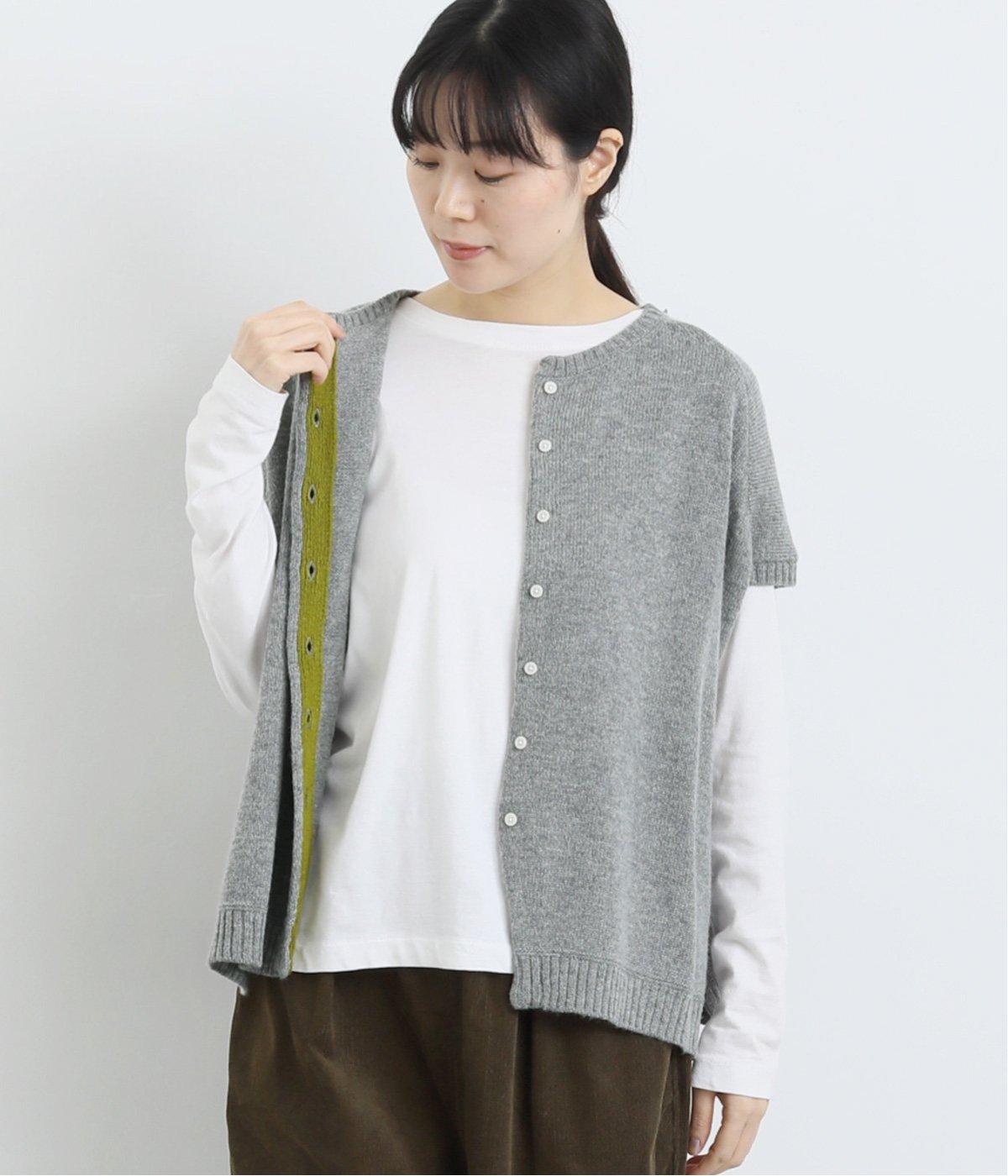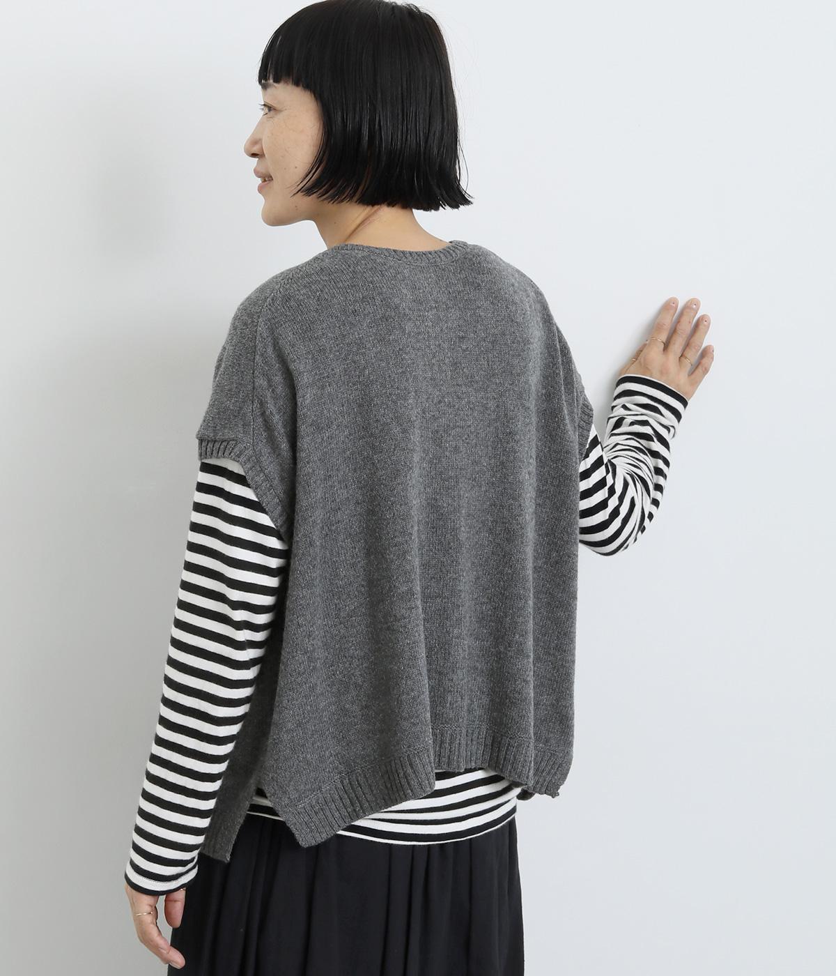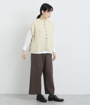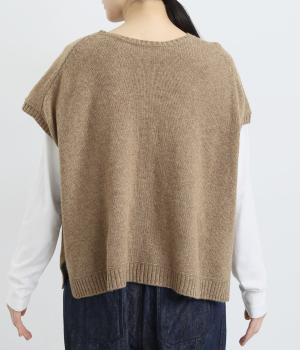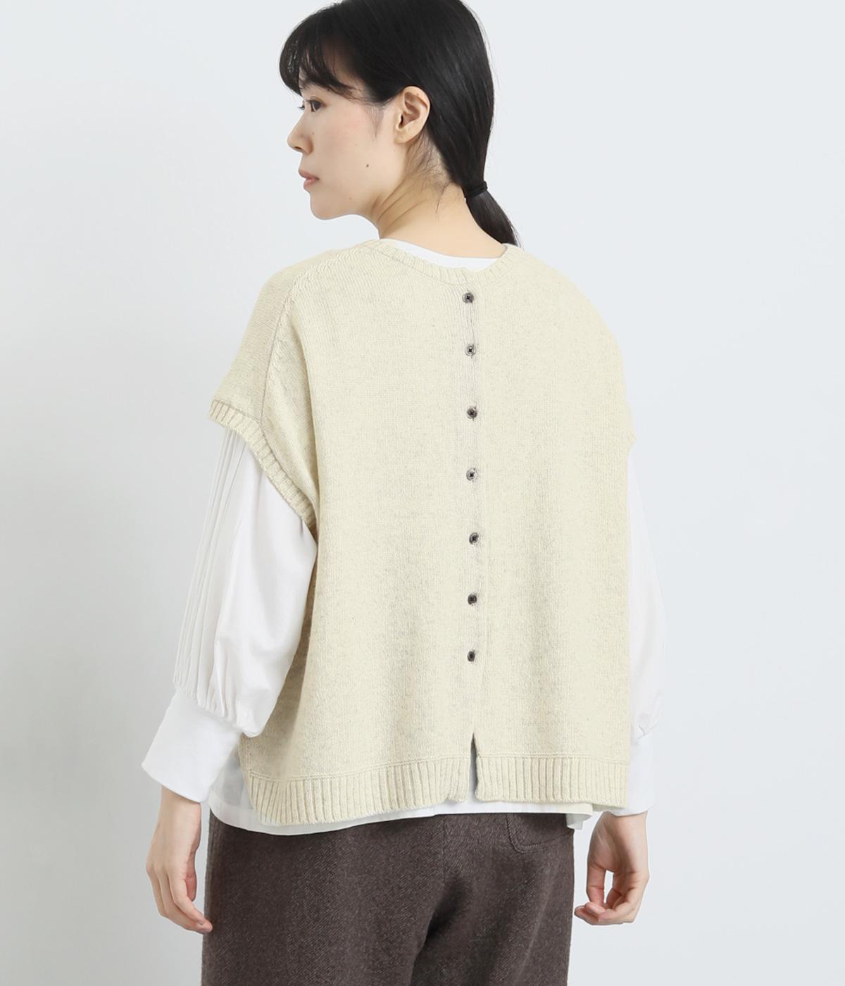 前後2way仕様で幅広い着こなしに対応できるベストです。レイヤードするインナーとのコントラストがたのしめるワイドシルエットで、裾スリットも入っているのでボトム合わせもイージー。前あきでラフに羽織っても◎。