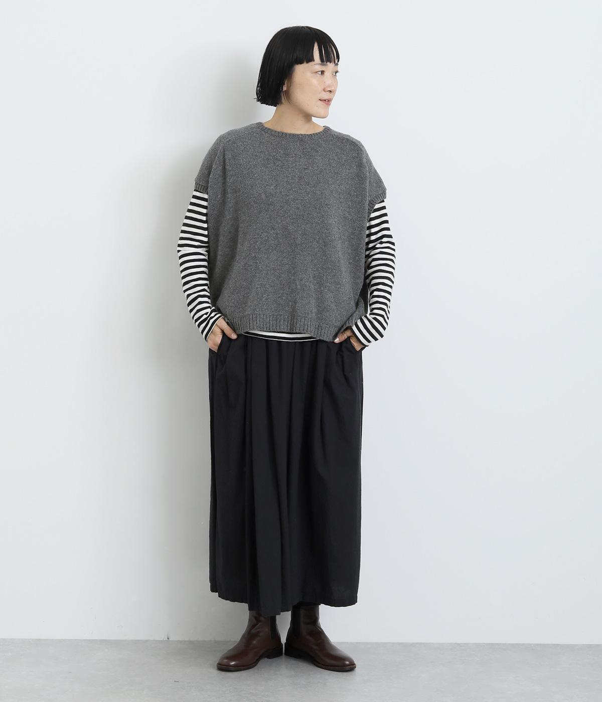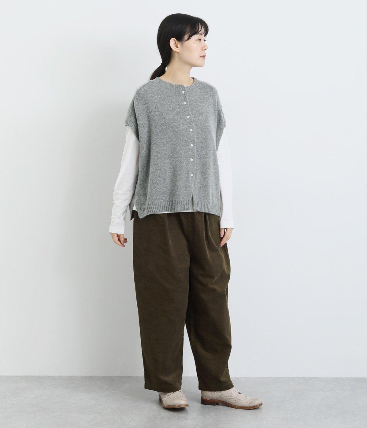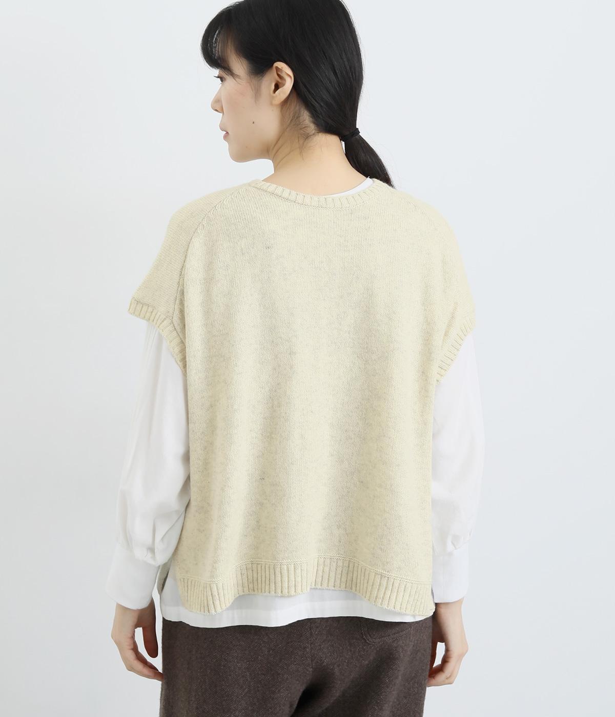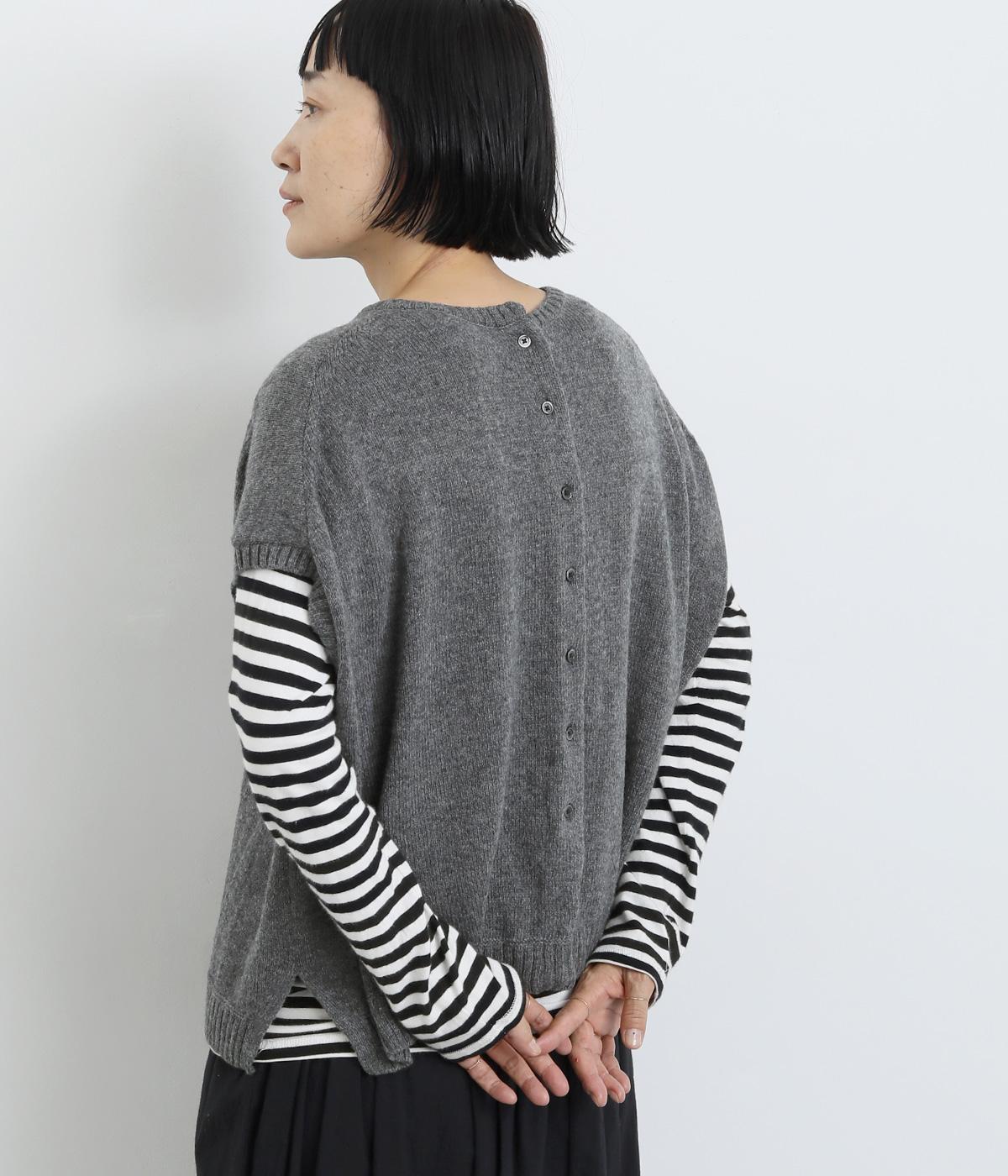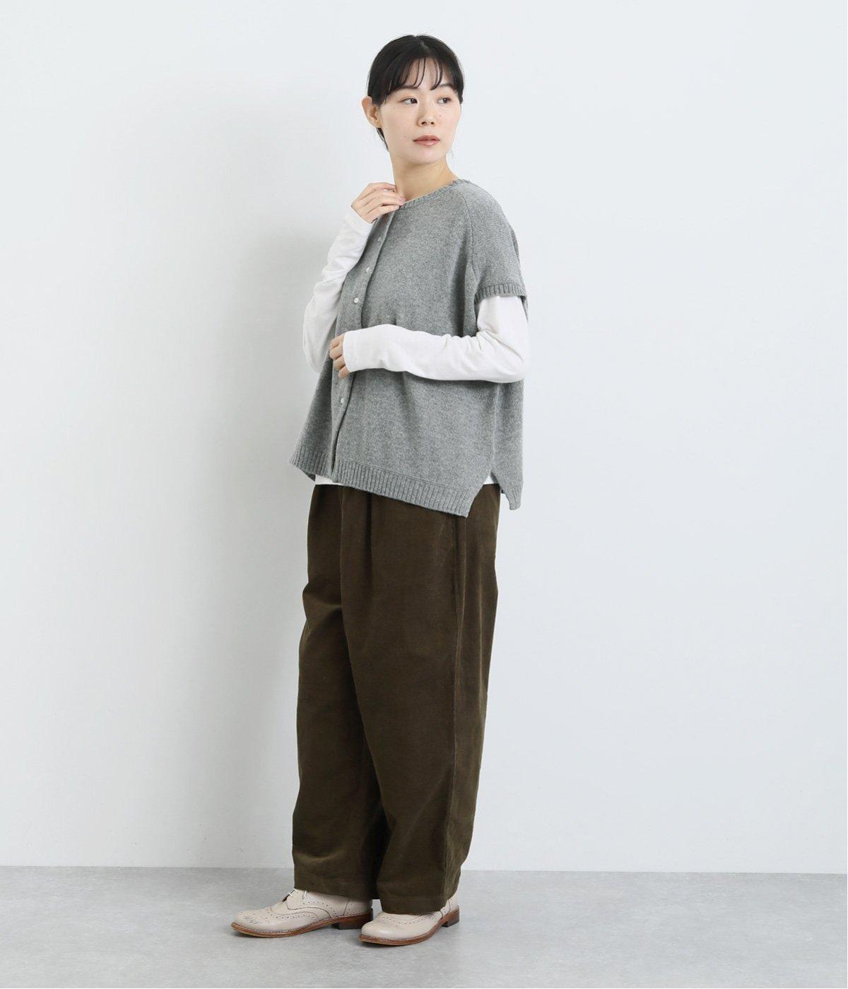 前後2way仕様で幅広い着こなしに対応できるベストです。レイヤードするインナーとのコントラストがたのしめるワイドシルエットで、裾スリットも入っているのでボトム合わせもイージー。前あきでラフに羽織っても◎。