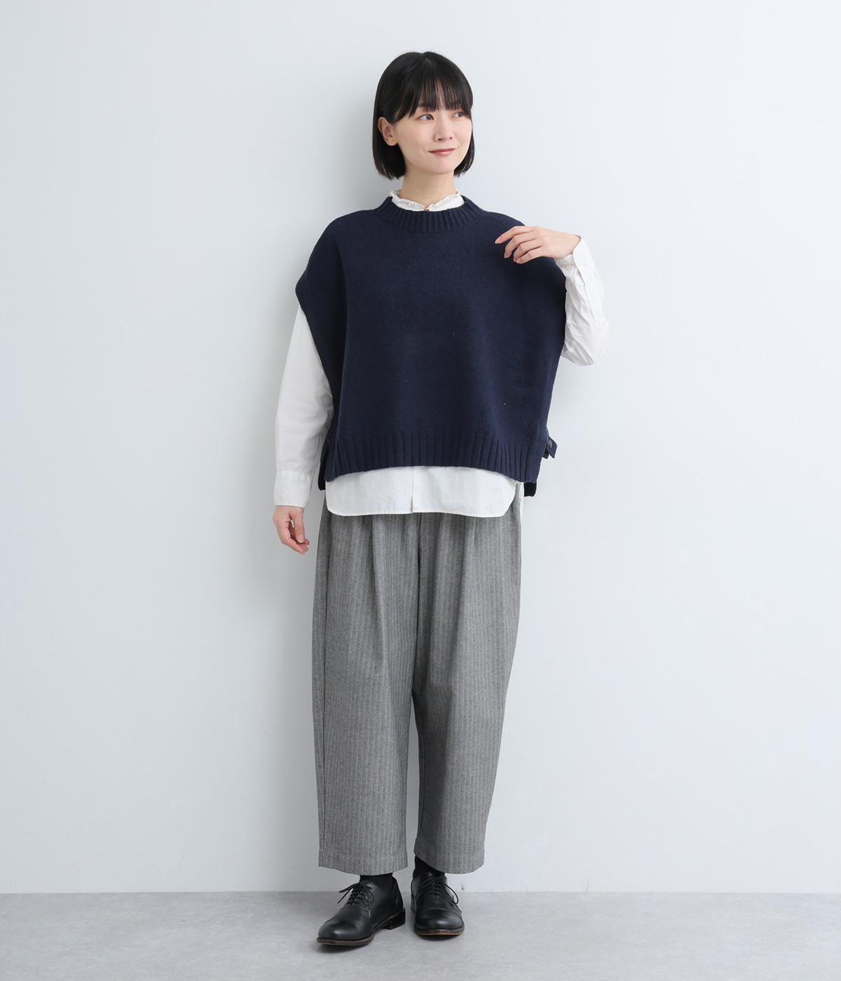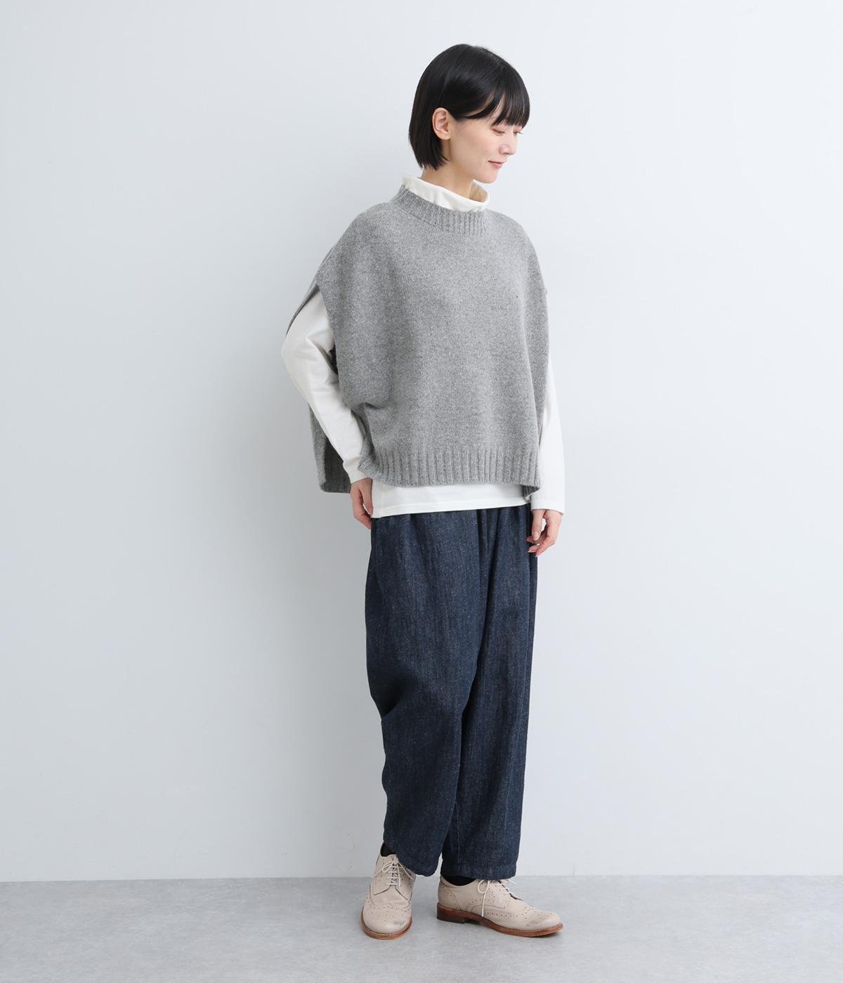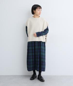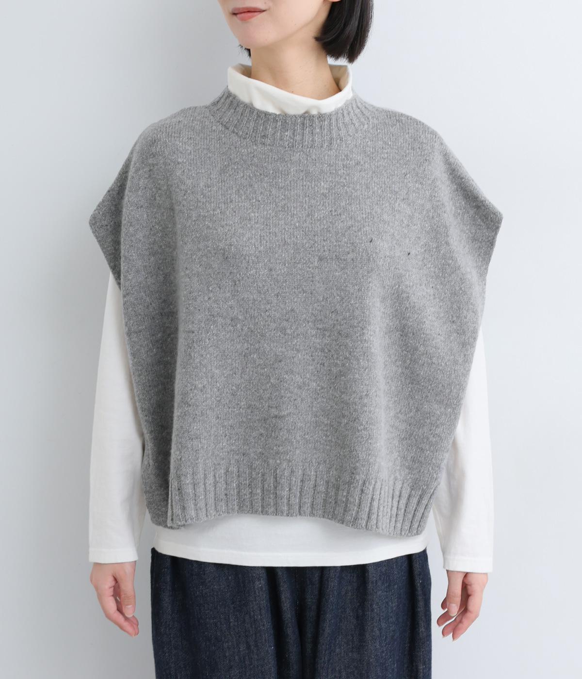 ニットのソフトな風合いが映えるシンプルなベスト。横に張り出した身頃が気になる二の腕をカバーしてくれます。サイドはボタンで留める仕様になっており、抜け感のある横姿が◎。コンパクトな着丈でボリュームのあるボトムスとも好相性です。