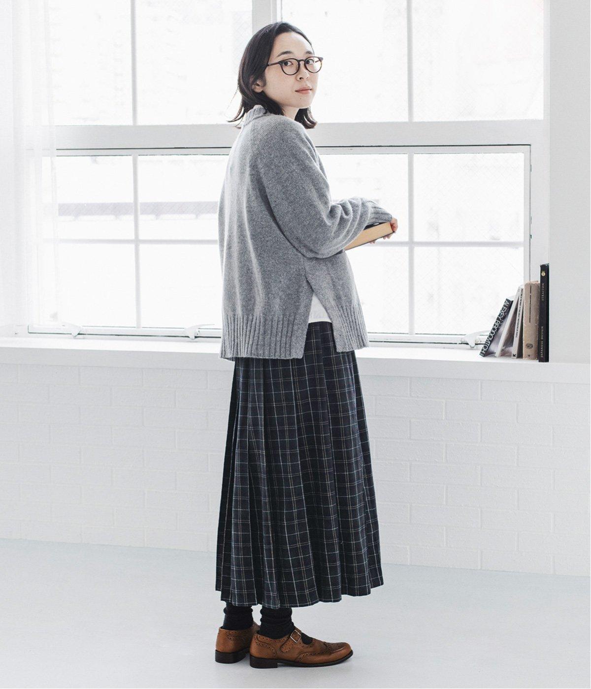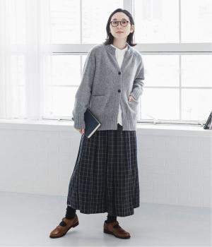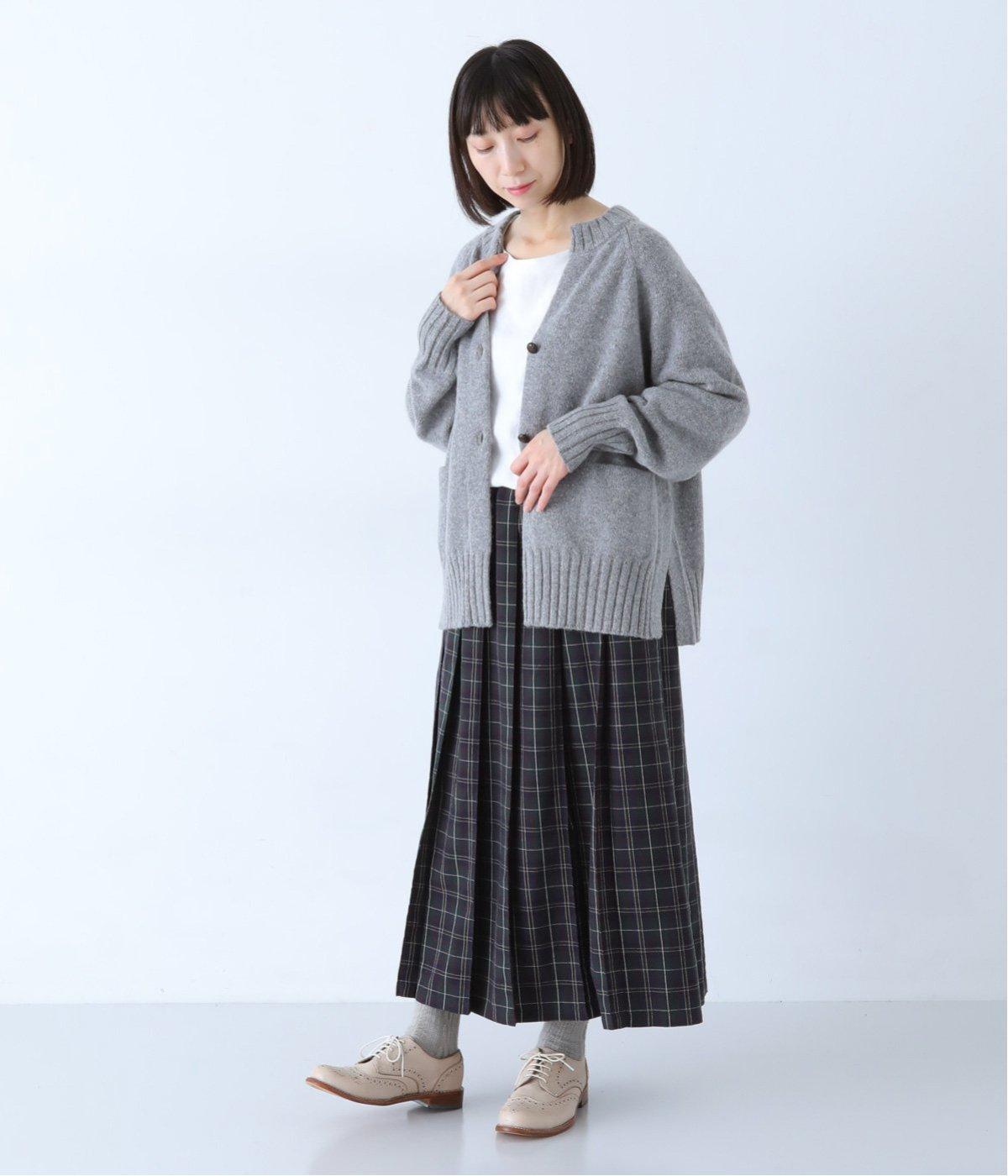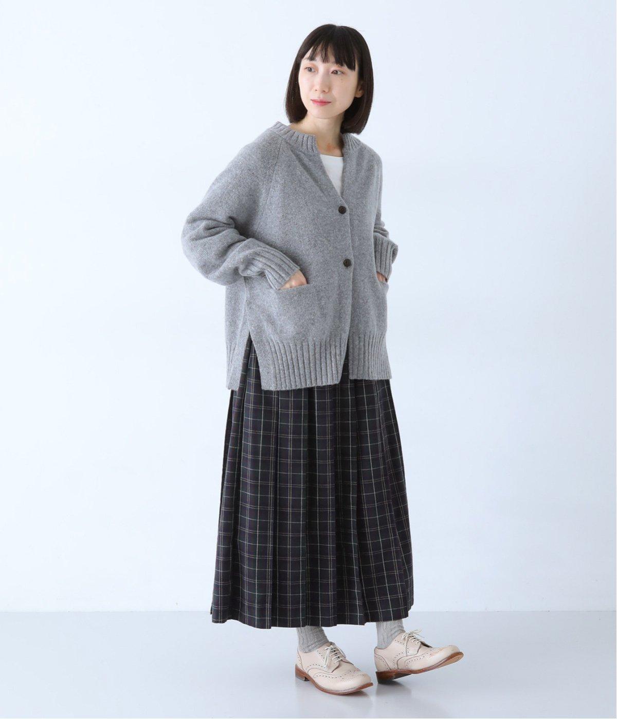 メランジ調で表情豊かな<杢グレー>は、バンドカラーブラウスとチェックのスカートと合わせて。自然体でありながらきちんと感のある、この季節にぴったりの王道コーデです。