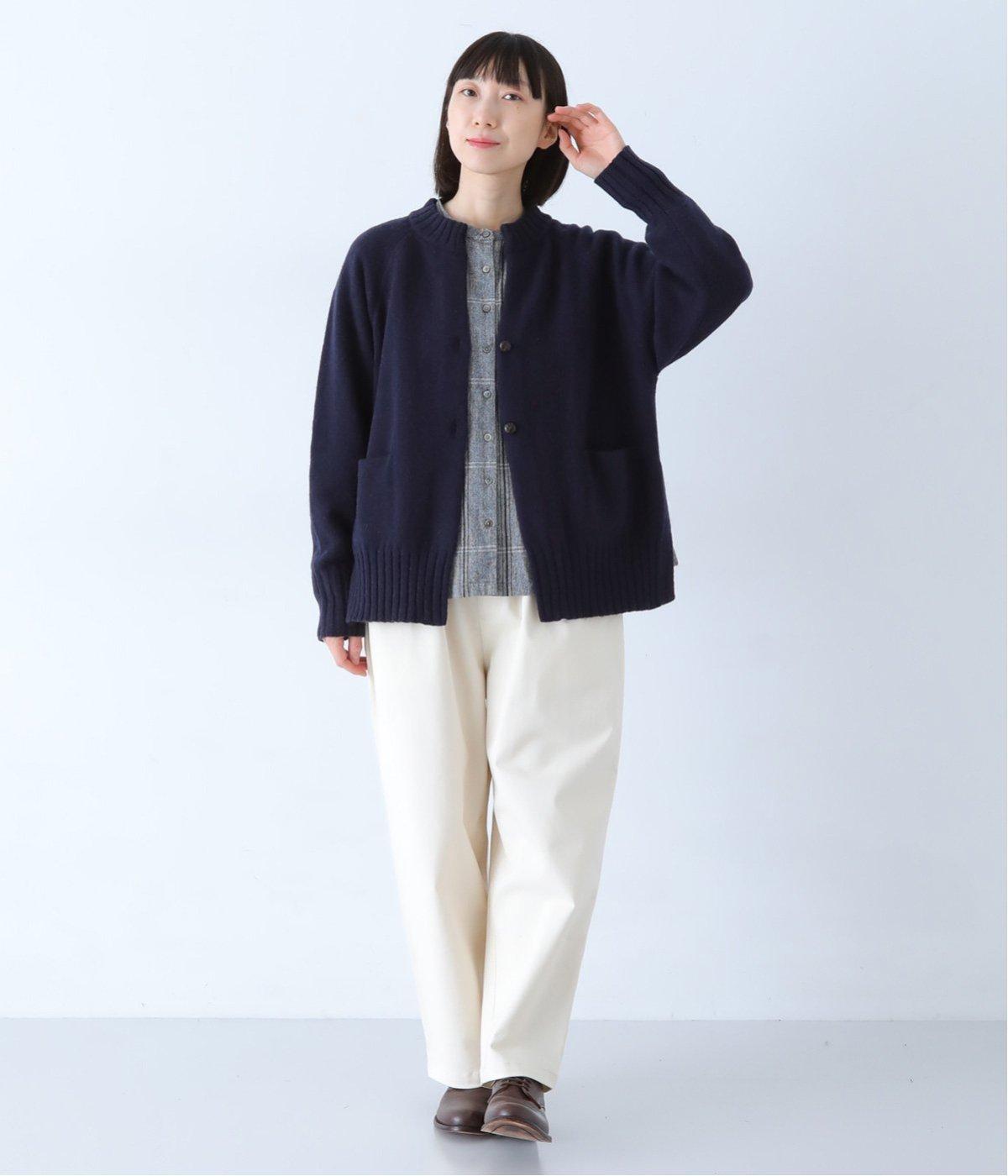 ベーシックで深みのある<ダークネイビー>。チェックシャツとホワイトパンツを合わせた装いは、シンプルなのにどこかニュアンスのある雰囲気。ほどよいコントラストが、ニットを優しく引き立てます。