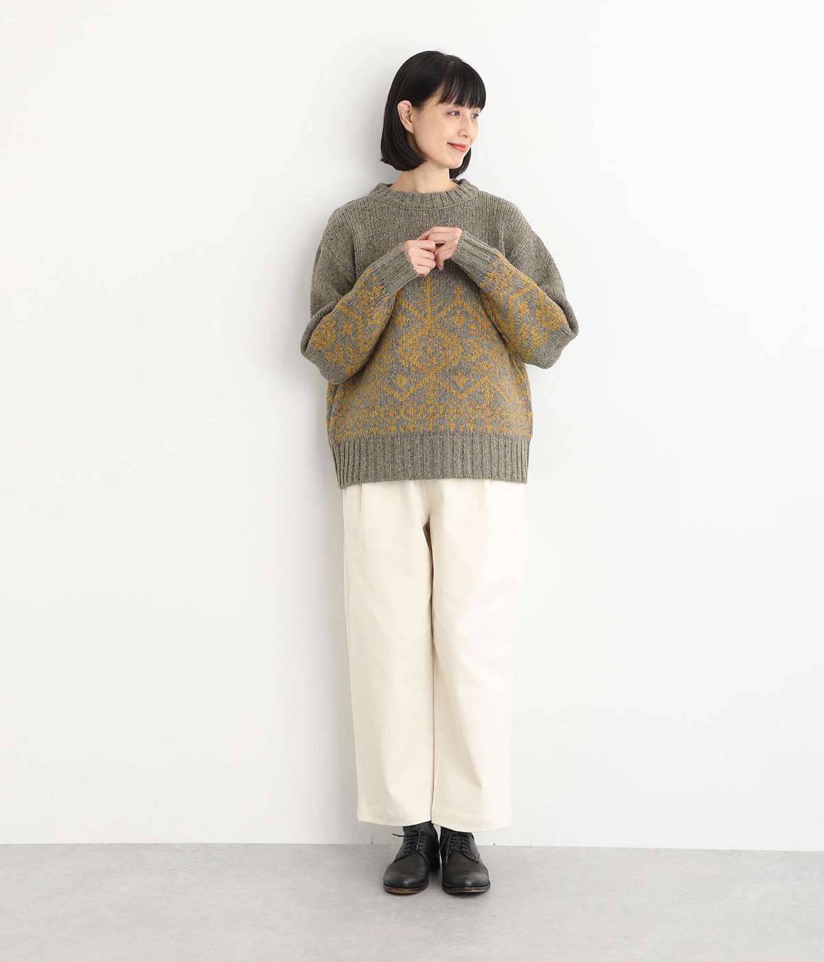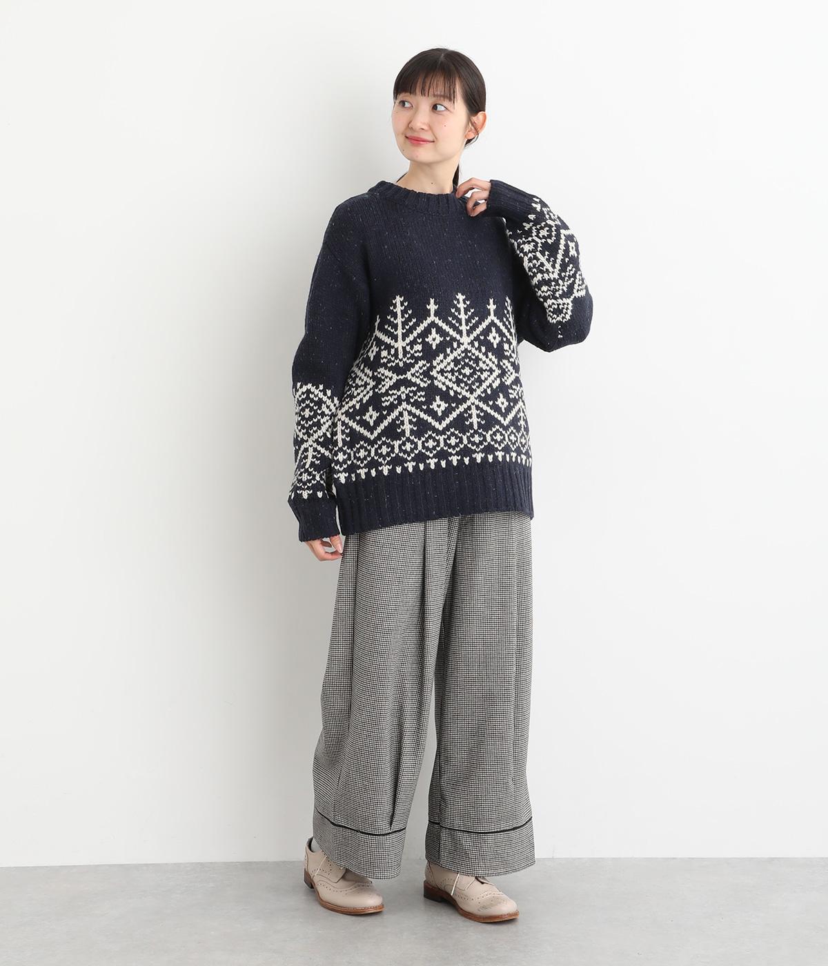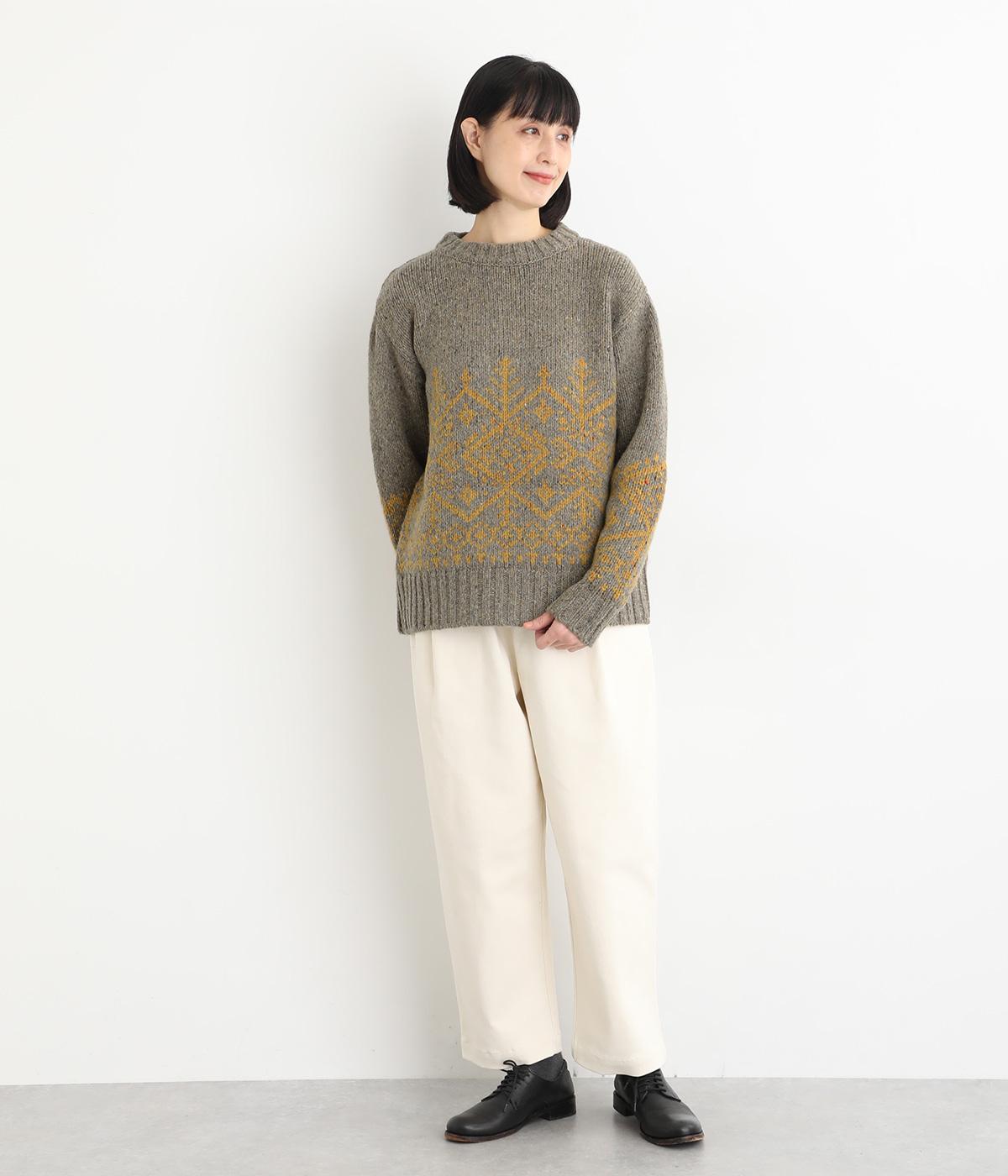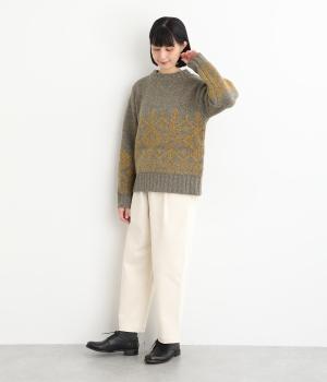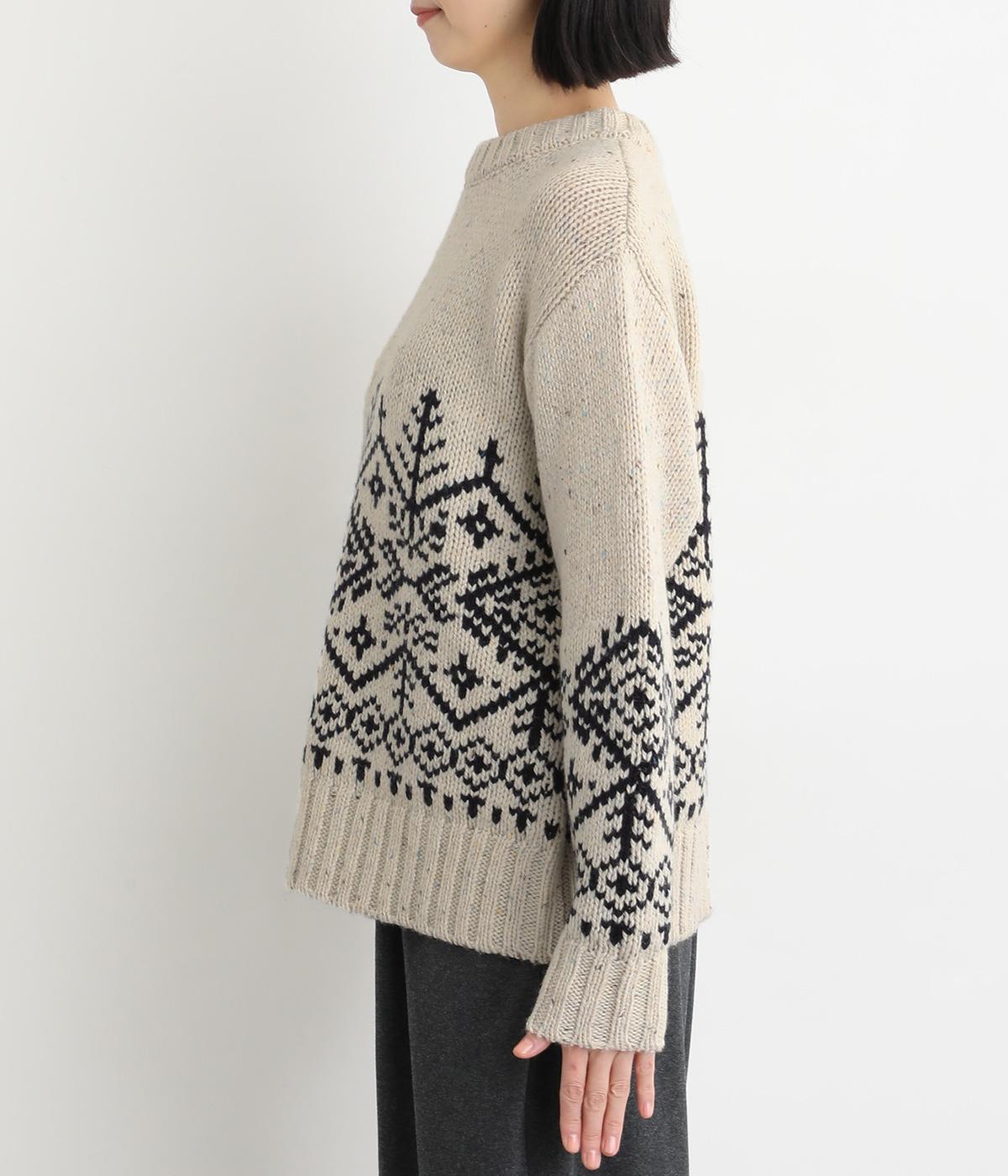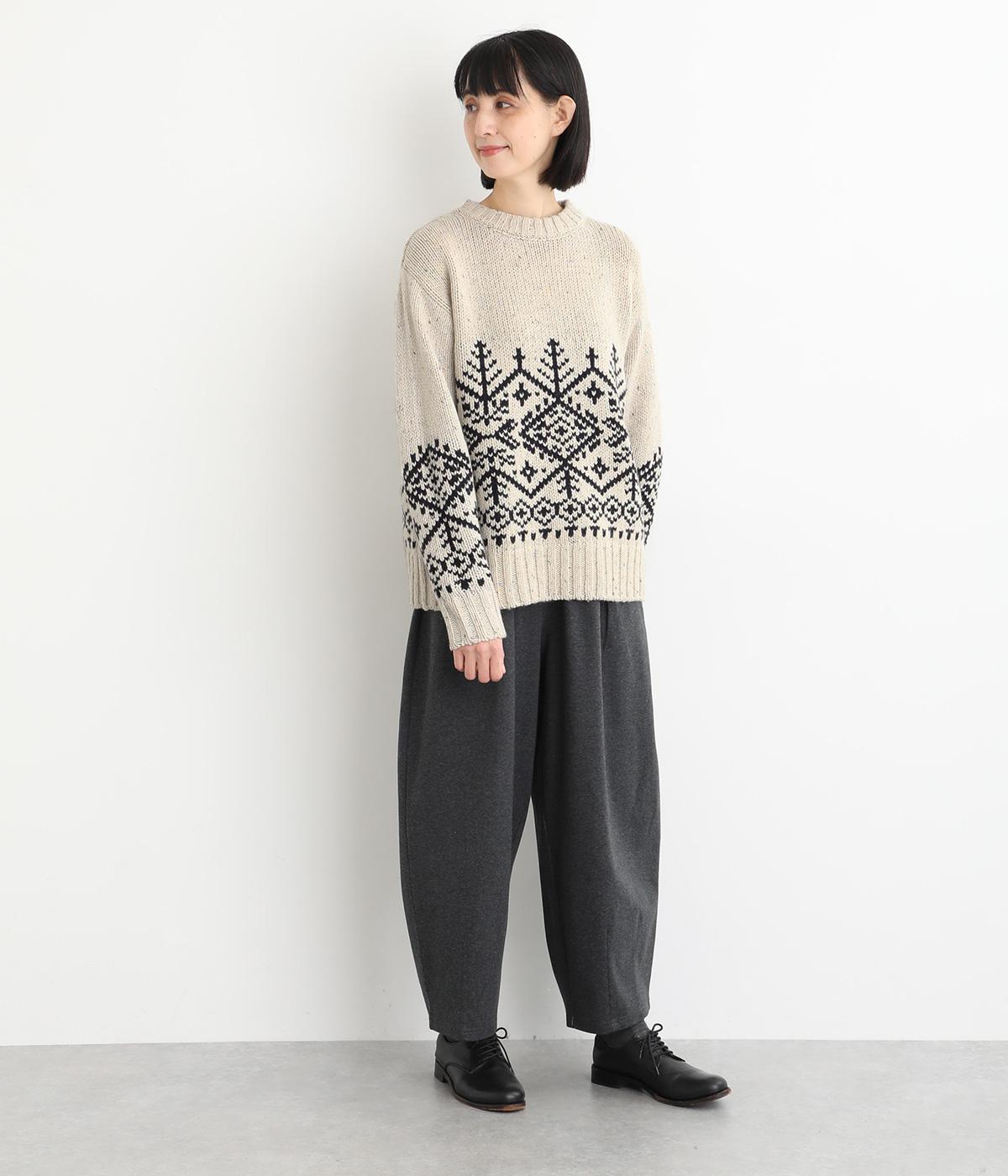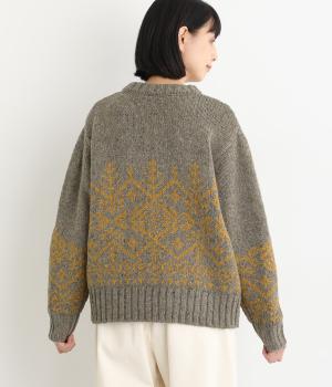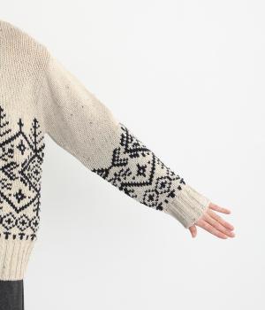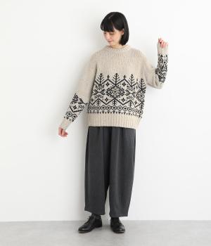 身頃と袖にぐるりと配したジャカード模様が目を引くプルオーバー。ほっこりとした印象になりすぎない、大人の女性にぴったりなデザインに仕上げました。身頃と袖にゆとりを持たせたリラクシーなシルエットも◎です。