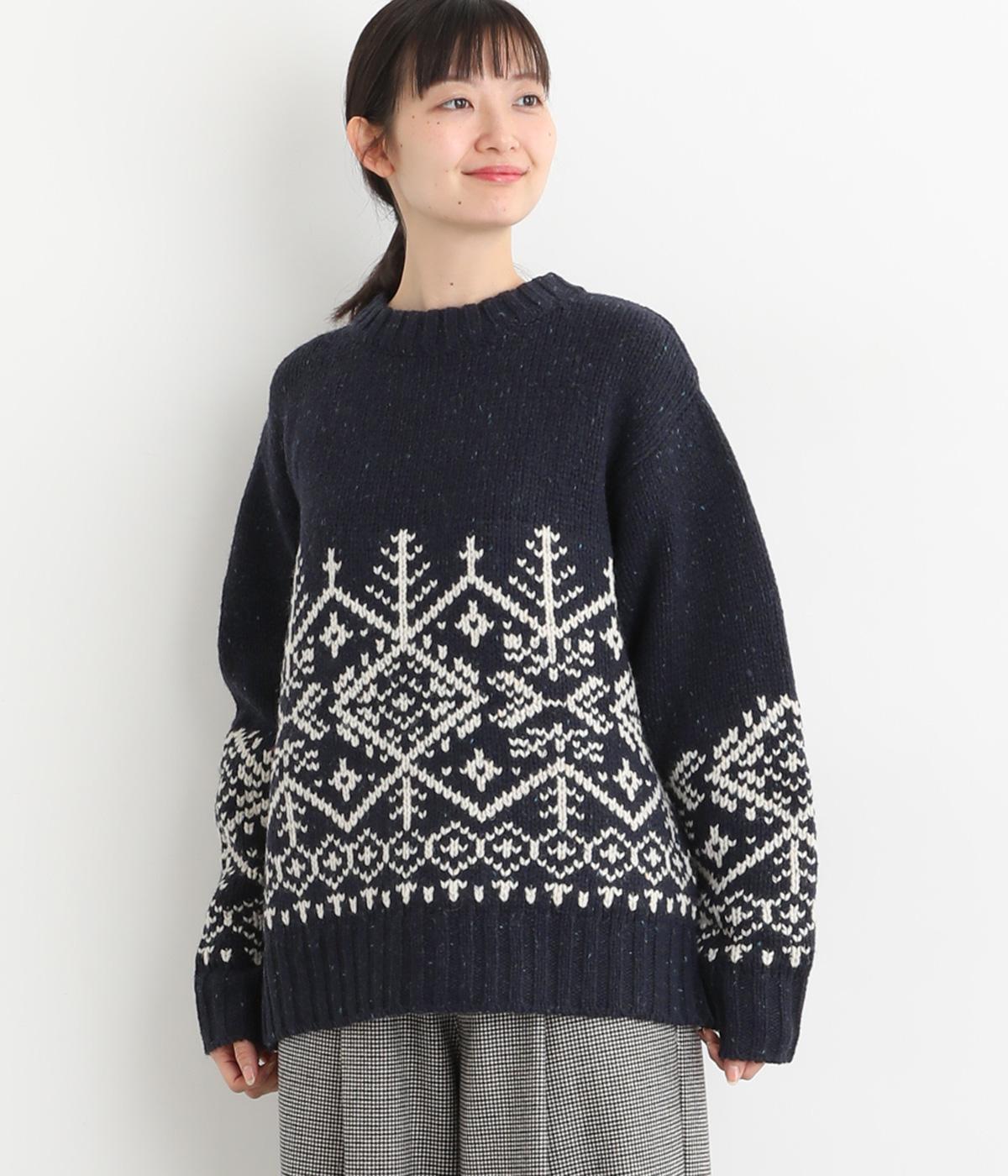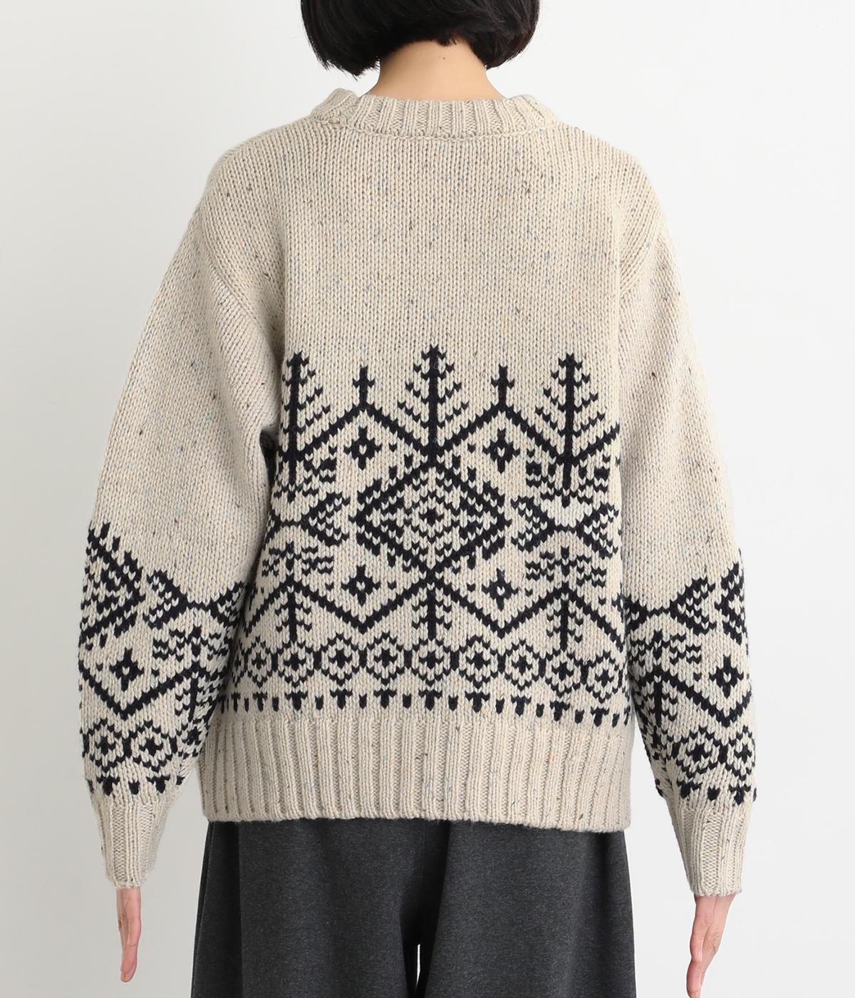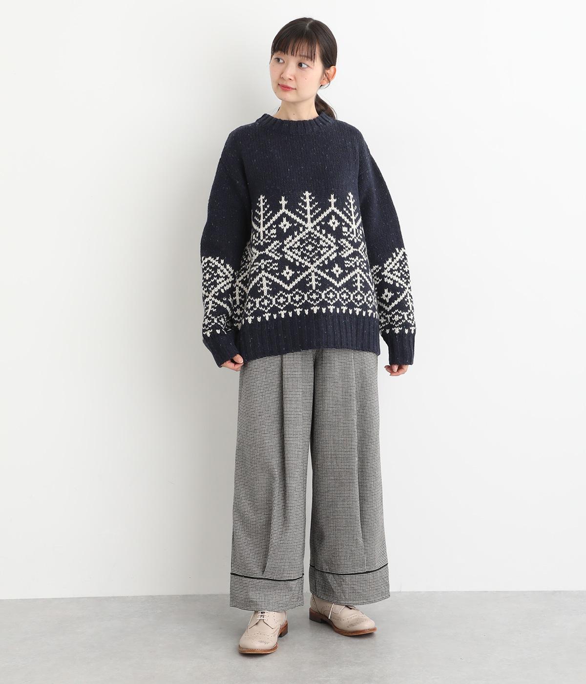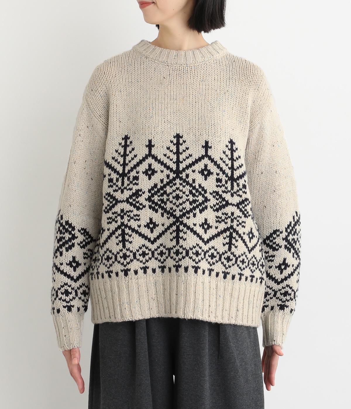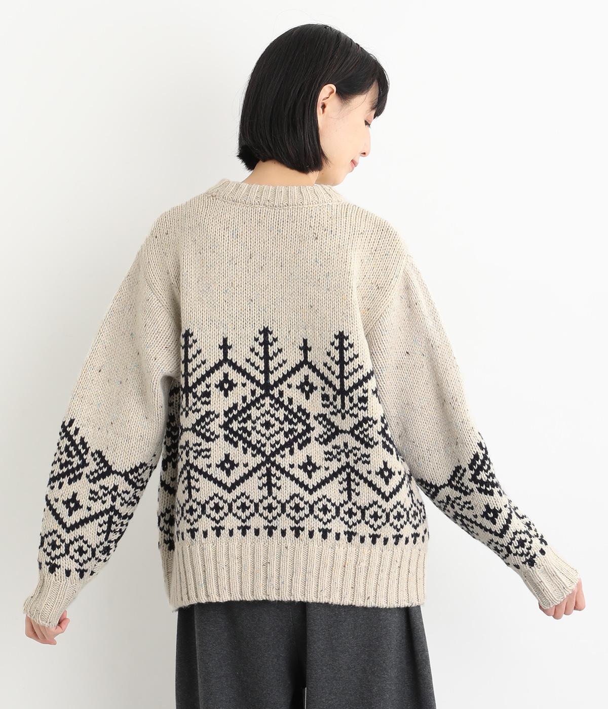 身頃と袖にぐるりと配したジャカード模様が目を引くプルオーバー。ほっこりとした印象になりすぎない、大人の女性にぴったりなデザインに仕上げました。身頃と袖にゆとりを持たせたリラクシーなシルエットも◎です。